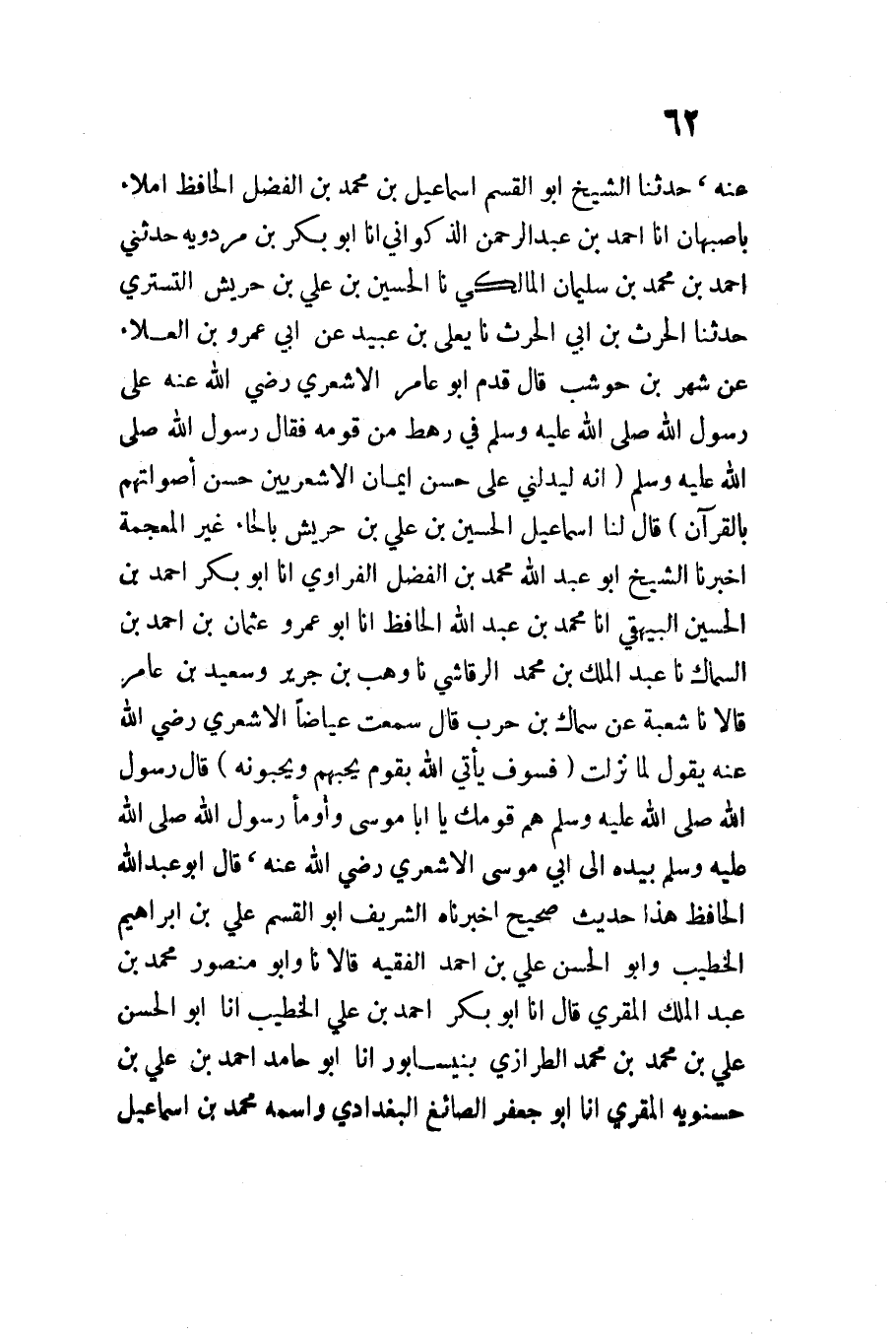 إِنَّهُ لَيَدُلُّنِي عَلَى حُسْنِ إِيمَانِ الأَشْعَرِيِّينَ حُسْنُ أَصْوَاتِهِمْ بِالْقُرْآنِ قَالَ لَنَا إِسْمَاعِيلُ الْحُسَيْنُ بْنُ عَلِيِّ بْنِ حُرَيْشٍ بِالْحَاءِ غَيْرِ الْمُعْجَمَةِ أَخْبَرَنَا الشَّيْخُ أَبُو عَبْدِ اللَّهِ مُحَمَّد بن الْفضل الفراوي انا أَبُو بَكْرٍ أَحْمَدُ بْنُ الْحُسَيْنِ الْبَيْهَقِيّ أَنا مُحَمَّدُ بْنُ عَبْدِ اللَّهِ الْحَافِظُ أَنا أَبُو عَمْرٍو َعُثْمَانُ بْنُ أَحْمَدَ بْنِ السَّمَّاكِ نَا عَبْدُ الْمَلِكِ بْنُ مُحَمَّدٍ الرِّقَاشِيُّ نَا وَهْبُ بْنُ جَرِيرٍ وَسَعِيدُ بْنُ عَامِرٍ قَالا نَا شُعْبَةُ عَنْ سِمَاكِ بْنِ حَرْبٍ قَالَ سَمِعْتُ عِيَاضًا الأَشْعَرِيَّ رَضِيَ اللَّهُ عَنْهُ يَقُولُ لَمَّا نَزَلَتْ {فَسَوْفَ يَأْتِي اللَّهُ بِقوم يُحِبهُمْ وَيُحِبُّونَهُ} قَالَ رَسُولُ اللَّهِ صَلَّى اللَّهُ عَلَيْهِ وَسلم هم قَوْمك ياأبا مُوسَى وَأَوْمَأَ رَسُولُ اللَّهِ صَلَّى اللَّهُ عَلَيْهِ وَسَلَّمَ بِيَدِهِ إِلَى أَبِي مُوسَى الأَشْعَرِيِّ رَضِيَ اللَّهُ عَنْهُ قَالَ أَبُو عَبْدِ اللَّهِ الْحَافِظُ هَذَا حَدِيثٌ صَحِيحٌ أَخْبَرَنَاهُ الشريف أَبُو الْقسم عَلِيُّ بْنُ إِبْرَاهِيمَ الْخَطِيبُ وَأَبُو الْحَسَنِ عَلِيُّ بْنُ أَحْمَدَ الْفَقِيهُ قَالا نَا وَأَبُو مَنْصُورٍ مُحَمَّدُ بن عبد الْملك الْمقري قَالَ أَنا أَبُو بَكْرٍ أَحْمَدُ بْنُ عَلِيٍّ الْخَطِيب أَنا أَبُو الْحَسَنِ عَلِيُّ بْنُ مُحَمَّدِ بن مُحَمَّد الطرازي بنيسابور انا أَبُو حَامِدٍ أَحْمَدُ بْنُ عَلِيِّ حسنويه الْمقري أَنا ابو جَعْفَر الصَّائِغ الْبَغْدَادِيُّ وَاسْمُهُ مُحَمَّدُ بْنُ إِسْمَاعِيلَ