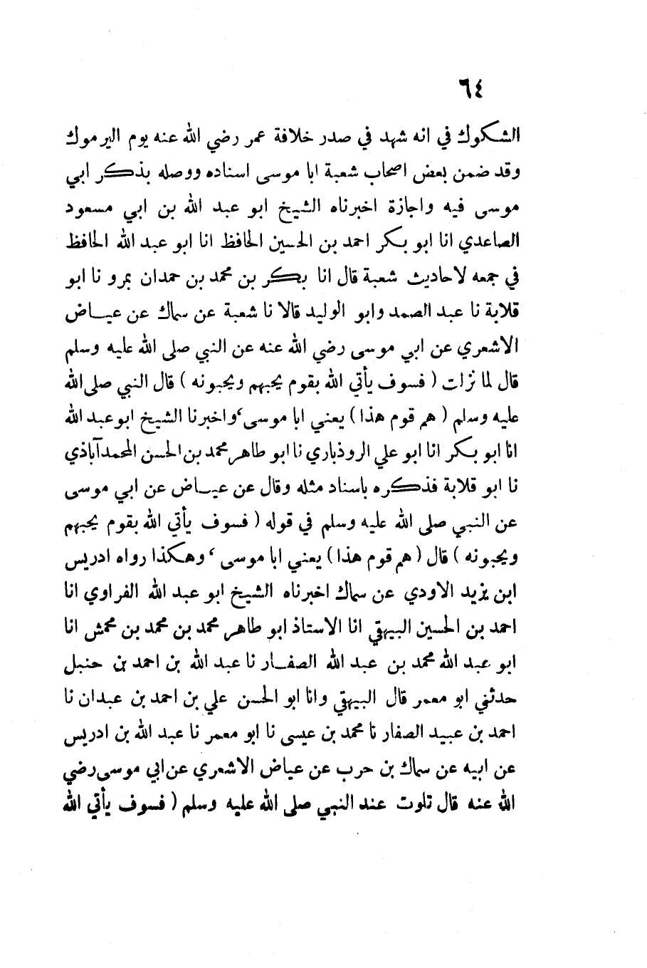الشُّكُوكِ فِي أَنَّهُ شَهِدَ فِي صَدْرِ خِلافَةِ عُمَرَ رَضِيَ اللَّهُ عَنْهُ يَوْمَ الْيَرْمُوكِ وَقَدْ ضَمِنْ بَعْضُ أَصْحَابِ شُعْبَةَ أَبَا مُوسَى إِسْنَادَهُ وَوَصَلَهُ بِذِكْرِ أَبِي مُوسَى فِيهِ وَإِجَازَةً أَخْبَرَنَاهُ الشَّيْخُ أَبُو عبد الله بِي أبي مَسْعُود الصاعدي أَنا أَبُو بَكْرٍ أَحْمَدُ بْنُ الْحُسَيْنِ الْحَافِظ أَنا أَبُو عَبْدِ اللَّهِ الْحَافِظُ فِي جمعه لأحاديث شُعْبَة قَالَ انا بَكْرُ بْنُ مُحَمَّدِ بْنِ حَمْدَانَ بِمَرْوَ نَا أَبُو قِلابَةَ نَا عَبْدُ الصَّمَدِ وَأَبُو الْوَلِيدِ قَالا نَا شُعْبَةُ عَنْ سِمَاكٍ عَنْ عِيَاضٍ الأَشْعَرِيِّ عَنْ أَبِي مُوسَى رَضِيَ اللَّهُ عَنْهُ عَنِ النَّبِيِّ صَلَّى اللَّهُ عَلَيْهِ وَسَلَّمَ قَالَ لَمَّا نَزَلَتْ {فَسَوْفَ يَأْتِي اللَّهُ بِقوم يُحِبهُمْ وَيُحِبُّونَهُ} قَالَ النَّبِيُّ صَلَّى اللَّهُ عَلَيْهِ وَسَلَّمَ