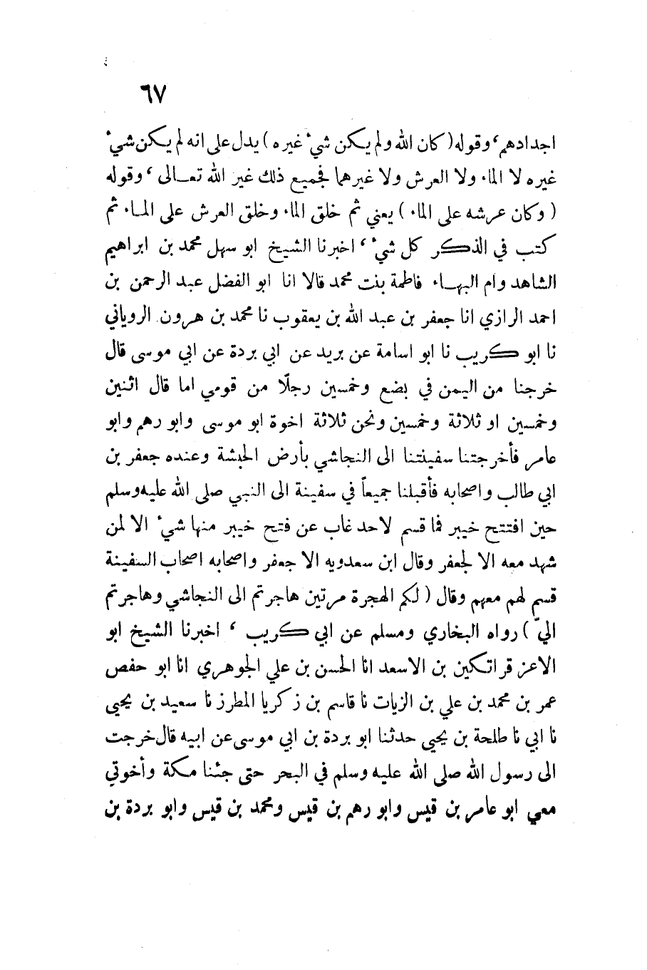 وَكَانَ عَرْشُهُ عَلَى الْمَاءِ يَعْنِي ثُمَّ خَلَقَ الْمَاءَ وَخَلَقَ الْعَرْشَ عَلَى الْمَاءِ ثُمَّ كَتَبَ فِي الذِّكْرِ كُلَّ شَيْءٍ لأخبرنا الشَّيْخُ أَبُو سَهْلٍ مُحَمَّدُ بْنُ إِبْرَاهِيمَ الشَّاهِدُ وَأُمُّ الْبَهَاءِ فَاطِمَةُ بنت مُحَمَّد قَالَا أَنا أَبُو الْفَضْلِ عَبْدُ الرَّحْمَنِ بْنُ أَحْمد الرَّازِيّ أَنا جَعْفَرُ بْنُ عَبْدِ اللَّهِ بْنِ يَعْقُوب نَا مُحَمَّد بن هرون الرُّويَانِيُّ نَا أَبُو كُرَيْبٍ نَا أَبُو أُسَامَةَ عَنْ بُرَيْدٍ عَنْ أَبِي بُرْدَةَ عَنْ أَبِي مُوسَى قَالَ خَرَجْنَا مِنَ الْيَمَنِ فِي بِضْعٍ وَخَمْسِينَ رَجُلا مِنْ قَوْمِي إِمَّا قَالَ اثْنَيْنِ وَخَمْسِينَ أَوْ ثَلاثَةٍ وَخَمْسِينَ وَنَحْنُ ثَلاثَةُ أُخْوَةٍ أَبُو مُوسَى وَأَبُو رُهْمٍ وَأَبُو عَامِرٍ فَأَخْرَجَتْنَا سَفِينَتَنَا إِلَى النَّجَاشِيِّ بِأَرْضِ الْحَبَشَةِ وَعِنْدَهُ جَعْفَرُ بْنُ أَبِي طَالِبٍ وَأَصْحَابُهُ فَأَقْبَلْنَا جَمِيعًا فِي سَفِينَةٍ إِلَى النَّبِيِّ صَلَّى اللَّهُ عَلَيْهِ وَسَلَّمَ حِينَ افْتَتَحَ خَيْبَرَ فَمَا قَسَمَ لأَحَدٍ غَابَ عَنْ فَتْحِ خَيْبَرَ مِنْهَا شَيْءٌ إِلا لِمَنْ شَهِدَ مَعْهُ إِلا لِجَعْفَرٍ وَقَالَ ابْنُ سَعْدَوَيْهِ إِلا جَعْفَرٍ وَأَصْحَابِهِ أَصْحَابِ السَّفِينَةِ قَسَمَ لَهْمُ مَعَهُمْ وَقَالَ