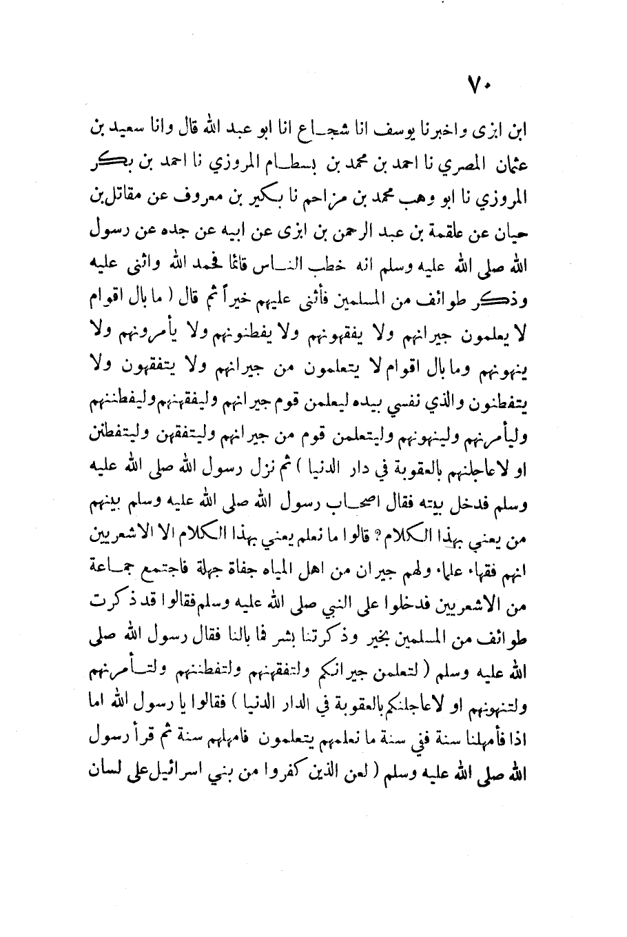مَا بَالُ أَقْوَامٍ لَا يُعَلِّمُونَ جِيرَانَهُمْ وَلا يُفُقِّهُونَهُمْ وَلا يَفُطِّنُونَهُمْ وَلا يأمرونهم وَلَا ينهونهم وَمَا بَال أَقوام لَا يتعلمون من جيرانهم وَلَا يتفقهون وَلَا يَتَفَطَّنُونَ وَالَّذِي نَفْسِي بِيَدِهِ لَيُعَلِّمِنَّ قوم جيرانهم وليفقهنهم وليفطننهم وَلَيَأْمُرَنَّهُمْ وَلَيَنْهَوْنَهُمْ وَلَيَتَعَلَّمَنَّ قَوْمٌ مِنْ جِيرَانِهِمْ وَلَيَتَفَقَّهُنَّ وَلَيَتَفَطَّنُنَّ أَوْ لأُعَاجِلَنَّهُمْ بِالْعُقُوبَةِ فِي دَارِ الدُّنْيَا ثُمَّ نَزَلَ رَسُولُ اللَّهِ صَلَّى اللَّهُ عَلَيْهِ وَسَلَّمَ فَدَخَلَ بَيْتَهُ فَقَالَ أَصْحَابُ رَسُولِ اللَّهِ صَلَّى اللَّهُ عَلَيْهِ وَسَلَّمَ بَيْنَهُمْ مَنْ يَعْنِي بِهَذَا الْكَلامِ قَالُوا مَا نَعْلَمُ يَعْنِي بِهَذَا الْكَلامِ إِلا الأَشْعَرِيِّينَ إِنَّهُمْ فُقَهَاءُ عُلَمَاءُ وَلَهُمْ جِيرَانٌ مِنْ أَهْلِ الْمِيَاهِ جُفَاةٌ جَهَلَةٌ فَاجْتَمَعَ جَمَاعَةٌ مِنَ الأَشْعَرِيِّينَ فَدَخَلُوا عَلَى النَّبِيِّ صَلَّى اللَّهُ عَلَيْهِ وَسَلَّمَ فَقَالُوا قَدْ ذَكَرْتَ طَوَائِفَ مِنَ الْمُسْلِمِينَ بِخَيْرٍ وَذَكَرْتَنَا بِشَرٍّ فَمَا بَالُنَا فَقَالَ رَسُولُ اللَّهِ صَلَّى اللَّهُ عَلَيْهِ وَسَلَّمَ