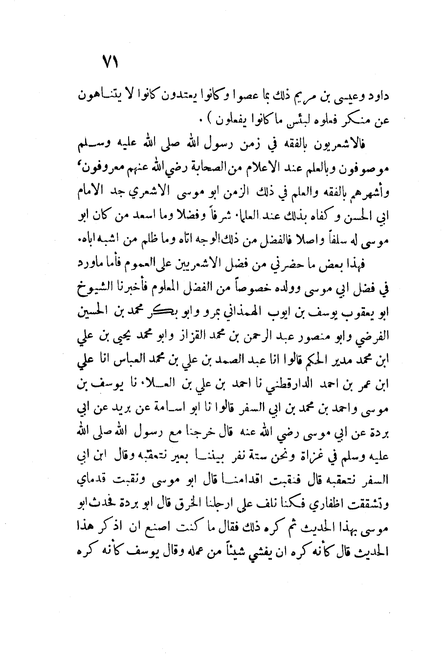 فَهَذَا بَعْضُ مَا حَضَرَنِي مِنْ فَضْلِ الأَشْعَرِيِّينَ عَلَى الْعُمُومِ فَأَمَّا مَا وَرَدَ فِي فَضْلِ أَبِي مُوسَى وَوَلَدِهِ خُصُوصًا مِنَ الْفَضْلِ الْمَعْلُومِ فَأَخْبَرَنَا الشُّيُوخِ أَبُو يَعْقُوبَ يُوسُفُ بْنُ أَيُّوبَ الْهَمَذَانِيُّ بِمَرْوَ وَأَبُو بَكْرٍ مُحَمَّدُ بْنُ الْحُسَيْنِ الْفَرَضِيُّ وَأَبُو مَنْصُورٍ عَبْدُ الرَّحْمَنِ بْنُ مُحَمَّدٍ الْقَزَّازُ وَأَبُو مُحَمَّدٍ يَحْيَى بْنُ عَلِيِّ ابْن مُحَمَّد مدير الحكم قَالُوا انا عَبْدُ الصَّمَدِ بْنُ عَلِيِّ بْنِ مُحَمَّد الْعَبَّاس انا عَليّ ابْن عُمَرَ بْنِ أَحْمَدَ الدَّارَقُطْنِيُّ نَا أَحْمَدُ بْنُ عَلِيِّ بْنِ الْعَلاءِ نَا يُوسُفُ بْنُ مُوسَى وَأَحْمَدُ بْنُ مُحَمَّدِ بْنِ أَبِي السَّفَرِ قَالُوا نَا أَبُو أُسَامَةَ عَنْ بُرَيْدٍ عَنْ أَبِي بُرْدَةَ عَنْ أَبِي مُوسَى رَضِيَ اللَّهُ عَنْهُ قَالَ خَرَجْنَا مَعَ رَسُولِ اللَّهِ صَلَّى اللَّهُ عَلَيْهِ وَسَلَّمَ فِي غَزَاةٍ وَنَحْنُ سِتَّةُ نَفَرٍ بَيْنَنَا بعير نعتقبه وَقَالَ ابْنُ أَبِي السَّفَرِ نَتَعَقَّبُهُ قَالَ فَنُقِبَتْ أَقْدَامُنَا قَالَ أَبُو مُوسَى وَنُقِبَتْ قَدَمَايَ وَتَشَقَّقَتْ أَظْفَارِي فَكُنَّا نَلُفُّ عَلَى أَرْجُلِنَا الْخِرَقَ قَالَ أَبُو بُرْدَةَ فَحَدَّثَ أَبُو مُوسَى بهذ الْحَدِيثِ ثُمَّ كَرِهَ ذَلِكَ فَقَالَ مَا كُنُتُ أَصْنَعُ أَنْ أَذْكُرَ هَذَا الْحَدِيثَ قَالَ كَأَنَّهُ كَرِهَ أَنْ يُفْشِيَ شَيْئًا مِنْ عَمَلِهِ وَقَالَ يُوسُفُ كَأَنَّهُ كَرِهَ