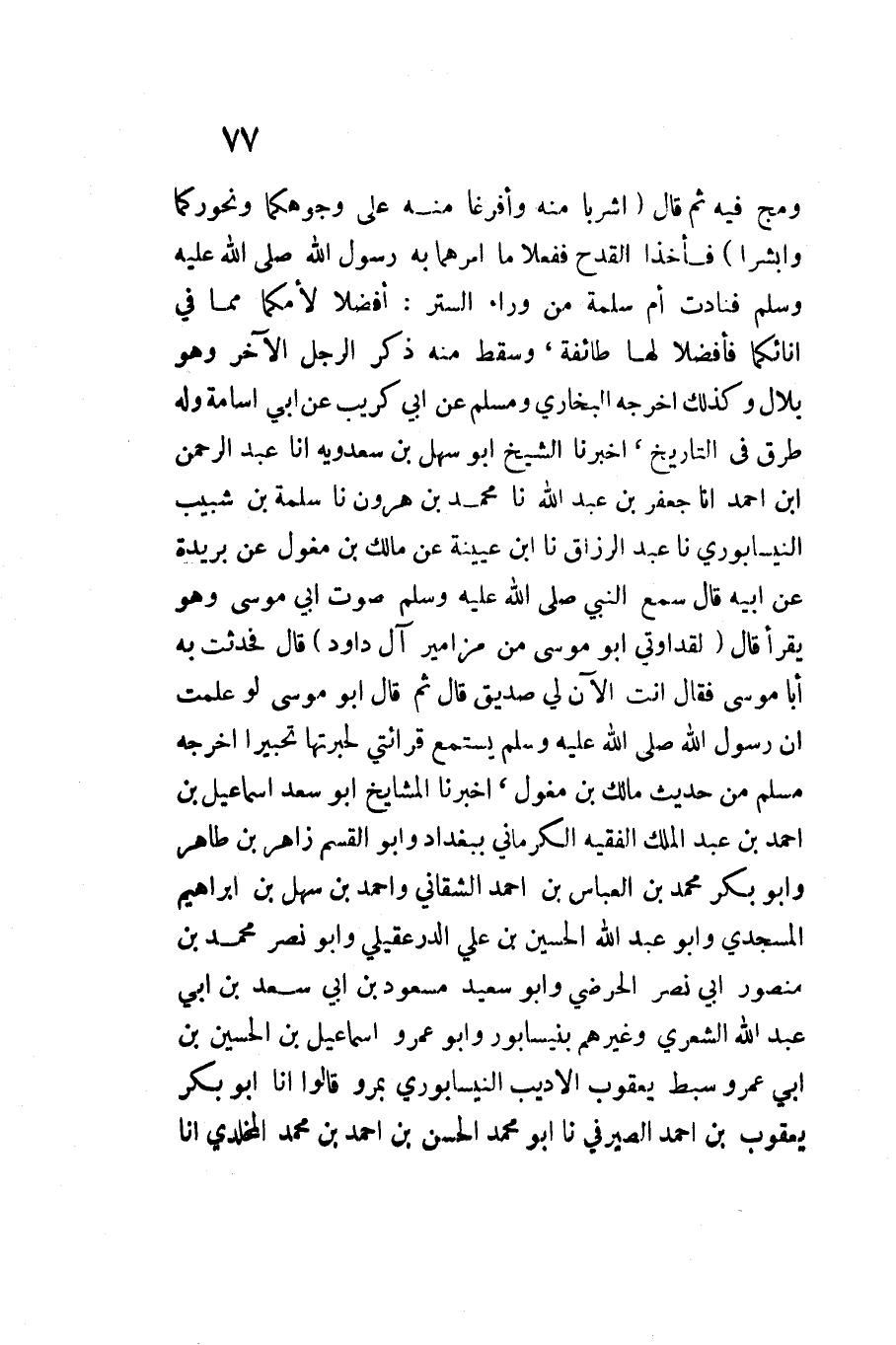 اشْرَبَا مِنْهُ وَأَفْرِغَا مِنْهُ عَلَى وُجُوهِكُمَا وَنُحُورِكُمَا وَأَبْشِرَا فَأَخَذَا الْقَدَحَ فَفَعَلا مَا أَمرهمَا بِهِ رَسُول اللَّه صَلَّى اللَّهُ عَلَيْهِ وَسَلَّمَ فَنَادَتْ أُمُّ سَلَمَةَ مِنْ وَرَاءِ السِّتْرِ أَفْضِلا لأُمِّكُمَا مِمَّا فِي إِنَائِكُمَا فَأَفْضَلا لَهَا طَائِفَةً وَسَقَطَ مِنْهُ ذِكْرُ الرَّجُلِ الآخَرِ وَهُوَ بِلالٌ وَكَذَلِكَ أَخْرَجَهُ الْبُخَارِيُّ وَمُسْلِمٌ عَنْ أَبِي كُريْبٍ عَنْ أَبِي أُسَامَةَ وَلَهُ طُرُقٌ فِي التَّارِيخِ أَخْبَرَنَا الشَّيْخُ أَبُو سهل بن سَعْدَوَيْه أَنا عبد الرَّحْمَن ابْن أَحْمد أَنا جَعْفَرُ بْنُ عَبْدِ اللَّهِ نَا مُحَمَّد بن هرون نَا سَلَمَةُ بْنُ شَبِيبٍ النَّيْسَابُورِيُّ نَا عبد الرَّزَّاق ابْنُ عُيَيْنَةَ عَنْ مَالِكِ بْنِ مغول عَن بُرَيْدَةَ عَنْ أَبِيهِ قَالَ سَمِعَ النَّبِي صَلَّى اللَّهُ عَلَيْهِ وَسَلَّمَ صَوْتَ أَبِي مُوسَى وَهُوَ يَقْرَأُ قَالَ