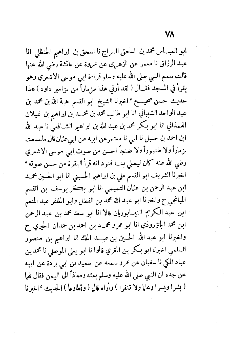 لَقَدْ أُوتِيَ هَذَا مِزْمَارًا مِنْ مَزَامِيرِ دَاوُدَ هَذَا حَدِيثٌ حَسَنٌ صَحِيحٌ أَخْبَرَنَا الشَّيْخُ أَبُو الْقَسْمِ هِبَةُ اللَّهِ بْنُ مُحَمَّدِ بْنِ عَبْدِ الْوَاحِدِ الشَّيْبَانِيُّ أَنا أَبُو طَالِبٍ مُحَمَّدُ بْنُ مُحَمَّدِ بْنِ إِبْرَاهِيمَ بْنِ غِيلانَ الْهَمَذَانِيُّ أَنا أَبُو بَكْرٍ مُحَمَّدُ بْنُ عَبْدِ اللَّهِ بْنِ إِبْرَاهِيمَ الشَّافِعِيُّ نَا عبد الله ابْن أَحْمَدَ بْنِ حَنْبَلٍ نَا أَبِي نَا مُعْتَمِرٌ عَنْ أَبِيهِ عَنْ أَبِي عُثْمَانَ قَالَ مَا سَمِعْتُ مِزْمَارًا وَلا طُنْبُورًا وَلا صِنْجًا أَحْسَنَ مِنْ صَوْتِ أَبِي مُوسَى الأَشْعَرِيِّ رَضِيَ اللَّهُ عَنْهُ كَانَ لَيُصَلِّي بِنَا فَنَوَدُّ أَنَّهُ قَرَأَ الْبَقَرَةَ مِنْ حُسْنِ صَوْتِهِ أَخْبَرَنَا الشريف أَبُو الْقسم عَليّ بن إِبْرَاهِيم الْحُسَيْنِي انا ابو الْحُسَيْن مُحَمَّد ابْن عبد الرَّحْمَن بن مُحَمَّد التميمى أَنا ابو بكر يُوسُف بن الْقسم الميانجي ح وَأَخْبَرَنَا أَبُو عَبْدِ اللَّهِ مُحَمَّدُ بْنُ الْفَضْلِ وَأَبُو الْمُظَفَّرِ عَبْدُ الْمُنعم ابْن عبد الْكَرِيم النيسابوريان قَالَا أَنا أَبُو سَعْدٍ مُحَمَّدُ بْنُ عَبْدِ الرَّحْمَن ابْن مُحَمَّد الجنزرودي انا ابو عمر مُحَمَّدُ بْنُ أَحْمَدَ بْنِ حَمْدَانَ الْحِيرِي ح وَأَخْبَرَنَا أَبُو عَبْدِ اللَّهِ الْحُسَيْنُ بن عبد الْملك أَنا إِبْرَاهِيمُ بْنُ مَنْصُورٍ السُّلَمِيُّ أَخْبَرَنَا أَبُو بكر بن الْمقري قَالُوا نَا أَبُو يَعْلَى الْمَوْصِلِيُّ نَا مُحَمَّدُ بْنُ عَبَّادٍ الْمَكِّيِّ نَا سُفْيَانُ عَنْ عَمْرٍو سَمِعَهُ عَنْ سَعِيدِ بْنِ أَبِي بُرْدَةَ عَنْ أَبِيهِ عَنْ جَدِّهِ أَنّ النَّبِي صَلَّى اللَّهُ عَلَيْهِ وَسَلَّمَ بَعَثَهُ وَمُعَاذًا إِلَى الْيَمَنِ فَقَالَ لَهُمَا