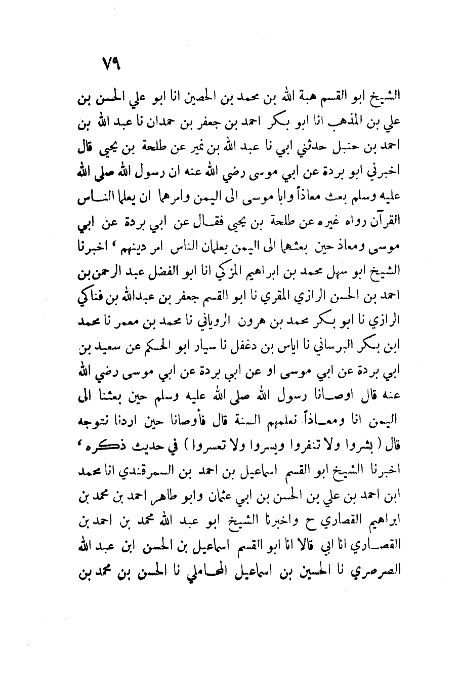الشَّيْخُ أَبُو الْقَسْمِ هِبَةُ اللَّهِ بن مُحَمَّد بن الْحصين أَنا أَبُو عَلِيٍّ الْحَسَنُ بْنُ عَلِيِّ بن الْمَذْهَب أَنا أَبُو بَكْرٍ أَحْمَدُ بْنُ جَعْفَرِ بْنِ حَمْدَانَ نَا عَبْدُ اللَّهِ بْنُ أَحْمَدَ بْنِ حَنْبَلٍ حَدَّثَنِي أَبِي نَا عَبْدُ اللَّهِ بْنُ نُمَيْرٍ عَنْ طَلْحَةَ بْنِ يَحْيَى قَالَ أَخْبَرَنِي أَبُو بُرْدَةَ عَنْ أَبِي مُوسَى رَضِيَ اللَّهُ عَنْهُ أَنّ رَسُولَ اللَّهِ صَلَّى اللَّهُ عَلَيْهِ وَسَلَّمَ بَعَثَ مُعَاذًا وَأَبَا مُوسَى إِلَى الْيَمَنِ وَأَمَرَهُمَا أَنْ يُعَلِّمَا النَّاسَ الْقُرْآنَ رَوَاهُ غَيْرُهُ عَنْ طَلْحَةَ بْنِ يَحْيَى فَقَالَ عَنْ أَبِي بُرْدَةَ عَنْ أَبِي مُوسَى وَمُعَاذٍ حِينَ بَعَثَهُمَا إِلَى الْيَمَنِ يُعَلِّمَانِ النَّاسَ أَمْرَ دِينِهِمْ أَخْبَرَنَا الشَّيْخُ أَبُو سَهْلٍ مُحَمَّدُ بن إِبْرَاهِيم الْمُزَكي أَنا أَبُو الْفَضْلِ عَبْدُ الرَّحْمَنِ بْنُ أَحْمد بن الْحسن الرَّازِيّ الْمقري نَا ابو الْقسم جَعْفَرُ بْنُ عَبْدِ اللَّهِ بْنِ فَنَاكِيٍّ الرَّازِيُّ نَا أَبُو بَكْرٍ مُحَمَّد بن هرون الرُّويَانِيُّ نَا مُحَمَّدُ بْنُ مَعْمَرٍ نَا مُحَمَّد ابْن بَكْرٍ الْبُرْسَانِيُّ نَا إِيَاسُ بْنُ دَغْفَلٍ نَا سَيَّارٌ أَبُو الْحَكَمِ عَنْ سَعِيدِ بْنِ أَبِي بُرْدَةَ عَنْ أَبِي مُوسَى أَوْ عَنْ أَبِي بُرْدَةَ عَنْ أَبِي مُوسَى رَضِيَ اللَّهُ عَنْهُ قَالَ أَوْصَانَا رَسُولُ اللَّهِ صَلَّى اللَّهُ عَلَيْهِ وَسَلَّمَ حِينَ بَعَثَنَا إِلَى الْيَمَنِ أَنَا وَمُعَاذًا نُعَلِّمُهُمُ السُّنَّةَ قَالَ فَأَوْصَانَا حِينَ أَرَدْنَا نَتَوَجَّهُ قَالَ