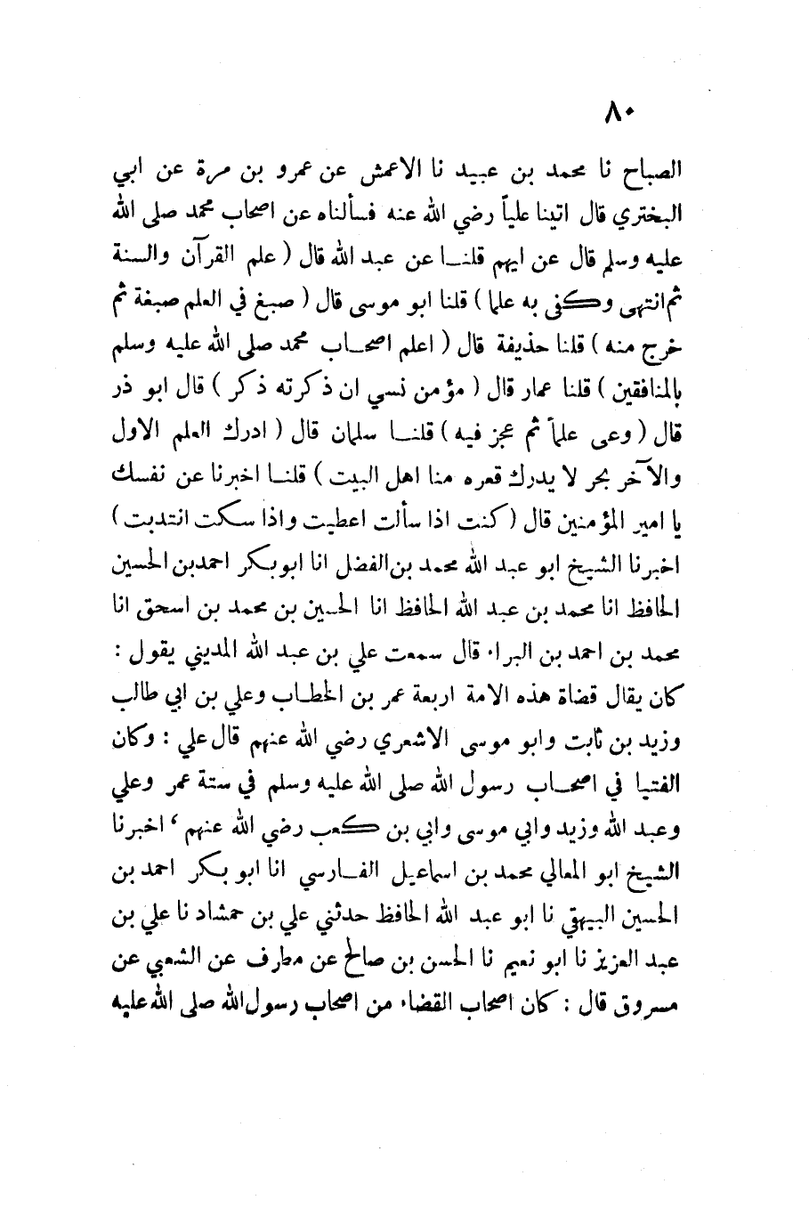 الصَّبَّاحِ نَا مُحَمَّدُ بْنُ عُبَيْدٍ نَا الأَعْمَشُ عَنْ عَمْرِو بْنِ مُرَّةَ عَنْ أَبِي الْبَخْتَرِيِّ قَالَ أَتَيْنَا عَلِيًّا رَضِيَ اللَّهُ عَنْهُ فَسَأَلْنَاهُ عَنْ أَصْحَابِ مُحَمَّدٍ صَلَّى اللَّهُ عَلَيْهِ وَسَلَّمَ قَالَ عَنْ أَيِّهِمْ قُلْنَا عَنْ عَبْدِ اللَّهِ قَالَ