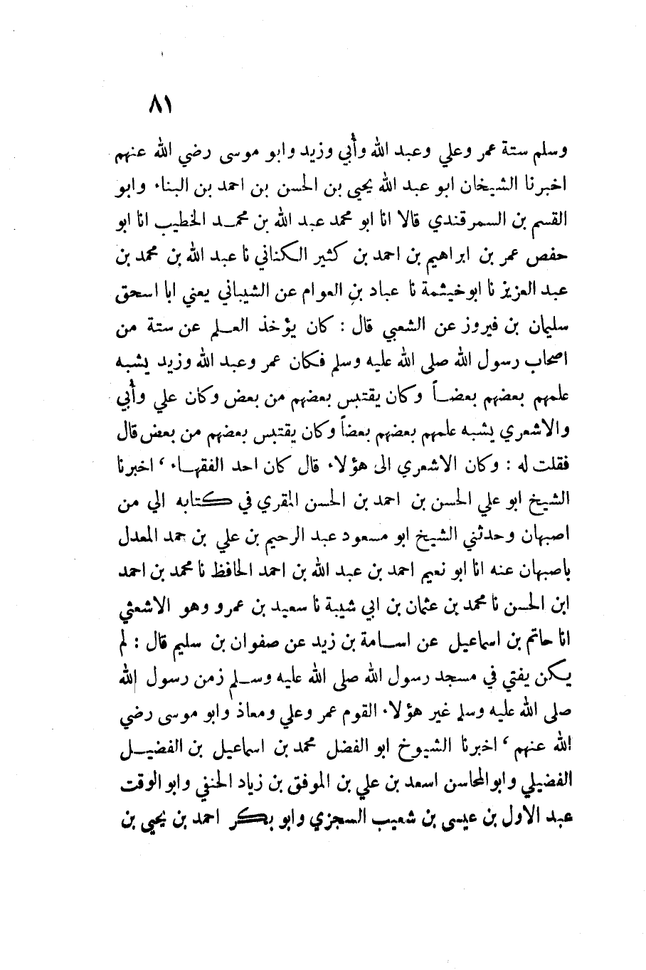 وَسلم سِتَّةٍ عُمَرَ وَعَلِيٍّ وَعَبْدِ اللَّهِ وَأبي زيد وَأَبُو مُوسَى رَضِيَ اللَّهُ عَنْهُم أَخْبَرَنَا الشَّيْخَانِ أَبُو عَبْدِ اللَّهِ يَحْيَى بْنُ الْحَسَنِ بْنِ أَحْمَدَ بن الْبناء وَأَبُو الْقسم بن السَّمرقَنْدِي قَالَا أَنا أَبُو مُحَمَّدٍ عَبْدُ اللَّهِ بْنُ مُحَمَّد الْخَطِيب أَنا أَبُو حَفْصٍ عُمَرُ بْنُ إِبْرَاهِيمَ بْنِ أَحْمَدَ بْنِ كَثِيرٍ الْكِنَانِيُّ نَا عَبْدُ اللَّهِ بْنُ مُحَمَّدِ بْنِ عَبْدِ الْعَزِيزِ نَا أَبُو خَيْثَمَةَ نَا عَبَّادُ بْنُ الْعَوَّامِ عَن الشَّيْبَانِيّ يَعْنِي أَبَا اسحق سُلَيْمَانَ بْنَ فَيْرُوزَ عَنِ الشَّعْبِيِّ قَالَ كَانَ يُؤْخَذُ الْعِلْمُ عَنْ سِتَّةٍ مِنْ أَصْحَابِ رَسُولِ اللَّهِ صَلَّى اللَّهُ عَلَيْهِ وَسَلَّمَ فَكَانَ عُمَرُ وَعَبْدُ اللَّهِ وَزَيْدٌ يُشْبِهُ عِلْمُهُمْ بَعْضَهُمْ بَعْضًا وَكَانَ يَقْتَبِسُ بَعْضُهُمْ مِنْ بَعْضٍ وَكَانَ عَلِيٌّ وَأُبَيٌّ وَالأَشْعَرِيُّ يُشْبِهُ عِلْمُهُمْ بَعْضَهُمْ بَعْضًا وَكَانَ يَقْتَبِسُ بَعْضُهُمْ مِنْ بَعْضٍ قَالَ فَقُلُتْ لَهُ وَكَانَ الأَشْعَرِيُّ إِلَى هَؤُلاءِ قَالَ كَانَ أَحَدَ الْفُقَهَاءِ أَخْبَرَنَا الشَّيْخُ أَبُو عَلِيٍّ الْحَسَنُ بْنُ أَحْمَدَ بْنِ الْحسن الْمقري فِي كِتَابِهِ إِلَيَّ مِنْ أَصْبَهَانَ وَحَدَّثَنِي الشَّيْخُ أَبُو مَسْعُودٍ عَبْدُ الرَّحِيمِ بْنُ عَلِيِّ بْنِ حَمَدٍ الْمعدل بأصبهان عَنهُ انا أَبُو نُعَيْمٍ أَحْمَدُ بْنُ عَبْدِ الله بن أَحْمد الْحَافِظُ نَا مُحَمَّدُ بْنُ أَحْمَدَ ابْن الْحَسَنِ نَا مُحَمَّدُ بْنُ عُثْمَانَ بْنِ أَبِي شَيْبَةَ نَا سَعِيدُ بن عَمْرو وَهُوَ الأشعثي أَنا حَاتِمُ بْنُ إِسْمَاعِيلَ عَنْ أُسَامَةَ بْنِ زَيْدٍ عَنْ صَفْوَانَ بْنِ سُلَيْمٍ قَالَ لَمْ يَكُنْ يُفْتِي فِي مَسْجِدِ رَسُولِ اللَّهِ صَلَّى اللَّهُ عَلَيْهِ وَسَلَّمَ زَمَنَ رَسُولِ اللَّهِ صَلَّى اللَّهُ عَلَيْهِ وَسَلَّمَ غَيْرَ هَؤُلاءِ الْقَوْمِ عُمَرُ وَعَلِيٌّ ومعاذ وَأَبُو مُوسَى رَضِيَ اللَّهُ عَنْهُم أَخْبَرَنَا الشُّيُوخُ أَبُو الْفَضْلِ مُحَمَّدُ بْنُ إِسْمَاعِيلَ بْنِ الْفُضَيْلِ الْفُضَيْلِيُّ وَأَبُو الْمَحَاسِنِ أَسْعَدُ بْنُ عَلِيِّ بْنِ الْمُوَفَّقِ بْنِ زِيَادٍ الْحَنَفِيُّ وَأَبُو الْوَقْتِ عَبْدُ الأَوَّلِ بْنُ عِيسَى بْنِ شُعَيْبٍ السِّجْزِيُّ وَأَبُو بَكْرٍ أَحْمَدُ بْنُ يَحْيَى بْنِ