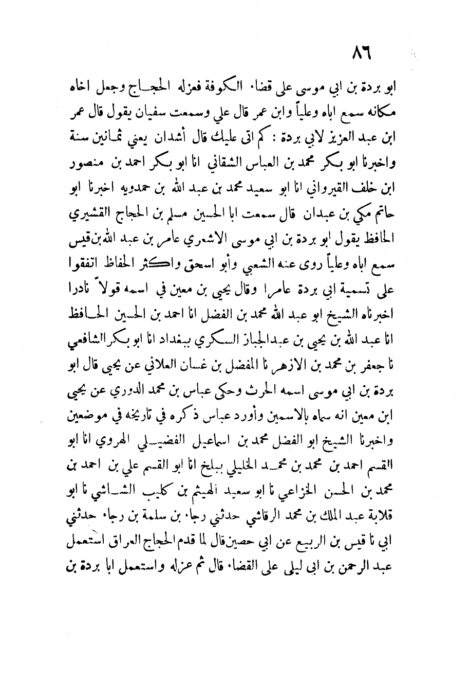 كَمْ أَتَى عَلَيْكَ قَالَ أَشَدَّانَ يَعْنِي ثَمَانِينَ سَنَةٍ وَأَخْبَرَنَا أَبُو بَكْرٍ مُحَمَّد بن الْعَبَّاس الشقان يأنا أَبُو بَكْرٍ أَحْمَدُ بْنُ مَنْصُورِ ابْن خلف القيرواني أَنا أَبُو سَعِيدٍ مُحَمَّدُ بْنُ عَبْدِ اللَّهِ بْنِ حَمْدَوَيْهِ أَخْبَرَنَا أَبُو حَاتِمٍ مَكِّيُّ بْنُ عَبْدَانَ قَالَ سَمِعت أَبَا الْحسن مُسْلِمُ بْنُ الْحَجَّاجِ الْقُشَيْرِيُّ الْحَافِظُ يَقُولُ أَبُو بُرْدَةَ بْنُ أَبِي مُوسَى عَامِرُ بْنُ عَبْدِ اللَّهِ بْنِ قَيْسٍ سمع أَبَاهُ وعليًّا روى عَنهُ الشّعبِيّ وَأَبُو اسحق وَأكْثر الْحفاظ اتَّفقُوا على تَسْمِيَة أَبِي بُرْدَةَ عَامِرًا وَقَالَ يَحْيَى بن معِين فِي اسْمه قولا نَادرا أَخْبَرَنَاهُ الشَّيْخُ أَبُو عَبْدِ الله مُحَمَّد بن الْفضل أَنا أَحْمد بن الْحُسَيْن الْحَافِظ أَنا عَبْدُ اللَّهِ بْنُ يَحْيَى بن عبد الْجَبَّار السكرِي بِبَغْدَاد أَنا أَبُو بَكْرٍ الشَّافِعِيُّ نَا جَعْفَرُ بْنُ مُحَمَّدِ بْنِ الأَزْهَرِ نَا الْمُفَضَّلِ بْنُ غَسَّانَ الْعَلانِيُّ عَنْ يَحْيَى قَالَ أَبُو بُرْدَةَ بْنُ أَبِي مُوسَى اسْمُهُ الْحَرْثُ وَحَكَى عَبَّاسُ بن مُحَمَّد الدوري عَن يحيى ابْن معِين أَنه سَمَّاهُ بالاسمين وَأورد عَبَّاس ذكره فِي تَارِيخه فِي موضِعين وَأَخْبَرَنَا الشَّيْخُ أَبُو الْفَضْلِ مُحَمَّدُ بْنُ إِسْمَاعِيلَ الْفُضَيْلِيُّ الْهَرَوِيُّ أَنا ابو الْقسم أَحْمَدُ بْنُ مُحَمَّدِ بْنِ مُحَمَّدٍ الخليلي ببلخ أَنا ابو الْقسم عَلِيُّ بْنُ أَحْمَدَ بْنِ مُحَمَّدِ بْنِ الْحَسَنِ الْخُزَاعِيُّ نَا أَبُو سَعِيدٍ الْهَيْثَمُ بْنُ كُلَيْبٍ الشَّاشِيُّ نَا أَبُو قِلابَةَ عَبْدُ الْمَلِكِ بْنُ مُحَمَّدٍ الرِّقَاشِيُّ حَدَّثَنِي رَجَاءُ بْنُ سَلَمَةَ بْنِ رَجَاءٍ حَدَّثَنِي أَبِي نَا قَيْسُ بْنُ الرَّبِيعِ عَنْ أَبِي حُصَيْنٍ قَالَ لَمَّا قَدِمَ الْحَجَّاجُ الْعِرَاقَ اسْتَعْمَلَ عَبْدَ الرَّحْمَنِ بْنَ أَبِي لَيْلَى عَلَى الْقَضَاءِ قَالَ ثُمَّ عَزَلَهُ وَاسْتَعَمْلَ أَبَا بُرْدَةَ بْنَ