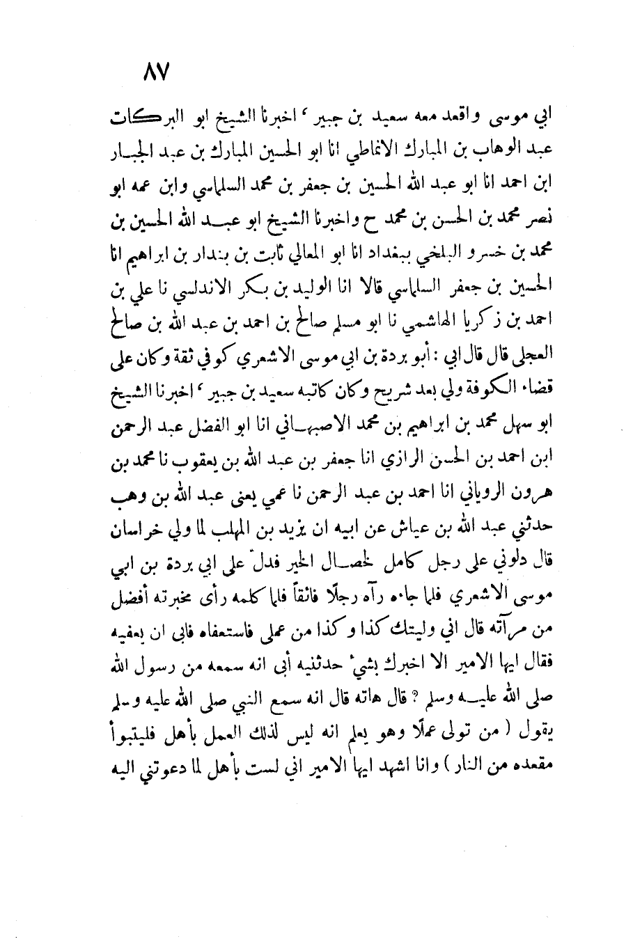 أَبِي مُوسَى وَأَقْعَدَ مَعَهُ سَعِيدَ بْنَ جُبَيْرٍ أَخْبَرَنَا الشَّيْخُ أَبُو الْبَرَكَاتِ عَبْدُ الْوَهَّابِ بْنُ الْمُبَارَكِ الْأنمَاطِي أَنا أَبُو الْحُسَيْنِ الْمُبَارَكُ بْنُ عَبْدِ الْجَبَّار ابْن أَحْمد أَنا أَبُو عَبْدِ اللَّهِ الْحُسَيْنُ بْنُ جَعْفَرِ بْنِ مُحَمَّدٍ السِّلْمَاسِيُّ وَابْنِ عَمِّهِ أَبُو نَصْرٍ مُحَمَّدُ بْنُ الْحسن بن مُحَمَّد ح وَأَخْبَرَنَا الشَّيْخُ أَبُو عَبْدِ اللَّهِ الْحُسَيْنُ بْنُ مُحَمَّدِ بْنِ خَسْرُو الْبَلْخِي بِبَغْدَاد أَنا أَبُو الْمَعَالِي ثَابِتُ بْنُ بُنْدَارِ بن إِبْرَاهِيم أَنا الْحُسَيْنُ بْنُ جَعْفَرٍ السِّلْمَاسِيُّ قَالا أَنا الْوَلِيدُ بْنُ بَكْرٍ الأَنْدَلُسِيُّ نَا عَلِيُّ بْنُ أَحْمَدَ بْنِ زَكَرِيَّا الْهَاشِمِيُّ نَا أَبُو مُسْلِمٍ صَالِحُ بْنُ أَحْمَدَ بْنِ عَبْدِ اللَّهِ بْنِ صَالِحٍ الْعِجْلِيُّ قَالَ قَالَ أَبِي أَبُو بُرْدَةَ بْنُ أَبِي مُوسَى الأَشْعَرِيُّ كُوفِيٌّ ثِقَةٌ وَكَانَ عَلَى قَضَاءِ الْكُوفَةِ وَلِيَ بَعْدَ شُرَيْحٍ وَكَانَ كَاتِبُهُ سَعِيدُ بْنُ جُبَيْرٍ أَخْبَرَنَا الشَّيْخُ أَبُو سَهْلٍ مُحَمَّدُ بْنُ إِبْرَاهِيمَ بْنِ مُحَمَّدِ الْأَصْبَهَانِيّ أَنا ابو الْفضل عبد الرَّحْمَن ابْن أَحْمد بن الْحسن الرَّازِيّ أَنا جَعْفَرُ بْنُ عَبْدِ اللَّهِ بْنِ يَعْقُوب نَا مُحَمَّد بن هرون الرَّوْيَانِيّ أَنا أَحْمَدُ بْنُ عَبْدِ الرَّحْمَنِ نَا عَمِّي يَعْنِي عَبْدَ اللَّهِ بْنَ وَهْبٍ حَدَّثَنِي عَبْدُ اللَّهِ بْنُ عَيَّاشٍ عَنْ أَبِيهِ أَنَّ يَزِيدَ بْنَ الْمُهَلَّبِ لَمَّا وَلِيَ خُرَاسَانَ قَالَ دِلُّونِي عَلَى رَجُلٍ كَامِلٍ لِخَصَالِ الْخَيْرِ فَدُلَّ عَلَى أَبِي بُرْدَةَ بْنِ أَبِي مُوسَى الأَشْعَرِيِّ فَلَمَّا جَاءَهُ رَجُلا فَائِقًا فَلَمَّا كَلَّمَهُ رَأَى مَخْبَرَتَهُ أَفْضَلَ مِنْ مَرْآتِهِ قَالَ إِنِّي وَلَيَّتُكَ كَذَا وَكَذَا مِنْ عَمَلِي فَاسْتَعْفَاهُ فَأَبَى أَنْ يُعْفِيَهُ فَقَالَ أَيُّهَا الأَمِيرُ أَلا أُخْبِرُكَ بِشَيْء حَدثنِي أَبِي أَنَّهُ سَمِعَهُ مِنْ رَسُولِ الله صلى اله عَلَيْهِ وَسَلَّمَ قَالَ هَاتِهِ قَالَ إِنَّهُ سَمِعَ النَّبِيَّ صَلَّى اللَّهُ عَلَيْهِ وَسَلَّمَ يَقُولُ
