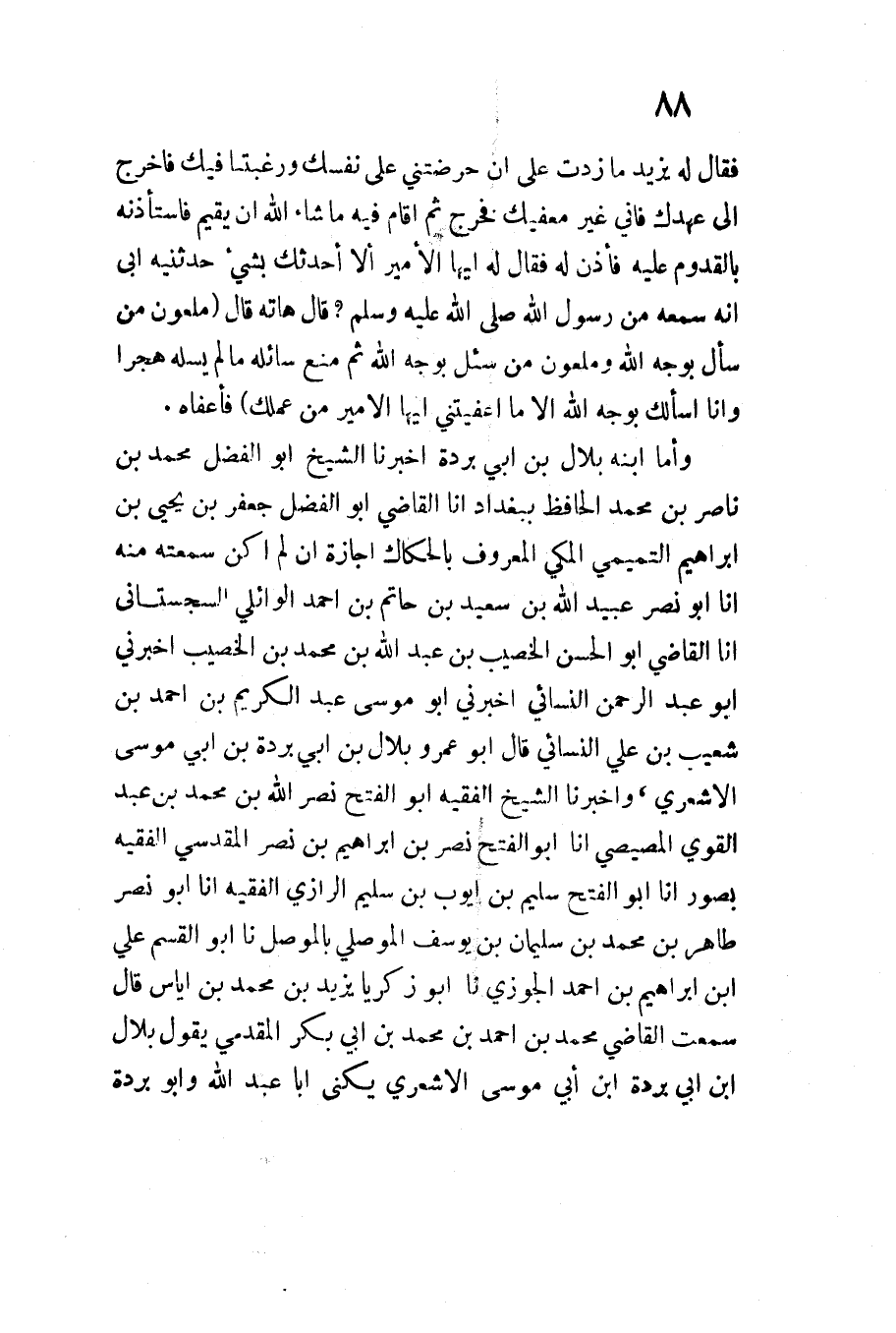 وَأَمَّا ابْنُهُ بِلالُ بْنُ أَبِي بُرْدَةَ أَخْبَرَنَا الشَّيْخُ أَبُو الْفَضْلِ مُحَمَّدُ بْنُ نَاصِرِ بْنِ مُحَمَّدٍ الْحَافِظُ بِبَغْدَاد أَنا الْقَاضِي أَبُو الْفَضْلِ جَعْفَرُ بْنُ يَحْيَى بن إِبْرَاهِيمَ التَّمِيمِيُّ الْمَكِّيُّ الْمَعْرُوفُ بِالْحَكَّاكِ إِجَازَةً أَنْ لَمْ أكن سمعته مِنْهُ أَنا أَبُو نَصْرٍ عُبَيْدُ اللَّهِ بْنُ سَعِيدِ بْنِ حَاتِمِ بْنِ أَحْمَدَ الوائلي السجسْتانِي أَنا الْقَاضِي أَبُو الْحَسَنِ الْخَصِيبُ بْنُ عَبْدُ اللَّهِ بْنُ مُحَمَّدِ بْنِ الْخَطِيب أَخْبَرَنِي أَبُو عَبْدِ الرَّحْمَنِ النَّسَائِيُّ أَخْبَرَنِي أَبُو مُوسَى عَبْدُ الْكَرِيمِ بْنِ أَحْمَدَ بْنِ شُعَيْبِ بْنِ عَليّ النَّسَائِيّ قَالَ أَبُو عمر بِلالِ بْنِ أَبِي بُرْدَةَ بْنِ أَبِي مُوسَى الأَشْعَرِيِّ وَأَخْبَرَنَا الشَّيْخُ الْفَقِيهُ أَبُو الْفَتْحِ نَصْرُ اللَّهِ بْنُ مُحَمَّدِ بْنِ عَبْدِ الْقَوِيِّ المصِّيصِي أَنا أَبُو الْفَتْحِ نَصْرُ بْنُ إِبْرَاهِيمَ بْنِ نَصْرٍ الْمَقْدِسِيُّ الْفَقِيهُ بِصُورٍ أَنا أَبُو الْفَتْحِ سُلَيْمِ بْنُ أَيُّوبَ بن سليم الرَّازِيّ الْفَقِيه أَنا أَبُو نَصْرٍ طَاهِرُ بْنُ مُحَمَّدِ بْنِ سُلَيْمَانَ بْن يُوسُفَ الْمَوْصِلِيُّ بالموصل نَا ابو الْقسم عَليّ ابْن إِبْرَاهِيمَ بن أَحْمَدَ الْجَوْزِيُّ نَا أَبُو زَكَرِيَّا يَزِيدُ بْنُ مُحَمَّدِ بْنِ إِيَاسٍ قَالَ سَمِعْتُ الْقَاضِي مُحَمَّدُ بْنُ أَحْمَدَ بن مُحَمَّدِ بْنِ أَبِي بَكْرٍ الْمُقَدَّمِيَّ يَقُولُ بِلَال ابْن أبي بردة ابْن أَبِي مُوسَى الأَشْعَرِيُّ يُكَنَّى أَبَا عَبْدِ اللَّهِ وَأَبُو بُرْدَةَ