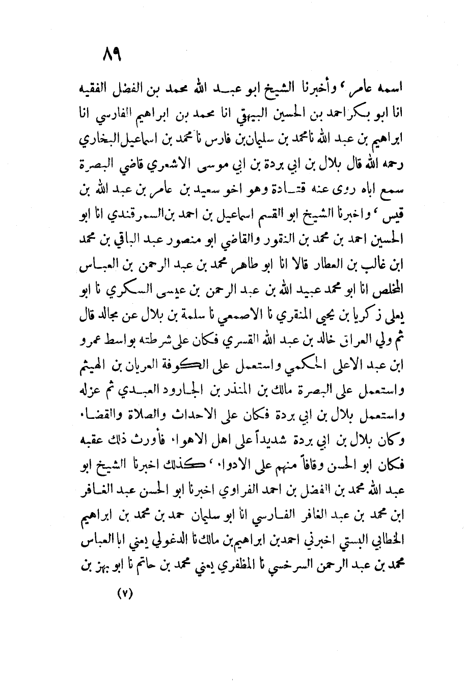 اسْمُهُ عَامِرٌ وَأَخْبَرَنَا الشَّيْخُ أَبُو عَبْدِ اللَّهِ مُحَمَّدُ بْنُ الْفَضْلِ الْفَقِيه أَنا أَبُو بَكْرٍ أَحْمَدُ بْنُ الْحُسَيْنِ الْبَيْهَقِيّ أَنا مُحَمَّد بن إِبْرَاهِيم الْفَارِسِي أَنا إِبْرَاهِيمُ بْنُ عَبْدِ اللَّهِ نَا مُحَمَّدُ بْنُ سُلَيْمَانَ بْنُ فَارِسٍ نَا مُحَمَّدُ بْنُ إِسْمَاعِيلَ الْبُخَارِيُّ رَحِمَهُ اللَّهُ قَالَ بِلالُ بْنُ أَبِي بُرْدَةَ بْنِ أَبِي مُوسَى الأَشْعَرِيُّ قَاضِي الْبَصْرَةِ سَمِعَ أَبَاهُ رَوَى عَنْهُ قَتَادَةُ وَهُوَ أَخُو سَعِيدِ بْنِ عَامِرِ بْنِ عَبْدِ اللَّهِ بْنِ قَيْسٍ وَأَخْبَرَنَا الشَّيْخُ أَبُو الْقسم إِسْمَاعِيلُ بْنُ أَحْمَدَ بْنِ السَّمَرْقَنْدِيِّ أَنا أَبُو الْحُسَيْنِ أَحْمَدُ بْنُ مُحَمَّدِ بْنِ النَّقُّورِ وَالْقَاضِي أَبُو مَنْصُورٍ عبد الْبَاقِي بن مُحَمَّد ابْن غَالب بن الْعَطَّار قَالَا أَنا أَبُو طَاهِرٍ مُحَمَّدُ بْنُ عَبْدِ الرَّحْمَن بن الْعَبَّاس المخلص أَنا أَبُو مُحَمَّدٍ عُبَيْدُ اللَّهِ بْنُ عَبْدِ الرَّحْمَنِ بن عِيسَى السُّكَّرِيُّ نَا أَبُو يَعْلَى زَكَرِيَّا بْنُ يَحْيَى الْمِنْقَرِيُّ نَا الأَصْمَعِيُّ نَا سَلَمَةُ بْنُ بِلالٍ عَنْ مُجَالِدٍ قَالَ ثُمَّ وَلِيَ الْعِرَاقَ خَالِدُ بْنُ عَبْدِ اللَّهِ الْقَسْرِيُّ فَكَانَ على شرطته بواسط عَمْرو ابْن عَبْدِ الأَعْلَى الْحَكَمِيُّ وَاسْتَعْمَلَ عَلَى الْكُوفَةِ الْعُرْيَانَ بْنَ الْهَيْثَمِ وَاسْتَعْمَلَ عَلَى الْبَصْرَةِ مَالِكَ بْنَ الْمُنْذِرِ بْنِ الْجَارُودِ الْعَبْدِيَّ ثُمَّ عَزَلَهُ وَاسْتَعْمَلَ بِلالَ بْنَ أَبِي بُرْدَةَ فَكَانَ عَلَى الأَحْدَاثِ وَالصَّلاةِ وَالْقَضَاءِ وَكَانَ بِلالُ بْنُ أَبِي بُرْدَةَ شَدِيدًا عَلَى أَهْلِ الأَهْوَاءِ فَأَوْرَثَ ذَلِكَ عَقِبَهُ فَكَانَ أَبُو الْحَسَنِ وَقَّافًا مِنْهُمْ عَلَى الأَدْوَاءِ كَذَلِكَ أَخْبَرَنَا الشَّيْخُ أَبُو عَبْدِ اللَّهِ مُحَمَّدُ بْنُ الْفَضْلِ بْنِ أَحْمَدَ الْفُرَاوِيُّ أَخْبَرَنَا أَبُو الْحَسَنِ عَبْدُ الغافر ابْن مُحَمَّدِ بْنِ عَبْدِ الْغَافِرِ الْفَارِسِيُّ أَنا ابو سُلَيْمَان حمد بْنُ مُحَمَّدِ بْنِ إِبْرَاهِيمَ الْخَطَّابِيُّ الْبَسْتِيُّ أَخْبَرَنِي أَحْمَدُ بْنُ إِبْرَاهِيمَ بْنِ مَالِكٍ نَا الدَّغُولِيُّ يَعْنِي أَبَا الْعَبَّاسِ مُحَمَّدُ بْنُ عَبْدِ الرَّحْمَنِ السَّرَخْسِيُّ نَا الْمُظَفَّرِيُّ يَعْنِي مُحَمَّدَ بْنَ حَاتِمٍ نَا أَبُو بَهْزِ بْنُ