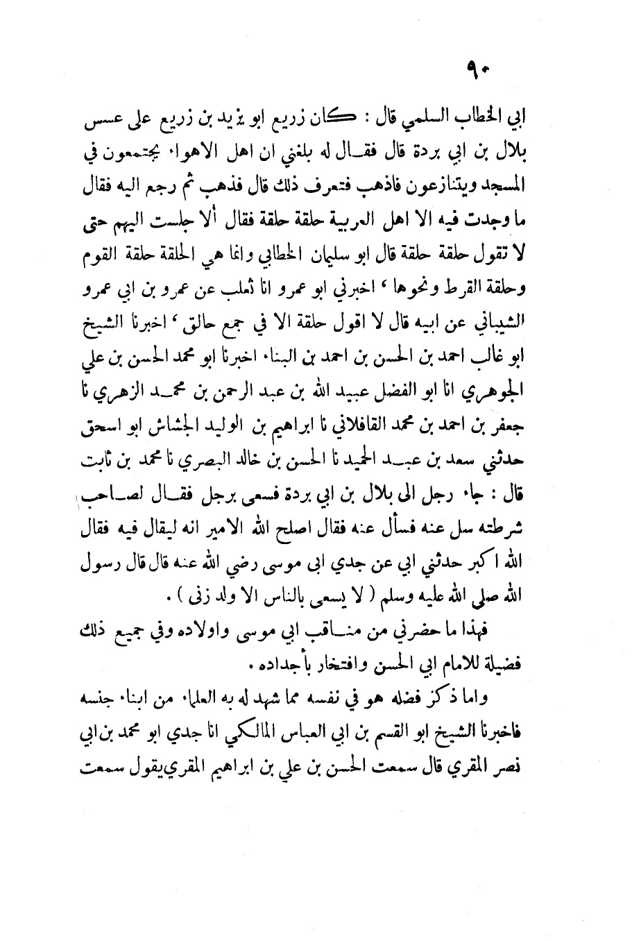 أَبِي الْخَطَّابِ السُّلَمِيُّ قَالَ كَانَ زُرَيْعٌ أَبُو يَزِيدَ بْنِ زُرَيْعٍ عَلَى عَسَسِ بِلالِ بْنِ أَبِي بُرْدَةَ قَالَ فَقَالَ لَهُ بَلَغَنِي أَنَّ أَهْلَ الأَهْوَاءِ يَجْتَمِعُونَ فِي الْمَسْجِدِ وَيَتَنَازَعُونَ فَاذْهَبْ فَتَعَرَّفْ ذَلِكَ قَالَ فَذَهَبَ ثُمَّ رَجَعَ إِلَيْهِ فَقَالَ مَا وَجَدْتُ فِيهِ إِلا أَهْلَ الْعَرَبِيَّةِ حَلَقَةً حَلَقَةً فَقَالَ أَلا جَلَسْتَ إِلَيْهِمْ حَتَّى لَا تَقُولَ حَلَقَةً حَلَقَةً قَالَ أَبُو سُلَيْمَان الْخطابِيّ وَإِنَّمَا هِيَ الْحَلْقَة حَلْقَة الْقَوْم وحَلْقَة القرط وَنَحْوهَا أَخْبرنِي أَبُو عَمْرو أَنا ثَعْلَبُ عَنْ عَمْرِو بْنِ أَبِي عَمْرٍو الشَّيْبَانِيِّ عَنْ أَبِيهِ قَالَ لَا أَقُولُ حَلَقَةً إِلا فِي جَمْعِ حَالِقٍ أَخْبَرَنَا الشَّيْخُ أَبُو غَالب أَحْمد بن الْحَسَنِ بن أَحْمَدَ بْنِ البَنَّاءِ أَخْبَرَنَا أَبُو مُحَمَّدٍ الْحَسَنُ بْنُ عَلِيٍّ الْجَوْهَرِيُّ أَنا أَبُو الْفَضْلِ عُبَيْدُ اللَّهِ بْنُ عَبْدِ الرَّحْمَنِ بْنِ مُحَمَّدٍ الزُّهْرِيُّ نَا جَعْفَرُ بْنُ أَحْمَدَ بْنِ مُحَمَّدٍ القَافِلانِيُّ نَا إِبْرَاهِيمُ بْنُ الْوَلِيد الجشاش أَبُو اسحق حَدَّثَنِي سَعْدُ بْنُ عَبْدِ الْحَمِيدِ نَا الْحَسَنُ بْنُ خَالِدٍ الْبَصْرِيُّ نَا مُحَمَّدُ بْنُ ثَابِتٍ قَالَ جَاءَ رَجُلٌ إِلَى بِلالِ بْنِ أَبِي بُرْدَةَ فَسَعَى بِرَجُلٍ فَقَالَ لِصَاحِبِ شُرْطَتِهِ سَلْ عَنْهُ فَسَأَلَ عَنْهُ فَقَالَ أَصْلَحَ اللَّهُ الأَمِيرَ إِنَّهُ لَيُقَالُ فِيهِ فَقَالَ اللَّهُ أَكْبَرُ حَدَّثَنِي أَبِي عَنْ جَدِّي أَبِي مُوسَى رَضِيَ اللَّهُ عَنْهُ قَالَ قَالَ رَسُولُ اللَّهِ صَلَّى اللَّهُ عَلَيْهِ وَسَلَّمَ
