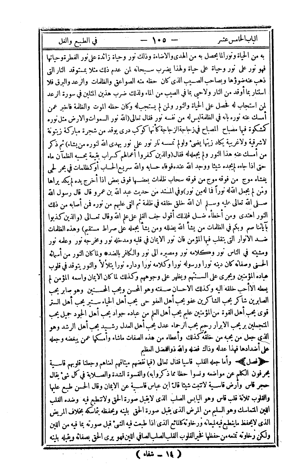 به من الحياة ونورا لما يحصل به من الهدى والإضاءة وذلك نور وحياة زائدة على نور الفطرة وحياتها فهو نور على نور وحياة على حياة ولهذا يضرب سبحانه لمن عدم ذلك مثلا بمستوقد النار التي ذهب عنه ضوؤها وبصاحب الصيب الذي كان حظه منه الصواعق والظلمات والرعد والبرق فلا استنار بما أوقد من النار ولا حيي بما في الصيب من الماء ولذلك ضرب هذين المثلين في سورة الرعد لمن استجاب له فحصل على الحياة والنور ولمن لم يستجب له وكان حظه الموت والظلمة فأخبر عمن أمسك عنه نوره بأنه في الظلمة ليس له من نفسه نور فقال تعالى: {اللَّهُ نُورُ السَّمَاوَاتِ وَالأَرْضِ مَثَلُ نُورِهِ كَمِشْكَاةٍ فِيهَا مِصْبَاحٌ الْمِصْبَاحُ فِي زُجَاجَةٍ الزُّجَاجَةُ كَأَنَّهَا كَوْكَبٌ دُرِّيٌّ يُوقَدُ مِنْ شَجَرَةٍ مُبَارَكَةٍ زَيْتُونَةٍ لا شَرْقِيَّةٍ وَلا غَرْبِيَّةٍ يَكَادُ زَيْتُهَا يُضِيءُ وَلَوْ لَمْ تَمْسَسْهُ نَارٌ نُورٌ عَلَى نُورٍ يَهْدِي اللَّهُ لِنُورِهِ مَنْ يَشَاءُ} ثم ذكر من أمسك عنه هذا النور ولم يجعله له فقال: {وَالَّذِينَ كَفَرُوا أَعْمَالُهُمْ كَسَرَابٍ بِقِيعَةٍ يَحْسَبُهُ الظَّمْآنُ مَاءً حَتَّى إِذَا جَاءَهُ لَمْ يَجِدْهُ شَيْئاً وَوَجَدَ اللَّهَ عِنْدَهُ فَوَفَّاهُ حِسَابَهُ وَاللَّهُ سَرِيعُ الْحِسَاب أَوْ كَظُلُمَاتٍ فِي بَحْرٍ لُجِّيٍّ يَغْشَاهُ مَوْجٌ مِنْ فَوْقِهِ مَوْجٌ مِنْ فَوْقِهِ سَحَابٌ ظُلُمَاتٌ بَعْضُهَا فَوْقَ بَعْضٍ إِذَا أَخْرَجَ يَدَهُ لَمْ يَكَدْ يَرَاهَا وَمَنْ لَمْ يَجْعَلِ اللَّهُ لَهُ نُوراً فَمَا لَهُ مِنْ نُورٍ} وفي المسند من حديث عبد الله بن عمرو قال قال رسول الله صلى الله عليه وسلم أن الله خلق خلقه في ظلمة ثم ألقى عليهم من نوره فمن أصابه من ذلك النور اهتدى ومن أخطأه ضل فلذلك أقول جف القلم على علم الله وقال تعالى: {وَالَّذِينَ كَذَّبُوا بِآيَاتِنَا صُمٌّ وَبُكْمٌ فِي الظُّلُمَاتِ مَنْ يَشَأِ اللَّهُ يُضْلِلْهُ وَمَنْ يَشَأْ يَجْعَلْهُ عَلَى صِرَاطٍ مُسْتَقِيمٍ} وهذه الظلمات ضد الأنوار التي يتقلب فيها المؤمن فإن نور الإيمان في قلبه ومدخله نور ومخرجه نور وعلمه نور ومشيته من الناس نور وكلامه نور ومصيره إلى نور والكافر بالضد، ولما كان النور من أسمائه الحسنى وصفاته كان دينه نورا ورسوله نورا وكلامه نورا وداره نورا يتلألأ والنور يتوقد في قلوب عباده المؤمنين ويجري على ألسنتهم ويظهر على وجوههم وكذلك لما كان الإيمان واسمه المؤمن لم يعطه إلا أحب خلقه إليه وكذلك الإحسان صفته وهو المحسن ويحب المحسنين وهو صابر يحب الصابرين شاكر يحب الشاكرين عفو يحب أهل العفو حي يحب أهل الحياء ستير يحب أهل الستر قوى يحب أهل القوة من المؤمنين عليم يحب أهل العلم من عباده جواد يحب أهل الجود جميل يحب المتجملين بر يحب الأبرار رحيم يحب الرحماء عدل يحب أهل العدل رشيد يحب أهل الرشد وهو الذي جعل من يحبه من خلقه كذلك وأعطاه من هذه الصفات ما شاء وأمسكها عمن يبغضه وجعله على أضدادها فهذا عدله وذاك فضله والله ذو الفضل العظيم.
