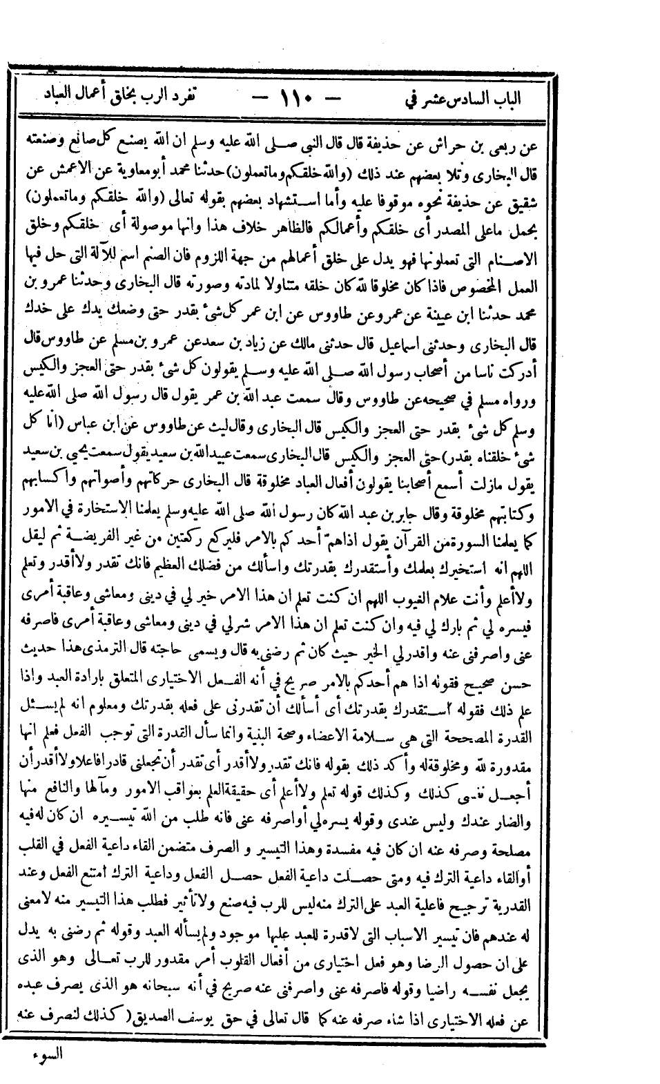 عن ربعي بن حراش عن حذيفة قال قال النبي صلى الله عليه وسلم: "إن الله يصنع كل صانع وصنعته" قال البخاري: "وتلا بعضهم عند ذلك: {وَاللَّهُ خَلَقَكُمْ وَمَا تَعْمَلُونَ} " حدثنا محمد أبو معاوية عن الأعمش عن شقيق عن حذيفة نحوه موقوفا عليه وأما استشهاد بعضهم بقوله تعالى: {وَاللَّهُ خَلَقَكُمْ وَمَا تَعْمَلُونَ} بحمل ما على المصدر أي خلقكم وأعمالكم فالظاهر خلاف هذا وأنها موصولة أي خلقكم وخلق الأصنام التي تعملونها فهو يدل على خلق أعمالهم من جهة اللزوم فإن الصنم اسم للآلة التي حل فيها العمل المخصوص فإذا كان مخلوقا لله كان خلقه متناولا لمادته وصورته قال البخاري: وحدثنا عمرو بن محمد حدثنا ابن عيينة عن عمرو عن طاووس عن ابن عمر: "كل شيء بقدر حتى وضعك يدك على خدك" قال البخاري: وحدثني إسماعيل قال حدثني مالك عن زياد بن سعد عن عمرو بن مسلم عن طاووس قال: "أدركت ناسا من أصحاب رسول الله صلى الله عليه وسلم يقولون كل شيء بقدر حتى العجز والكيس" ورواه مسلم في صحيحه عن طاووس وقال سمعت عبد الله بن عمر يقول: قال رسول الله صلى الله عليه وسلم: "كل شيء بقدر حتى العجز والكيس" قال البخاري: وقال ليث عن طاووس عن ابن عباس ": {إِنَّا كُلَّ شَيْءٍ خَلَقْنَاهُ بِقَدَرٍ} حتى العجز والكيس" قال البخاري: سمعت عبيد الله بن سعيد يقول سمعت يحيى بن سعيد يقول: "ما زلت أسمع أصحابنا يقولون أفعال العباد مخلوقة" قال البخاري: "حركاتهم وأصواتهم وأكسابهم وكتابتهم مخلوقة" وقال جابر بن عبد الله: "كان رسول الله صلى الله عليه وسلم يعلمنا الاستخارة في الأمور كما يعلمنا السورة من القرآن يقول: إذا هم أحدكم بالأمر فليركع ركعتين من غير الفريضة ثم ليقل اللهم إني أستخيرك بعلمك وأستقدرك بقدرتك وأسألك من فضلك العظيم فإنك تقدر ولا أقدر وتعلم ولا أعلم وأنت علام الغيوب اللهم إن كنت تعلم أن هذا الأمر خير لي في ديني ومعاشي وعاقبة أمري فيسره لي ثم بارك لي فيه وإن كنت تعلم أن هذا الأمر شر لي في ديني ومعاشي وعاقبة أمري فاصرفه عني واصرفني عنه واقدر لي الخير حيث كان ثم رضني به قال: ويسمى حاجته" قال الترمذي هذا حديث حسن صحيح فقوله: "إذا هم أحدكم بالأمر" صريح في أنه الفعل الاختياري المتعلق بإرادة العبد وإذا علم ذلك فقوله "أستقدرك بقدرتك" أي أسألك أن تقدرني على فعله بقدرتك ومعلوم أنه لم يسأل القدرة المصححة التي هي سلامة الأعضاء وصحة البنية وإنما سأل القدرة التي توجب الفعل فعلم أنها مقدورة لله ومخلوقة له وأكد ذلك بقوله: "فإنك تقدر ولا أقدر" أي تقدر أن تجعلني قادرا فاعلا ولا أقدر أن أجعل نفسي كذلك وكذلك قوله: "تعلم ولا أعلم" أي حقيقة العلم بعواقب الأمور ومآلها والنافع منها والضار عندك وليس عندي وقوله يسره لي أو اصرفه عني فإنه طلب من الله تيسيره إن كان له فيه مصلحة وصرفه عنه إن كان فيه مفسدة وهذا التيسير والصرف متضمن إلقاء داعية الفعل في القلب أو إلقاء داعية الترك فيه ومتى حصلت داعية الفعل حصل الفعل وداعية الترك امتنع الفعل وعند القدرية ترجيح فاعلية العبد على الترك منه ليس للرب فيه صنع ولا تأثير فطلب هذ التيسير منه لا معنى له عندهم فإن تيسير الأسباب التي لا قدرة للعبد عليها موجود ولم يسأله العبد وقوله: "ثم رضني به" يدل على أن حصول الرضا وهو فعل اختياري من أفعال القلوب أمر وقدور للرب تعالى وهو الذي يجعل نفسه راضيا وقوله: "فاصرفه عني واصرفني عنه" صريح في أنه سبحانه هو الذي يصرف عبده عن فعله الاختياري إذا شاء صرفه عنه كما قال تعالى في حق يوسف الصديق: {كَذَلِكَ لِنَصْرِفَ عَنْهُ