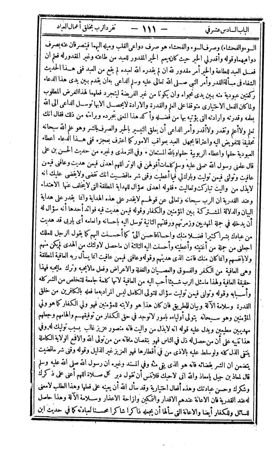 السُّوءَ وَالْفَحْشَاء} وصرف السوء والفحشاء هو صرف دواعي القلب وميله إليهما فينصرفان عنه بصرف دواعيهما وقوله "وأقدر لي الخير حيث كان" يعم الخير المقدور للعبد من طاعته وغير المقدور له فعلم أن فعل العبد للطاعة والخير أمر مقدور لله إن لم يقدره الله لعبده لم يقع من العبد ففي هذا الحديث الشفاء في مسألة القدر وأمر النبي صلى الله عليه وسلم الداعي به أن يقدم بين يدي هذا الدعاء ركعتين عبودية منه بين يدي نجواه وإن يكونا من غير الفريضة ليتجرد فعلهما لهذا الغرض المطلوب ولما كان الفعل الاختياري متوقفا على العلم والقدرة والإرادة لا يحصل إلا بها توسل الداعي إلى الله بعلمه وقدرته وإرادته التي يؤتيه بها من فضله وأكد هذا المعنى بتجرده وبراءته من ذلك فقال "إنك تعلم ولا أعلم وتقدر ولا أقدر" وأمر الداعي أن يعلق التيسير بالخير والصرف بالشر وهو علم الله سبحانه تحقيقا للتفويض إليه واعترافا بجهل العبد بعواقب الأمور كما اعترف بعجزه ففي هذا الدعاء إعطاء العبودية حقها وإعطاء الربوبية حقها وبالله المستعان، وفي الترمذي وغيره من حديث الحسن بن علي قال: "علمني رسول الله صلى الله عليه وسلم كلمات أقولهن في الوتر اللهم اهدني فيمن هديت وعافني فيمن عافيت وتولني فيمن توليت وبارك لي فيما أعطيت وقني شر ما قضيت إنك تقضي ولا يقضى عليك إنه لا يذل من واليت تباركت وتعاليت" فقوله: "اهدني" سؤال للهداية المطلقة التي لا يتخلف عنها الاهتداء وعند القدرية أن الرب سبحانه وتعالى عن قولهم لا يقدر علة هذه الهداية وإنما يقدر على هداية البيان والدلالة المشتركة بين المؤمنين والكفار وقوله "فيمن هديت" فيه فوائد أحدها: أنه سؤال له أن يدخله في جملة المهديين وزمرتهم ورفقتهم الثانية: توسل إليه بإحسانه وإنعامه أي يا ربي قد هديت من عبادك بشرا كثيرا فضلا منك وإحسانا فأحسن إليّ كما أحسنت إليهم كما يقول الرجل للملك اجعلني من جملة من أغنيته وأعطيته وأحسنت إليه الثالثة: إن ما حصل لأولئك من الهدى لم يكن منهم ولا بأنفسهم وإنما كان منك فأنت الذي هديتهم وقوله "وعافني فيمن عافيت" إنما يسأل ربه العافية المطلقة وهي العافية من الكفر والفسوق والعصيان والغفلة والإعراض وفعل ما لا يحبه وترك ما يحبه فهذا حقيقة العافية ولهذا ما سئل الرب شيئا أحب إليه من العافية لأنها كلمة جامعة للتخلص من الشر كله وأسبابه وقوله "وتولني فيمن توليت" سؤال للتولي الكامل ليس المراد به ما فعله بالكافرين من خلق القدرة وسلامة الآلة وبيان للطريق فإن كان هذا هو ولايته للمؤمنين فهو ولي الكفار كما هو ولي المؤمنين وهو سبحانه يتولى أولياءه بأمور لا توجد في حق الكفار من توفيقهم وإلهامهم وجعلهم مهديين مطيعين ويدل عليه قوله "إنه لا يذل من واليت" فإنه منصور عزيز غالب بسبب توليك له وفي هذا تنبيه على أن من حصل له ذل في الناس فهو بنقصان ما فاته من تولي الله وإلا فمع الولاية الكاملة ينتفي الذل كله ولو سلط عليه بالأذى من في أقطارها فهو العزيز غير الذليل وقوله "وقني شر ما قضيت" يتضمن أن الشر بقضائه فإنه هو الذي يقي منه وفي المسند وغيره أن رسول الله صلى الله عليه وسلم قال لمعاذ بن جبل: "يا معاذ والله إني لأحبك فلا تنس أن تقول دبر كل صلاة اللهم أعني على ذكرك وشكرك وحسن عبادتك" وهذه أفعال اختيارية وقد سأل الله أن يعينه على فعلها وهذا الطلب لا معنى له عند القدرية فإن الإعانة عندهم الإقدار والتمكين وإزاحة الأعذار وسلامة الآلة وهذا حاصل للسائل وللكفار أيضا والإعانة التي سألها أن يجعله ذاكرا شاكرا محسنا لعبادته كما في حديث ابن