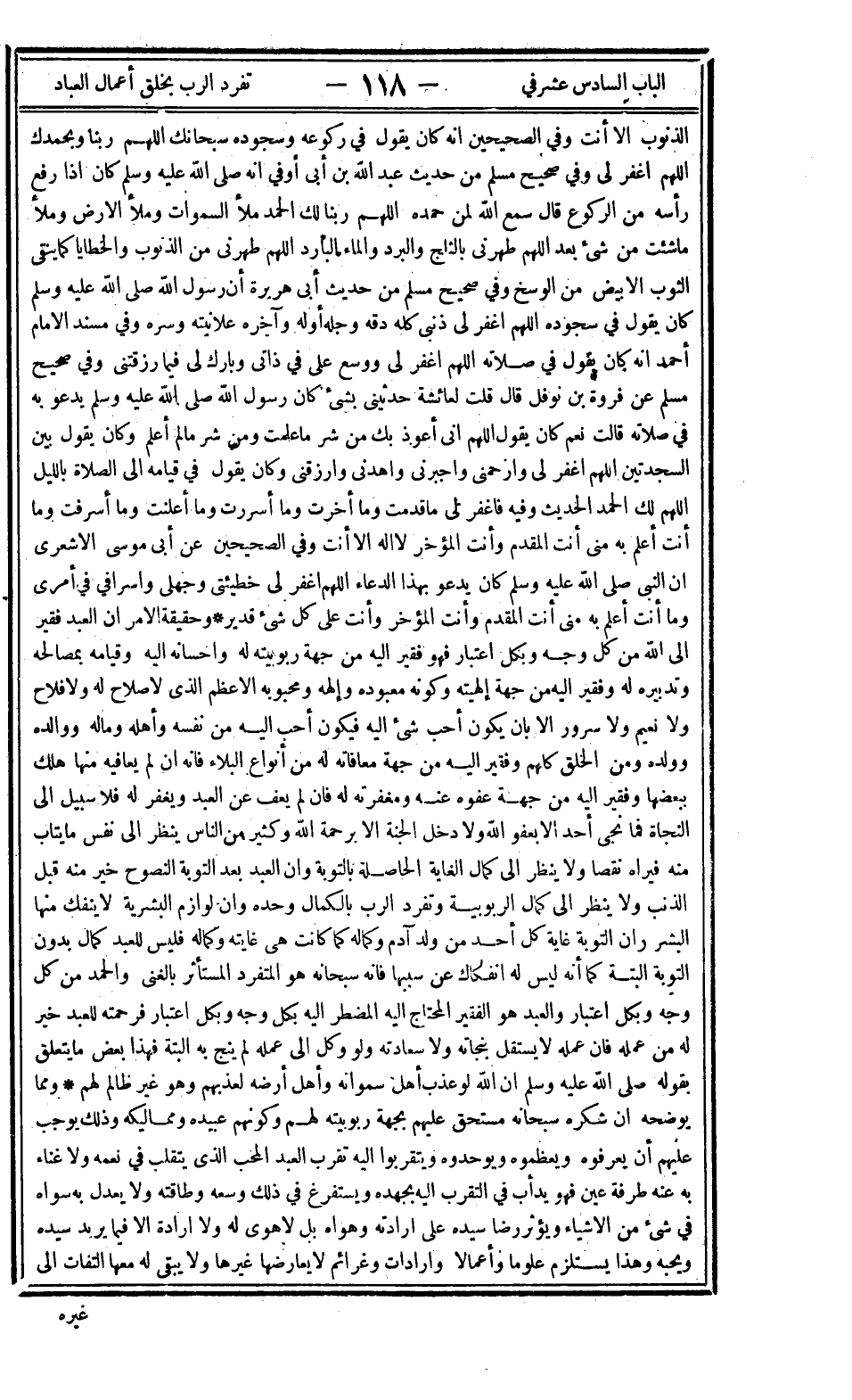 الذنوب إلا أنت وفي الصحيحين أنه كان يقول في ركوعه وسجوده: "سبحانك اللهم ربنا وبحمدك اللهم اغفر لي" وفي صحيح مسلم من حديث عبد الله بن أبي أوفى: "أنه صلى الله عليه وسلم كان إذا رفع رأسه من الركوع قال: سمع الله لمن حمده اللهم ربنا لك الحمد ملأ السماوات وملأ الأرض وملأ ما شئت من شيء بعد اللهم طهرني بالثلج والبرد والماء البارد اللهم طهرني من الذنوب والخطايا كما ينقى الثوب الأبيض من الوسخ" وفي صحيح مسلم من حديث أبي هريرة أن رسول الله صلى الله عليه وسلم كان يقول في سجوده: "اللهم اغفر لي ذنبي كله دقه وجله أوله وآخره علانيته وسره" وفي مسند الإمام أحمد أنه كان يقول في صلاته: "اللهم اغفر لي ووسع عليّ في ذاتي وبارك لي فيما رزقتني" وفي صحيح مسلم عن فروة بن نوفل قال: قلت لعائشة حدثيني بشيء كان رسول الله صلى الله عليه وسلم يدعو به في صلاته قالت: نعم كان يقول: "اللهم إني أعوذ بك من شر ما علمت ومن شر ما لم أعلم وكان يقول بين السجدتين اللهم اغفر لي وارحمني واجبرني واهدني وارزقني" وكان يقول في قيامه إلى الصلاة بالليل: "اللهم لك الحمد" الحديث وفيه "فاغفر لي ما قدمت وما أخرت وما أسررت وما أعلنت وما أسرفت وما أنت أعلم به مني أنت المقدم وأنت المؤخر لا إله إلا أنت" وفي الصحيحين عن أبي موسى الأشعري أن النبي صلى الله عليه وسلم كان يدعو بهذا الدعاء: "اللهم اغفر لي خطيئتي وجهلي وإسرافي في أمري وما أنت أعلم به مني أنت المقدم وأنت المؤخر وأنت على كل شيء قدير"، وحقيقة الأمر أن العبد فقير إلى الله من كل وجه وبكل اعتبار فهو فقير إليه من جهة ربوبيته له وإحسانه إليه وقيامه بمصالحه وتدبيره له وفقير إليه من جهة إلهيته وكونه معبوده وإلهه ومحبوبه الأعظم الذي لا صلاح له ولا فلاح ولا نعيم ولا سرور إلا بأن يكون أحب شيء إليه فيكون أحب إليه من نفسه وأهله وماله ووالده وولده ومن الخلق كلهم وفقير إليه من جهة معافاته له من أنواع البلاء فإنه إن لم يعافيه منها هلك ببعضها وفقير إليه من جهة عفوه عنه ومغفرته له فإن لم يعف عن العبد ويغفر له فلا سبيل إلى النجاة فما نجى أحد إلا بعفو الله ولا دخل الجنة إلا برحمة الله وكثير من الناس ينظر إلى نفس ما يتاب منه فيراه نقصا ولا ينظر إلى كمال الغاية الحاصلة بالتوبة وأن العبد بعد التوبة النصوح خير منه قبل الذنب ولا ينظر إلى كمال الربوبية وتفرد الرب بالكمال وحده وأن لوازم البشرية لا ينفك منها البشر وأن التوبة غاية كل أحد من ولد آدم وكماله كما كانت هي غايته وكماله فليس للعبد كمال بدون التوبة البتة كما أنه ليس له انفكاك عن سببها فإنه سبحانه هو المتفرد المستأثر بالغنى والحمد من كل وجه وبكل اعتبار والعبد هو الفقير المحتاج إليه المضطر إليه بكل وجه وبكل اعتبار فرحمته للعبد خير له من عمله فإن عمله لا يستقل بنجاته ولا سعادته ولو وكل إلى عمله لم ينج به البتة فهذا بعض ما يتعلق بقوله صلى الله عليه وسلم: "إن الله لو عذب أهل سماواته وأهل أرضه لعذبهم وهو غير ظالم لهم" ومما يوضحه أن شكره سبحانه مستحق عليهم بجهة ربوبيته لهم وكونهم عبيده ومماليكه وذلك يوجب عليهم أن يعرفوه ويعظموه ويوحدوه ويتقربوا إليه تقرب العبد المحب الذي يتقلب في نعمه ولا غناء به عنه طرفة عين فهو يدأب في التقرب إليه بجهده ويستفرغ في ذلك وسعه وطاقته ولا يعدل به سواه في شيء من الأشياء ويؤثر رضا سيده على إرادته وهواه بل لا هوى له ولا إرادة إلا فيما يريد سيده ويحبه وهذا يستلزم علوما وأعمالا وإرادات وغرائم لا يعارضها غيرها ولا يبقى له معها التفات إلى
