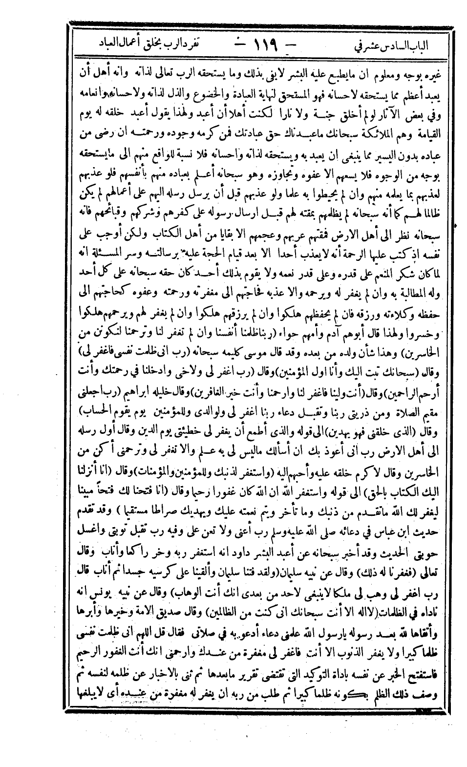 غيره بوجه ومعلوم أن ما يطبع عليه البشر لا يفي بذلك وما يستحقه الرب تعالى لذاته وأنه أهل أن يعبد أعظم مما يستحقه لإحسانه فهو المستحق لنهاية العبادة والخضوع والذل لذاته ولإحسانه وإنعامه وفي بعض الآثار "لو لم أخلق جنة ولا نارا لكنت أهلا أن أعبد" ولهذا يقول أعبد خلقه له يوم القيامة وهم الملائكة سبحانك ما عبدناك حق عبادتك فمن كرمه وجوده ورحمته أن رضي من عباده بدون اليسير مما ينبغي أن يعبد به ويستحقه لذاته وإحسانه فلا نسبة للواقع منهم إلى ما يستحقه بوجه من الوجوه فلا يسعهم إلا عفوه وتجاوزه وهو سبحانه أعلم بعباده منهم بأنفسهم فلو عذبهم لعذبهم بما يعلمه منهم وإن لم يحيطوا به علما ولو عذبهم قبل أن يرسل رسله إليهم على أعمالهم لم يكن ظالما لهم كما أنه سبحانه لم يظلمهم بمقته لهم قبل إرسال رسوله على كفرهم وشركهم وقبائحهم فإنه سبحانه نظر إلى أهل الأرض فمقتهم عربهم وعجمهم إلا بقايا من أهل الكتاب ولكن أوجب على نفسه إذ كتب عليها الرحمة أنه لا يعذب أحدا إلا بعد قيام الحجة عليه برسالته وسر المسألة أنه لما كان شكر المنعم على قدره وعلى قدر نعمه ولا يقوم بذلك أحد كان حقه سبحانه على كل أحد وله المطالبة به وإن لم يغفر له ويرحمه وإلا عذبه فحاجتهم إلى مغفرته ورحمته وعفوه كحاجتهم إلى حفظه وكلاءته ورزقه فإن لم يحفظهم هلكوا وإن لم يرزقهم هلكوا وإن لم يغفر لهم ويرحمهم هلكوا وخسروا ولهذا قال أبوهم آدم وأمهم حواء: {رَبَّنَا ظَلَمْنَا أَنْفُسَنَا وَإِنْ لَمْ تَغْفِرْ لَنَا وَتَرْحَمْنَا لَنَكُونَنَّ مِنَ الْخَاسِرِينَ} وهذا شأن ولده من بعده وقد قال موسى كليمه سبحانه: {رَبِّ إِنِّي ظَلَمْتُ نَفْسِي فَاغْفِرْ لِي} وقال: {سُبْحَانَكَ تُبْتُ إِلَيْكَ وَأَنَا أَوَّلُ الْمُؤْمِنِينَ} وقال: {رَبِّ اغْفِرْ لِي وَلِأَخِي وَأَدْخِلْنَا فِي رَحْمَتِكَ وَأَنْتَ أَرْحَمُ الرَّاحِمِينَ} وقال: {أَنْتَ وَلِيُّنَا فَاغْفِرْ لَنَا وَارْحَمْنَا وَأَنْتَ خَيْرُ الْغَافِرِينَ} وقال خليله إبراهيم: {رَبِّ اجْعَلْنِي مُقِيمَ الصَّلاةِ وَمِنْ ذُرِّيَّتِي رَبَّنَا وَتَقَبَّلْ دُعَاءِ رَبَّنَا اغْفِرْ لِي وَلِوَالِدَيَّ وَلِلْمُؤْمِنِينَ يَوْمَ يَقُومُ الْحِسَابُ} وقال: {الَّذِي خَلَقَنِي فَهُوَ يَهْدِينِ} إلى قوله: {وَالَّذِي أَطْمَعُ أَنْ يَغْفِرَ لِي خَطِيئَتِي يَوْمَ الدِّينِ} وقال أول رسله إلى أهل الأرض: {رَبِّ إِنِّي أَعُوذُ بِكَ أَنْ أَسْأَلَكَ مَا لَيْسَ لِي بِهِ عِلْمٌ وَإِلاَّ تَغْفِرْ لِي وَتَرْحَمْنِي أَكُنْ مِنَ الْخَاسِرِينَ} وقال لأكرم خلقه عليه وأحبهم إليه: {وَاسْتَغْفِرْ لِذَنْبِكَ وَلِلْمُؤْمِنِينَ وَالْمُؤْمِنَاتِ} وقال: {إِنَّا أَنْزَلْنَا إِلَيْكَ الْكِتَابَ بِالْحَق} إلى قوله: {وَاسْتَغْفِرِ اللَّهَ إِنَّ اللَّهَ كَانَ غَفُوراً رَحِيماً} وقال: {إِنَّا فَتَحْنَا لَكَ فَتْحاً مُبِيناً لِيَغْفِرَ لَكَ اللَّهُ مَا تَقَدَّمَ مِنْ ذَنْبِكَ وَمَا تَأَخَّرَ وَيُتِمَّ نِعْمَتَهُ عَلَيْكَ وَيَهْدِيَكَ صِرَاطاً مُسْتَقِيماً} وقد تقدم حديث ابن عباس في دعائه صلى الله عليه وسلم: "رب أعني ولا تعن عليّ" وفيه "رب تقبل توبتي واغسل حوبتي" الحديث وقد أخبر سبحانه عن أعبد البشر داود أنه استغفر ربه راكعا وأناب وقال تعالى: {فَغَفَرْنَا لَهُ ذَلِك} وقال عن نبيه سليمان: {وَلَقَدْ فَتَنَّا سُلَيْمَانَ وَأَلْقَيْنَا عَلَى كُرْسِيِّهِ جَسَداً ثُمَّ أَنَابَ قَالَ رَبِّ اغْفِرْ لِي وَهَبْ لِي مُلْكاً لا يَنْبَغِي لأَحَدٍ مِنْ بَعْدِي إِنَّكَ أَنْتَ الْوَهَّابُ} وقال عن نبيه يونس أنه ناداه في الظلمات: {لا إِلَهَ إِلاَّ أَنْتَ سُبْحَانَكَ إِنِّي كُنْتُ مِنَ الظَّالِمِينَ} وقال صديق الأمة وخيرها وأبرها وأتقاها لله بعد رسوله: يا رسول الله علمني دعاء أدعو به في صلاتي فقال: "قل اللهم إني ظلمت نفسي ظلما كبيرا ولا يغفر الذنوب إلا أنت فاغفر لي مغفرة من عندك وارحمني أنك أنت الغفور الرحيم" فاستفتح الخبر عن ن