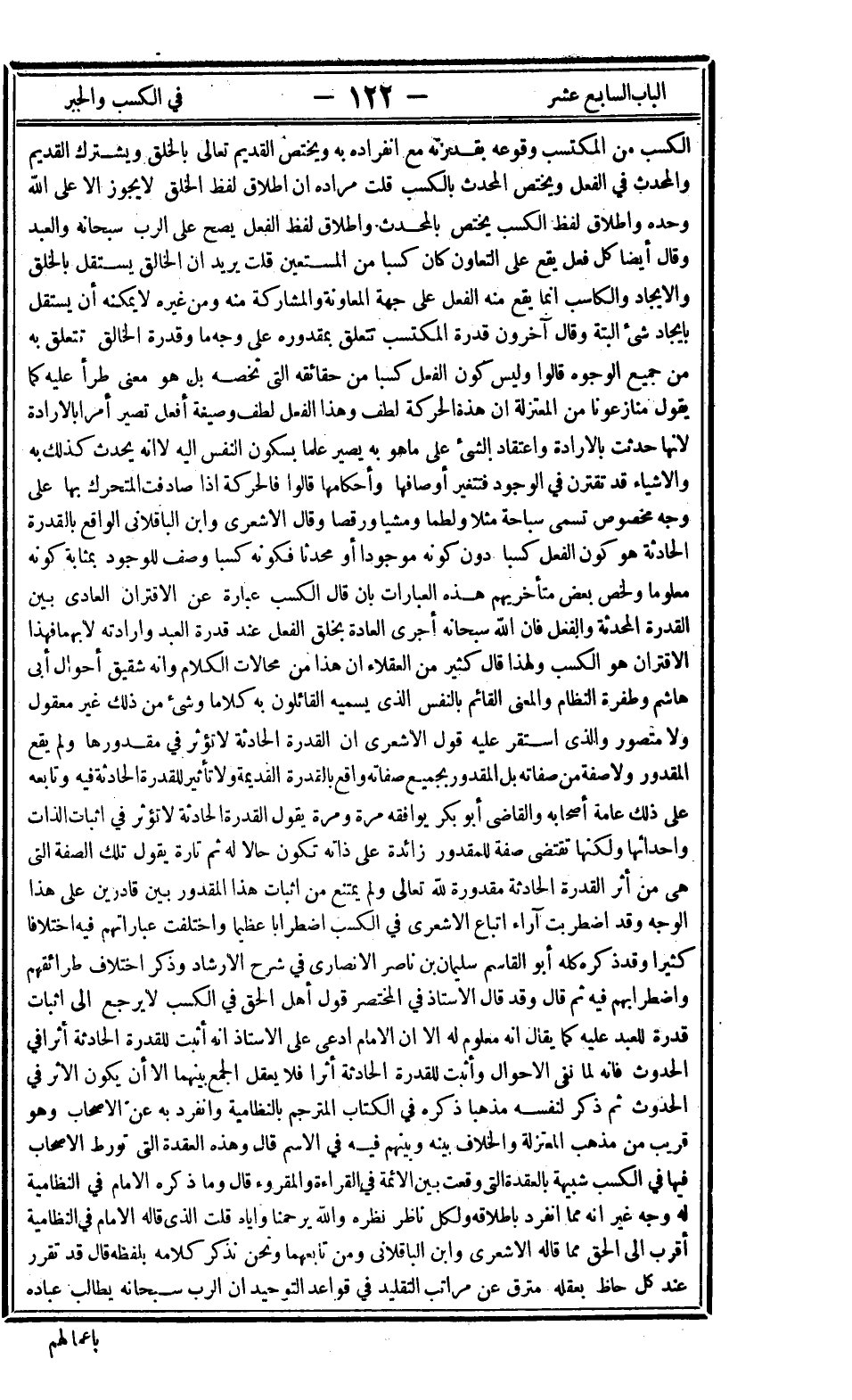 الكسب من المكتسب وقوعه بقدرته مع انفرداه به ويختص القديم تعالى بالخلق ويشترك القديم والمحدث في الفعل ويختص المحدث بالكسب" قلت: مراده أن إطلاق لفظ الخلق لا يجوز إلا على الله وحده وإطلاق لفظ الكسب يختص بالمحدث وإطلاق لفظ الفعل يصح على الرب سبحانه والعبد وقال أيضا: "كل فعل يقع على التعاون كان كسبا من المستعين" قلت: يريد أن الخالق يستقل بالخلق والإيجاد والكاسب إنما يقع منه الفعل على وجهه المعاونة والمشاركة منه ومن غيره لا يمكنه أن يستقل بإيجاد شيء البتة وقال آخرون: قدرة المكتسب تتعلق بمقدوره على وجه ما وقدرة الخالق تتعلق به من جميع الوجوه قالوا وليس كون الفعل كسبا من حقائقه التي تخصه بل هو معنى طرأ عليه كما يقول منازعونا من المعتزلة إن هذه الحركة لطف وهذا الفعل لطف وصيغة أفعل تصير أمرا بالإرادة لأنها حدثت بالإرادة واعتقاد الشيء على ما هو به يصير علما بسكون النفس إليه لا أنه يحدث كذلك به والأشياء قد تقترن في الوجود فتتغير أوصافها وأحكامها قالوا فالحركة إذا صادفت المتحرك بها على وجه مخصوص تسمى سباحة مثلا ولطما ومشيا ورقصا وقال الأشعري وابن الباقلاني: "الواقع بالقدرة الحادثة هو كون الفعل كسبا دون كونه موجودا أو محدثا فكونه كسبا وصف للوجود بمثابة كونه معلوما" ولخص بعض متأخريهم هذه العبارات بأن قال: "الكسب عبارة عن الاقتران العادي بين القدرة المحدثة والفعل" فإن الله سبحانه أجرى العادة بخلق الفعل عند قدرة العبد وإرادته لا بهما فهذا الاقتران هو الكسب ولهذا قال كثير من العقلاء إن هذا من محالات الكلام وإنه شقيق أحوال أبي هاشم وطفرة النظام والمعنى القائم بالنفس الذي يسميه القائلون به كلاما وشيء من ذلك غير معقول ولا متصور والذي استقر عليه قول الأشعري: "أن القدرة الحادثة لا تؤثر في مقدورها ولم يقع المقدور ولا صفة من صفاته بل المقدور بجميع صفاته واقع بالقدرة القديمة ولا تأثير للقدرة الحادثة فيه" وتابعه على ذلك عامة أصحابه والقاضي أبو بكر يوافقه مرة ومرة يقول: "القدرة الحادثة لا تؤثر في إثبات الذات وأحداثها ولكنها تقتضي صفة للمقدور زائدة على ذاته تكون حالا له" ثم تارة يقول: "تلك الصفة التي هي من أثر القدرة الحادثة مقدورة لله تعالى ولم يمتنع من إثبات هذا المقدور بين قادرين على هذا الوجه" وقد اضطربت آراء أتباع الأشعري في الكسب اضطرابا عظيما واختلفت عباراتهم فيه اختلافا كثيرا وقد ذكره كله أبو القاسم سليمان بن ناصر الأنصاري في شرح الإرشاد وذكر اختلاف طرائقهم واضطرابهم فيه ثم قال: "وقد قال الأستاذ في المختصر قول أهل الحق في الكسب لا يرجع إلى إثبات قدرة للعبد عليه" كما يقال أنه معلوم له إلا أن الإمام ادعى على الأستاذ أنه أثبت للقدرة الحادثة أثرا في الحدوث فإنه لما نفي الأحوال وأثبت للقدرة الحادثة أثرا فلا يعقل الجمع بينهما إلا أن يكون الأثر في الحدوث ثم ذكر لنفسه مذهبا ذكره في الكتاب المترجم بالنظامية وانفرد به عن الأصحاب وهو قريب من مذهب المعتزلة والخلاف بينه وبينهم فيه في الاسم قال: "وهذه العقدة التي تورط الأصحاب فيها في الكسب شبيهة بالعقدة التي وقعت بين الأئمة في القراءة والمقروء "قالك "وما ذكره الإمام في النظامية له وجه غير أنه مما انفرد بإطلاقه" ولكل ناظر نظره والله يرحمنا وإياه قلت: الذي قاله الإمام في النظامية أقرب إلى الحق مما قاله الأشعري وابن الباقلاني ومن تابعهما ونحن نذكر كلامه بلفظه قالك "قد تقرر عند كل حاظ! بعقله مترق عن مراتب التقليد في قواعد التوحيد أن الرب سبحانه يطالب عباده