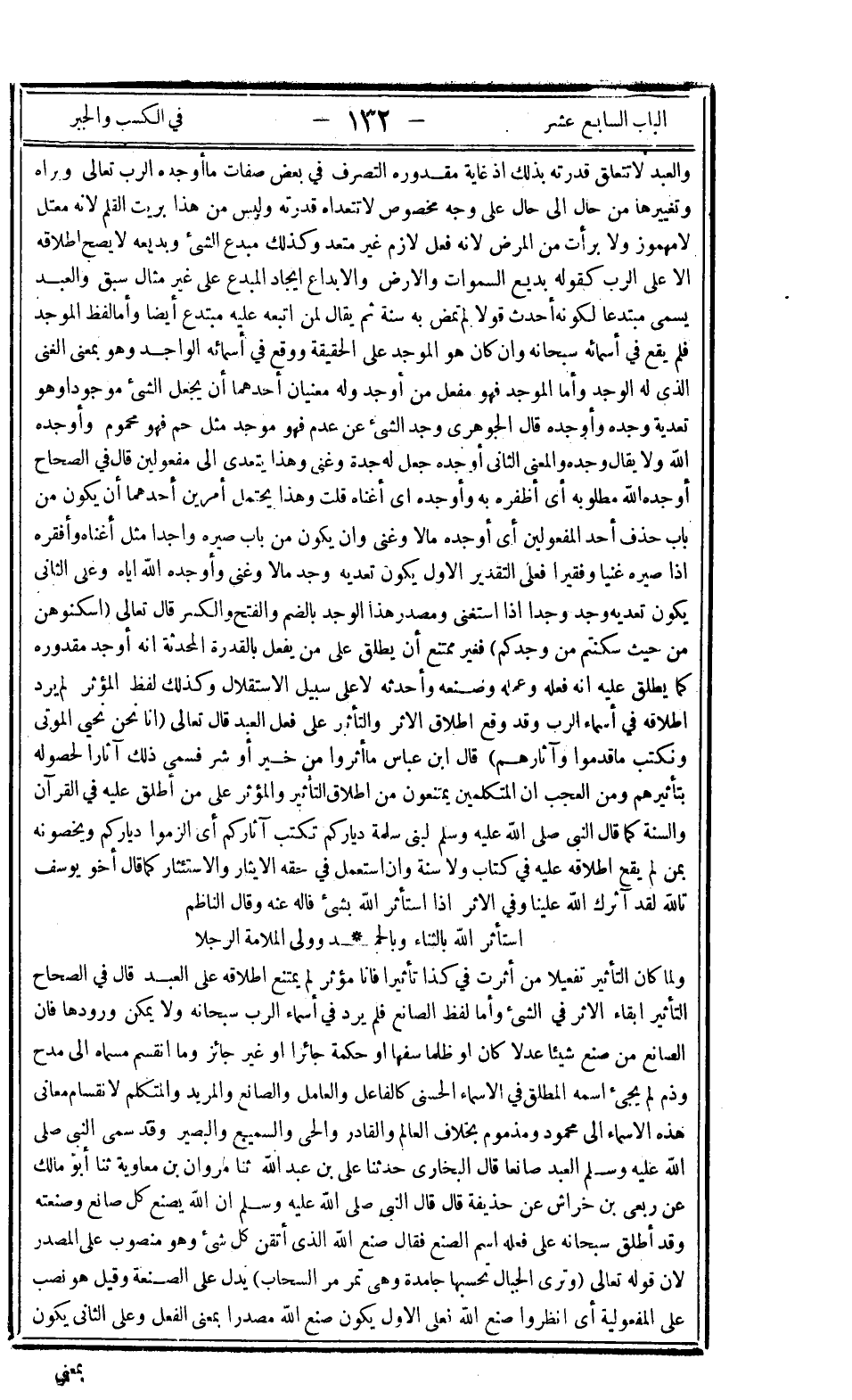 والعبد لا تتعلق قدرته بذلك إذ غاية مقدوره التصرف في بعض صفات ما أوجده الرب تعالى وبراه وتغييرها من حال إلى حال على وجه مخصوص لا تتعداه قدرته ليس من هذا بريت القلم لأنه معتل لا مهموز ولا برأت من المرض لأنه فعل لازم غير متعد وكذلك مبدع الشيء وبديعه لا يصح إطلاقه إلا على الرب كقوله: {بَدِيعُ السَّمَاوَاتِ وَالأَرْضِ} والإبداع إيجاد المبدع على غير مثال سبق والعبد يسمى مبتدعا لكونه أحدث قولا لم تمض به سنة ثم يقال لمن اتبعه عليه مبتدع أيضا وأما لفظ الموجد فلم يقع في أسمائه سبحانه وإن كان هو الموجد على الحقيقة ووقع في أسمائه الواجد وهو بمعنى الغنى الذي له الوجد وأما الموجد فهو مفعل من أوجد وله معنيان أحدهما: أن يجعل الشيء موجودا وهو تعدية وجده وأوجده قال الجوهري: "وجد الشيء عن عدم فهو موجد مثل حم فهو محموم" وأوجده الله ولا يقال وجدوه والمعنى الثاني: أوجده جعل له جدة وغنى وهذا يتعدى إلى مفعولين قال في الصحاح: "أوجده الله مطلوبه أي أظفره به وأوجده أي أغناه" قلت وهذا يحتمل أمرين أحدهما: أن يكون من باب حذف أحد المفعولين أي أوجده مالا وغنى وأن يكون من باب صيره واجدا مثل أغناه وأفقره إذا صيره غنيا وفقيرا فعلى التقدير الأول يكون تعديه وجد مالا وغنى وأوجده الله إياه وعلى الثاني يكون تعديه وجد وجدا إذا استغنى ومصدر هذا الوجد بالضم والفتح والكسر قال تعالى: {أَسْكِنُوهُنَّ مِنْ حَيْثُ سَكَنْتُمْ مِنْ وُجْدِكُمْ} فغير ممتنع أن يطلق على من يفعل بالقدرة المحدثة أنه أوجد مقدوره كما يطلق عليه أنه فعله وعمله وصنعه وأحدثه لا على سبيل الاستقلال وكذلك لفظ المؤثر لم يرد إطلاقه في أسماء الرب وقد وقع إطلاق الأثر والتأثير! على فعل العبد قال تعالى: {إِنَّا نَحْنُ نُحْيِ الْمَوْتَى وَنَكْتُبُ مَا قَدَّمُوا وَآثَارَهُمْ} قال ابن عباس: "ما أثروا من خير أو شر فسمى ذلك آثارا لحصوله بتأثيرهم" ومن العجب أن المتكلمين يمتنعون من إطلاق التأثير والمؤثر على من أطلق عليه في القرآن والسنة كما قال النبي صلى الله عليه وسلم لبني سلمة: "دياركم تكتب آثاركم" أي الزموا دياركم ويخصونه بمن لم يقع إطلاقه عليه في كتاب ولا سنة وإن استعمل في حقه الإيثار والاستئثار كما قال أخو يوسف: {تَاللَّهِ لَقَدْ آثَرَكَ اللَّهُ عَلَيْنَا} وفي الأثر: "إذا استأثر الله بشيء فاله عنه" وقال الناظم: