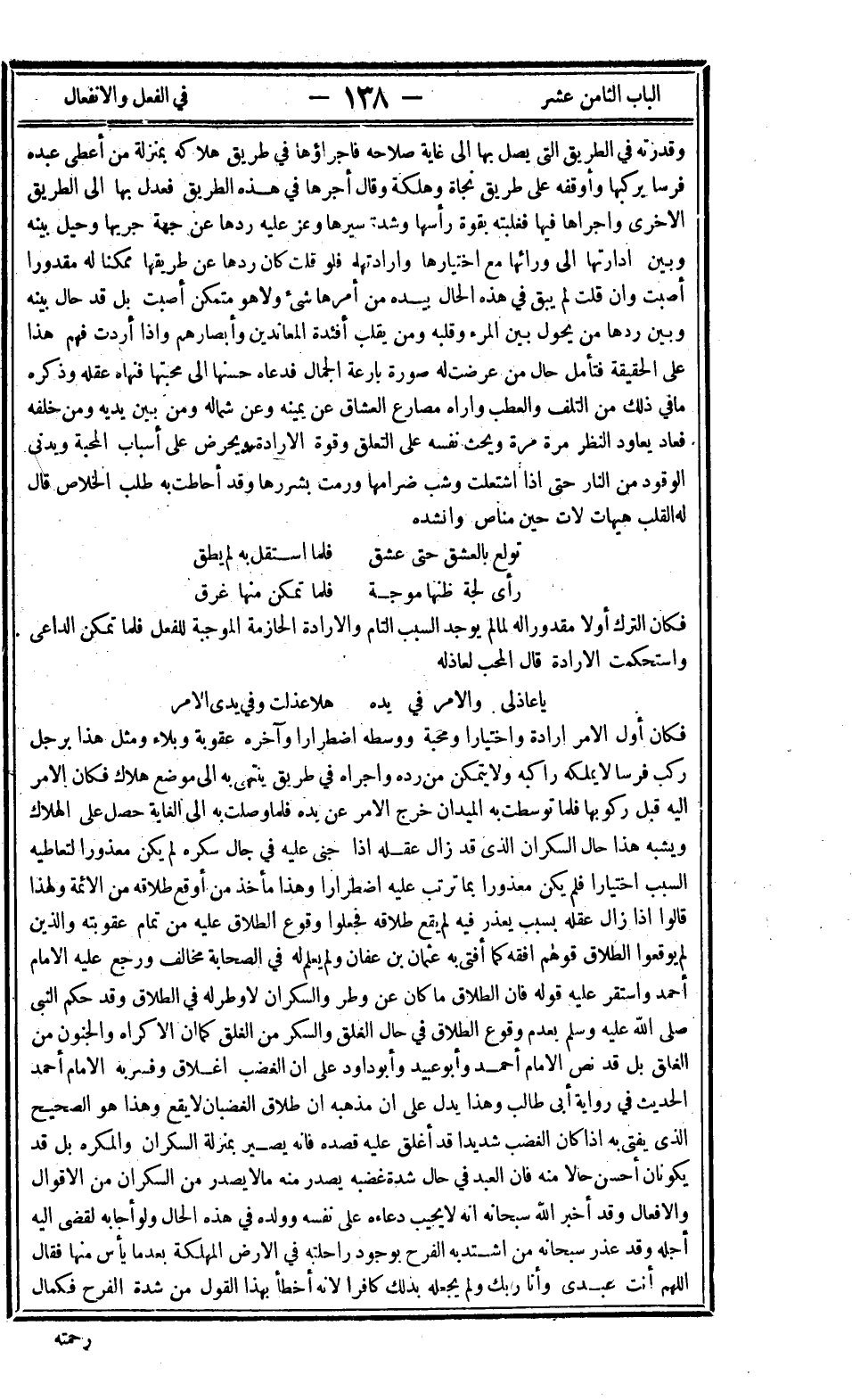 فكان أول الأمر إرادة واختيار ومحبة ووسطه اضطرارا وآخره عقوبة وبلاء ومثل هذا برجل ركب فرسا لا يملكه راكبه ولا يتمكن من رده وأجراه في طريق ينتهي به إلى موضع هلاك فكان الأمر إليه قبل ركوبها فلما توسطت به الميدان خرج الأمر عن يده فلما وصلت به إلى الغاية حصل على الهلاك ويشبه هذا حال السكران الذي قد زال عقله إذا جني عليه في حال سكره لم يكن معذورا لتعاطيه السبب اختيارا فلم يكن معذورا بما ترتب عليه اضطرارا وهذا مأخذ من أوقع طلاقه من الأئمة ولهذا قالوا إذا زال عقله بسبب يعذر فيه لم يقع طلاقه فجعلوا وقوع الطلاق عليه من تمام عقوبته والذين لو يوقعوا الطلاق قولهم أفقه كما أفتى به عثمان بن عفان ولم يعلم له في الصحابة مخالف ورجع عليه الإمام أحمد واستقر عليه قوله فإن الطلاق ما كان عن وطر والسكران لا وطر له في الطلاق وقد حكم النبي صلى الله عليه وسلم بعدم عدم الطلاق في حال الغلق والسكر من الغلق كما أن الإكراه والجنون من الغلق بل قد نص الإمام أحمد وأبو عبيد وأبو داود على أن الغضب إغلاق وفسر به الإمام أحمد الحديث في رواية أبي طالب وهذا يدل على أن مذهبه أن طلاق الغضبان لا يقع وهذا هو الصحيح الذي يفتى به إذا كان الغضب شديدا قد أغلق عليه قصده فإنه يصير بمنزلة السكران والمكره بل قد يكونان أحسن حالا منه فإن العبد في حال شدة غضبه يصدر منه ما لا يصدر من السكران من الأقوال والأفعال وقد أخبر الله سبحانه أنه لا يجيب دعاءه على نفسه وولده في هذا الحال ولو أجابه لقضى إليه أجله وقد عذر سبحانه من اشتد به الفرح بوجود راحلته في الأرض المهلكة بعدما يأس منها فقال اللهم أنت عبدي وأنا ربك ولم يجعله بذلك كافرا لأنه أخطأ بهذا القول من شدة الفرح فكمال