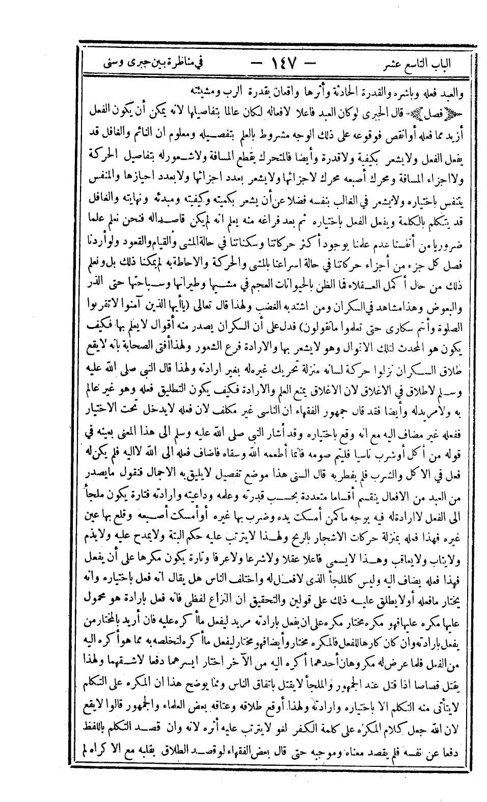فصل: قال الجبري: لو كان العبد فاعلا لأفعاله لكان عالما بتفاصيلها لأنه يمكن أن يكون الفعل أزيد مما فعله أو أنقص فوقوعه على ذلك الوجه مشروط بالعلم بتفصيله ومعلوم أن النائم والغافل قد يفعل الفعل ولا يشعر بكيفية ولا قدرة وأيضا فالمتحرك يقطع المسافة ولا شعور له بتفاصيل الحركة ولا أجزاء المسافة ومحرك أصبعه لأجزائها ولا يشعر بعدد أجزائها ولا بعدد أحيازها والمنفس يتنفس باختياره ولا يشعر في الغالب بنفسه فضلا عن أن يشعر بكميته وكيفيته ومبدئه ونهايته والغافل قد يتكلم بالكلمة ويفعل الفعل باختياره ثم بعد فراغه منه يعلم أنه لم يكن قاصدا له فنحن نعلم علما ضروريا من أنفسنا عدم علمنا بوجود أكثر حركاتنا وسكناتنا في حالة المشي والقيام والقعود ولو أردنا فصل كل جزء من أجزاء حركاتنا في حالة إسراعنا بالمشي والحركة والإحاطة به لم يمكنا ذلك بل ونعلم ذلك من حال أكمل العقلاء فما الظن بالحيوانات العجم في مشيها وطيرانها وسباحتها حتى الذر والبعوض وهنا مشاهد في السكران ومن اشتد به الغضب ولهذا قال تعالى: {يَا أَيُّهَا الَّذِينَ آمَنُوا لا تَقْرَبُوا الصَّلاةَ وَأَنْتُمْ سُكَارَى حَتَّى تَعْلَمُوا مَا تَقُولُونَ} فدل على أن السكران يصدر منه أقوال لا يعلم بها فكيف يكون هو المحدث لتلك الأقوال وهو لا يشعر بها والإرادة فرع الشعور ولهذا أفتى الصحابة بأنه لا يقع طلاق السكران نزلوا حركة لسانه منزلة تحريك غيره له بغير إرادته ولهذا قال النبي صلى الله عليه وسلم: "لا طلاق في الإغلاق" لأن الإغلاق يمنع العلم والإرادة فكيف يكون التطليق فعله وهو غير عالم به ولا مريد له وأيضا فقد قال جمهور الفقهاء أن الناسي غير مكلف لأن فعله لا يدخل تحت الاختيار ففعله غير مضاف إليه مع أنه وقع باختياره وقد أشار النبي صلى الله عليه وسلم إلى هذا المعنى بعينه في قوله: "من أكل أو شرب ناسيا فليتم صومه فإنما أطعمه الله وسقاه" فأضاف فعله إلى الله لا إليه فلم يكن له فعل في الأكل والشرب فلم يفطر به قال السني: هذا موضع تفصيل لا يليق به الإجمال فنقول ما يصدر من العبد من الأفعال ينقسم أقساما متعددة بحسب قدرته وعلمه وداعيته وإرادته فتارة يكون ملجأ إلى الفعل لا إرادة له فيه بوجه ما كمن أمسكت يده وضرب بها غيره أو أمسكت أصبعه وقلع بها عين غيره فهذا فعله بمنزلة حركات الأشجار بالريح ولهذا لا يترتب عليه حكم البتة ولا يمدح عليه ولا يذم ولا يثاب ولا يعاقب وهذا لا يسمى فاعلا عقلا ولا شرعا ولا عرفا وتارة يكون مكرها على أن يفعل فهذا فعله يضاف إليه وليس كالملجأ الذي لا فعل له واختلف الناس هل يقال أنه فعل باختياره وأنه يختار ما فعله أو لا يطلق عليه ذلك على قولين والتحقيق أن النزاع لفظي فإنه فعل بإرادة هو محمول عليها مكره عليها فهو مكره مختار مكره على أن يفعل بإرادته مريد ليفعل ما أكره عليه فإن أريد بالمختار من يفعل بإرادته وإن كان كارها للفعل فالمكره مختار وأيضا فهو مختار ليفعل ما أكره لتخلصه به مما هو أكره إليه من الفعل فلما عرض له مكروهان أحدهما أكره إليه من الآخر اختار أيسرهما دفعا لأشقهما ولهذا يقتل قصاصا إذا قتل عند الجمهور والملجأ لا يقتل باتفاق الناس ومما يوضح هذا أن المكره على التكلم لا يتأتى منه التكلم إلا باختياره وإرادته ولهذا أوقع طلاقه وعتاقه بعض العلماء والجمهور قالوا لا يقع لأن الله جعل كلام المكره على كلمة الكفر لغو لا يترتب عليه أثره لأنه وإن قصد التكلم باللفظ دفعا عن نفسه فلم يقصد معناه وموجبه حتى قال بعض الفقهاء لو قصد الطلاق بقلبه مع الإكراه لم