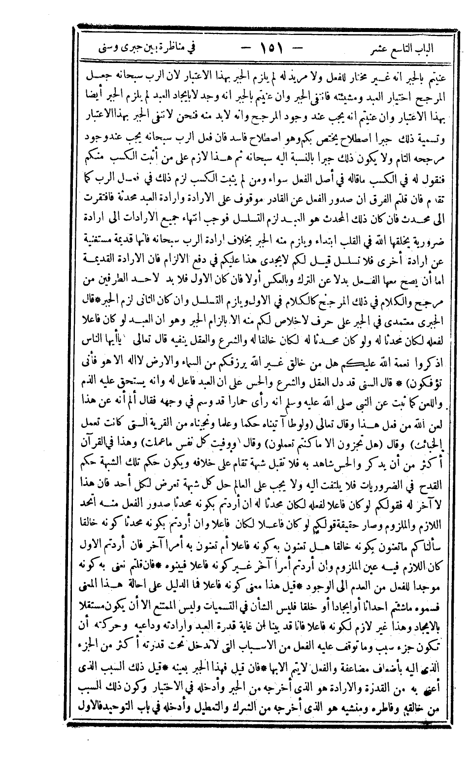 عنيتم بالجبر أنه غير مختار للفعل ولا مريد له لم يلزم الجبر بهذا الاعتبار لأن الرب سبحانه جعل المرجح اختيار العبد ومشيئته فانتفى الجبر وإن عنيتم بالجبر أنه وجد لا بإيجاد العبد لم يلزم الجبر أيضا بهذا الاعتبار وإن عنيتم أنه يجب عند وجود المرجح وأنه لا بد منه فنحن لا ننفي الجبر بهذا الاعتبار وتسمية ذلك جبرا اصطلاح يختص بكم وهو اصطلاح فاسد فإن فعل الرب سبحانه يجب عند وجود مرجحه التام ولا يكون ذلك جبرا بالنسبة إليه سبحانه ثم هذا لازم على من اثبت الكسب منكم فنقول له في الكسب ما قاله في أصل الفعل سواء ومن لم يثبت الكسب لزم ذلك في فعل الرب كما تقدم فإن قلتم الفرق أن صدور الفعل عن القادر موقوف على الإرادة وإرادة العبد محدثة فافتقرت إلى محدث فإن كان ذلك المحدث هو العبد لزم التسلسل فوجب انتهاء جميع الإرادات إلى إرادة ضرورية يخلقها الله في القلب ابتداء ويلزم منه الجبر بخلاف إرادة الرب سبحانه فإنها قديمة مستغنية عن إرادة أخرى فلا تسلسل قيل لكم لا يجدي هذا عليكم في دفع الإلزام فإن الإرادة القديمة إما أن يصح معها الفعل بدلا عن الترك وبالعكس أو لا فإن كان الأول فلا بد لأحد الطرفين من مرجح والكلام في ذلك المرجح كالكلام في الأول ويلزم التسلسل وإن كان الثاني لزم الجبر، قال الجبري: معتمدي في الجبر على حرف لا خلاص لكم منه إلا بإلزام الجبر وهو أن العبد لو كان فاعلا لفعله لكان محدثا له ولو كان محدثا له لكان خالقا له والشرع والعقل ينفيه قال تعالى: {يَا أَيُّهَا النَّاسُ اذْكُرُوا نِعْمَتَ اللَّهِ عَلَيْكُمْ هَلْ مِنْ خَالِقٍ غَيْرُ اللَّهِ يَرْزُقُكُمْ مِنَ السَّمَاءِ وَالأَْرضِ لا إِلَهَ إِلاَّ هُوَ فَأَنَّى تُؤْفَكُونَ} ، قال السني: قد دل العقل والشرع والحس على أن العبد فاعل له وأنه يستحق عليه الذم واللعن كما ثبت عن النبي صلى الله عليه وسلم أنه رأى حمارا قد وسم في وجهه فقال: "ألم أنه عن هذا لعن الله من فعل هذا" وقال تعالى: {وَلُوطاً آتَيْنَاهُ حُكْماً وَعِلْماً وَنَجَّيْنَاهُ مِنَ الْقَرْيَةِ الَّتِي كَانَتْ تَعْمَلُ الْخَبَائِثَ} وقال: {هَلْ تُجْزَوْنَ إِلاَّ مَا كُنْتُمْ تَعْمَلُونَ} وقال: {وَوُفِّيَتْ كُلُّ نَفْسٍ مَا عَمِلَتْ} وهذا في القرآن أكثر من أن يذكر والحس شاهد به فلا تقبل شبهة تقام على خلافه ويكون حكم تلك الشبهة حكم القدح في الضروريات فلا يلتفت إليه ولا يجب على العالم حل كل شبهة تعرض لكل أحد فإن هذا لا آخر له فقولكم لو كان فاعلا لفعله لكان محدثا له إن أردتم بكونه محدثا صدور الفعل منه اتحد اللازم والملزوم وصار حقيقة قولكم لو كان فاعلا لكان فاعلا وإن أردتم بكونه محدثا كونه خالقا سألناكم ما تعنون بكونه خالقا هل تعنون به كونه فاعلا أم تعنون به أمرا آخرا فإن أردتم الأول كان اللازم فيه عين الملزوم وإن أردتم أمرا آخر غير كونه فاعلا فبينوه، فإن قلتم نعني به كونه موجودا للفعل من العدم إلى الوجود، قيل هذا معنى كونه فاعلا فما الدليل على إحالة هذا المعنى فسموه ما شئتم إحداثا أو إيجادا أو خلقا فليس الشأن في التسميات وليس الممتنع ألا أن يكون مستقلا بالإيجاد وهذا غير لازم لكونه فاعلا فإنا قد بينا أن غاية قدرة العبد وإراداته وداعية وحركته أن تكون جزء سبب وما توقف عليه الفعل من الأسباب التي لا تدخل تحت قدرته أكثر من الجزء الذي إليه بأضعاف مضاعفة والفعل لا يتم إلا بها، فإن قيل فهذا الجبر بعينه، قيل ذلك السبب الذي أعني به من القدرة والإرادة هو الذي أخرجه من الجبر وأدخله في الاختيار وكون ذلك السبب من خالقه وفاطره ومنشيه هو الذي أخرجه من الشرك والتعطيل وأدخله في باب التوحيد فالأول