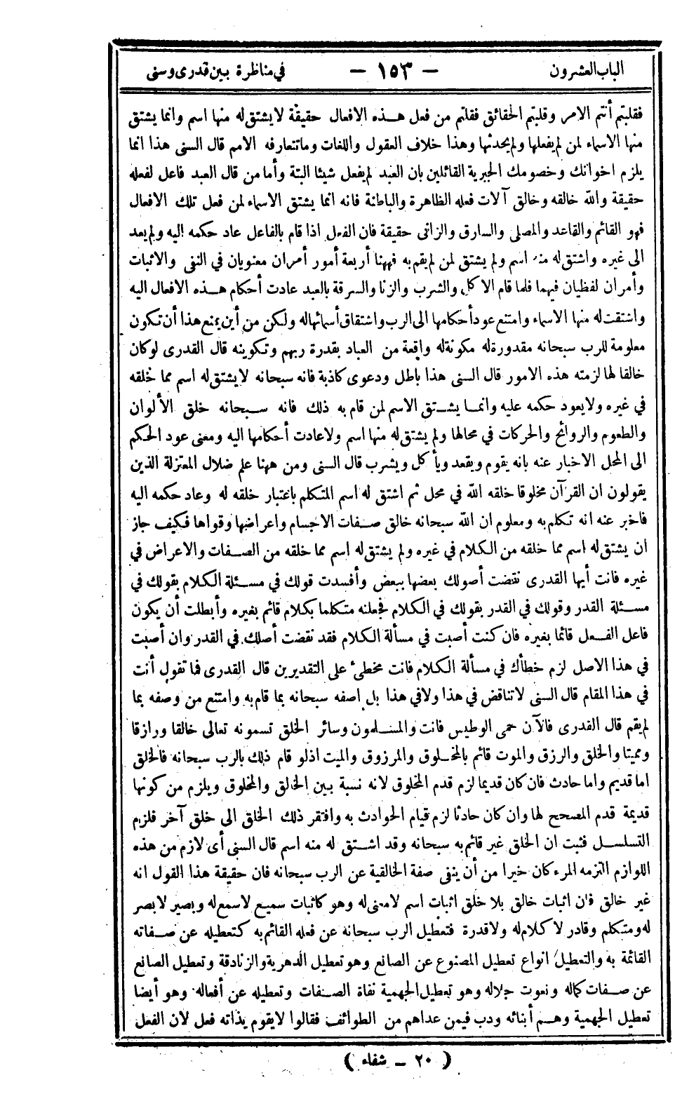 فقلبتم أنتم الأمر وقلبتم الحقائق فقلتم من فعل هذه الأفعال حقيقة لا يشتق له منها اسم وإنما يشتق منها الأسماء لمن لم يفعلها ولم يحدثها وهذا خلاف العقول واللغات وما تتعارفه الأمم قال السني: هذا إنما يلزم إخوانك وخصومك الجبرية القائلين بأن العبد لم يفعل شيئا البتة وأما من قال العبد فاعل لفعله حقيقة والله خالقه وخالق آلات فعله الظاهرة والباطنة فإنه إنما يشتق الأسماء لمن فعل تلك الأفعال فهو القائم والقاعد والمصلي والسارق والزاني حقيقة فإن الفعل إذا قام بالفاعل عاد حكمه إليه ولم يعد إلى غيره واشتق له منه اسم ولم يشتق لمن لم يقم به فههنا أربعة أمور أمران معنويان في النفي والإثبات وأمران لفظيان فيهما فلما قام الأكل والشرب والزنا والسرقة بالعبد عادت أحكام هذه الأفعال إليه واشتقت له منها الأسماء وامتنع عود أحكامها إلى الرب واشتقاق أسمائها له ولكن من أين يمنع هذا أن تكون معلومة للرب سبحانه مقدورة له مكونة له واقعة من العباد بقدرة ربهم وتكوينه قال القدري: لو كان خالقا لها لزمته هذه الأمور قال السني: هذا باطل ودعوى كاذبة فإنه سبحانه لا يشتق له اسم مما خلقه في غيره ولا يعود حكمه عليه وإنما يشتق الاسم لمن قام به ذلك فإنه سبحانه خلق الألوان والطعوم والروائح والحركات في محالها ولم يشتق له منها اسم ولا عادات أحكامها إليه ومعنى عود الحكم إلى المحل الإخبار عنه بأنه يقوم ويقعد ويأكل ويشرب قال السني: ومن ههنا علم ضلال المعتزلة الذين يقولون أن القرآن مخلوقا خلقه الله في محل ثم اشتق له اسم المتكلم باعتبار خلقه له وعاد حكمه إليه فأخبر عنه أنه تكلم به ومعلوم أن الله سبحانه خالق صفات الأجسام وأعراضها وقواها فكيف جاز أن يشتق له اسم مما خلقه من الكلام في غيره ولم يشتق له اسم مما خلقه من الصفات والأعراض في غيره فأنت أيها القدري نقضت أصولك بعضها ببعض وأفسدت قولك في مسألة الكلام بقولك في مسألة القدر وقولك في القدر بقولك في الكلام فجعلته متكلما بكلام قائم بغيره وأبطلت أن يكون فاعل الفعل قائما بغيره فإن كنت أصبت في مسألة الكلام فقد نقضت أصلك في القدر وإن أصبت في هذا الأصل لزم خطأك في مسألة الكلام فأنت مخطئ على التقديرين قال القدري فما تقول أنت في هذا المقام قال السني: لا تناقض في هذا ولا في هذا بل أصفه سبحانه بما قام به وامتنع من وصفه بما لم يقم قال القدري فالآن حمى الوطيس فأنت والمسلمون وسائر الخلق تسمونه تعالى خالقا ورازقا ومميتا والخلق والرزق والموت قائم بالمخلوق والمرزوق والميت إذ لو قام ذلك بالرب سبحانه فالخلق إما قديم وإما حادث فإن كان قديما لزم قدم المخلوق لأنه نسبة بين الخالق والمخلوق ويلزم من كونها قديمة قدم المصحح لها وإن كان حادثا لزم قيام الحوادث به وافتقر ذلك الخلق إلى خلق آخر فلزم التسلسل فثبت أن الخلق غير قائم به سبحانه وقد اشتق له منه اسم قال السني: أي لازم من هذه اللوازم التزمه المرء كان خيرا من أن ينفي صفة الخالقية عن الرب سبحانه فإن حقيقة هذا القول أنه غير خالق فإن إثبات خالق بلا خلق إثبات اسم لا معنى له وهو كإثبات سميع لا سمع له وبصير لا بصر له ومتكلم وقادر لا كلام له ولا قدرة فتعطيل الرب سبحانه عن فعله القائم به كتعطيله عن صفاته القائمة به والتعطيل أنواع تعطيل المصنوع عن الصانع وهو تعطيل الدهرية والزنادقة وتعطيل الصانع عن صفات كماله ونعوت جلاله وهو تعطيل الجهمية نفاة الصفات وتعطيله عن أفعاله وهو أيضا تعطيل الجهمية وهم أبنائه ودب فيمن عداهم من الطوائف فقالوا لا يقوم بذاته فعل لأن الفعل