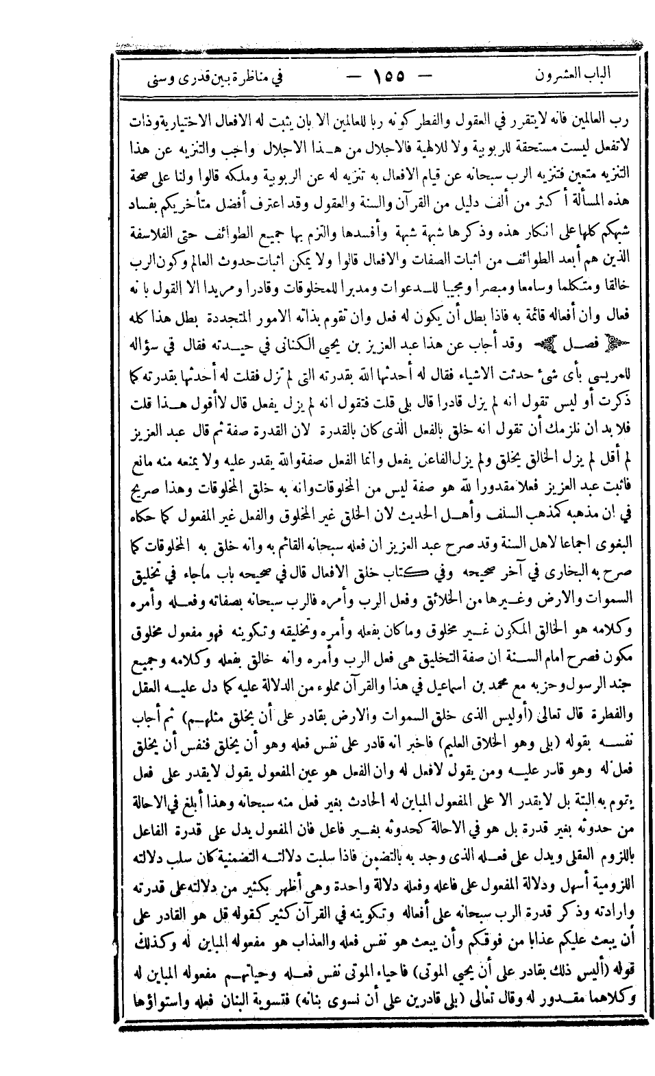 فصل: وقد أجاب عن هذا عبد العزيز بن يحيى الكناني في حيدته فقال في سؤاله للمريسي: بأي شيء حدثت الأشياء فقال له أحدثها الله بقدرته التي لم تزل فقلت له أحدثها بقدرته كما ذكرت أو ليس تقول أنه لم يزل قادرا قال بلى قلت فتقول أنه لم يزل يفعل قال لا أقول هذا قلت فلا بد أن نلزمك أن تقول أنه خلق بالفعل الذي كان بالقدرة لأن القدرة صفة ثم قال عبد العزيز لم أقل لم يزل الخالق يخلق ولم يزل الفاعل يفعل وإنما الفعل صفة والله يقدر عليه ولا يمنعه منه مانع فأثبت عبد العزيز فعلا مقدورا لله هو صفة ليس من المخلوقات وأنه به خلق المخلوقات وهذا صريح في أن مذهبه كمذهب السلف وأهل الحديث لأن الخلق غير المخلوق والفعل غير المفعول كما حكاه البغوي إجماعا لأهل السنة وقد صرح عبد العزيز أن فعله سبحانه القائم به وأنه خلق به المخلوقات كما صرح به البخاري في آخر صحيحه وفي كتاب خلق الأفعال قال في صحيحه باب ما جاء في تخليق السماوات والأرض وغيرها من الخلائق وفعل الرب وأمره فالرب سبحانه بصفاته وفعله وأمره وكلامه هو الخالق المكون غير مخلوق وما كان بفعله وأمره وتخليقه وتكوينه فهو مفعول مخلوق مكون فصرح إمام السنة أن صفة التخليق هي فعل الرب وأمره وأنه خالق بفعله وكلامه وجميع جند الرسول وحزبه مع محمد بن إسماعيل في هذا والقرآن مملوء من الدلالة عليه كما دل عليه العقل والفطرة قال تعالى: {أَوَلَيْسَ الَّذِي خَلَقَ السَّمَاوَاتِ وَالأَرْضَ بِقَادِرٍ عَلَى أَنْ يَخْلُقَ مِثْلَهُمْ} ثم أجاب نفسه بقوله: {بَلَى وَهُوَ الْخَلاَّقُ الْعَلِيمُ} فأخبر أنه قادر على نفس فعله وهو أن يخلق فنفس أن يخلق فعل له وهو قادر عليه ومن يقول لا فعل له وأن الفعل هو عين المفعول يقول لا يقدر على فعل يقوم به البتة بل لا يقدر إلا على المفعول المباين له الحادث بغير فعل منه سبحانه وهذا أبلغ في الإحالة من حدوثه بغير قدرة بل هو في الإحالة كحدوثه بغير فاعل فإن المفعول يدل على قدرة الفاعل باللزوم العقلي ويدل على فعله الذي وجد به بالتضمن فإذا سلبت دلالته التضمنية كان سلب دلالته اللزومية أسهل ودلالة المفعول على فاعله وفعله دلالة واحدة وهي أظهر بكثير من دلالته قدرته وإرادته في القرآن كثير كقوله: {قُلْ هُوَ الْقَادِرُ عَلَى أَنْ يَبْعَثَ عَلَيْكُمْ عَذَاباً مِنْ فَوْقِكُمْ} وأن يبعث هو نفس فعله والعذاب هو مفعوله المباين له وكذلك قو4له: {أَلَيْسَ ذَلِكَ بِقَادِرٍ عَلَى أَنْ يُحْيِيَ الْمَوْتَى} فإحياء الموتى نفس فعله وحياتهم مفعوله المباين له وكلاهما مقدور له وقال تعالى: {بَلَى قَادِرِينَ عَلَى أَنْ نُسَوِّيَ بَنَانَهُ} فتسوية البنان فعله واستواؤها