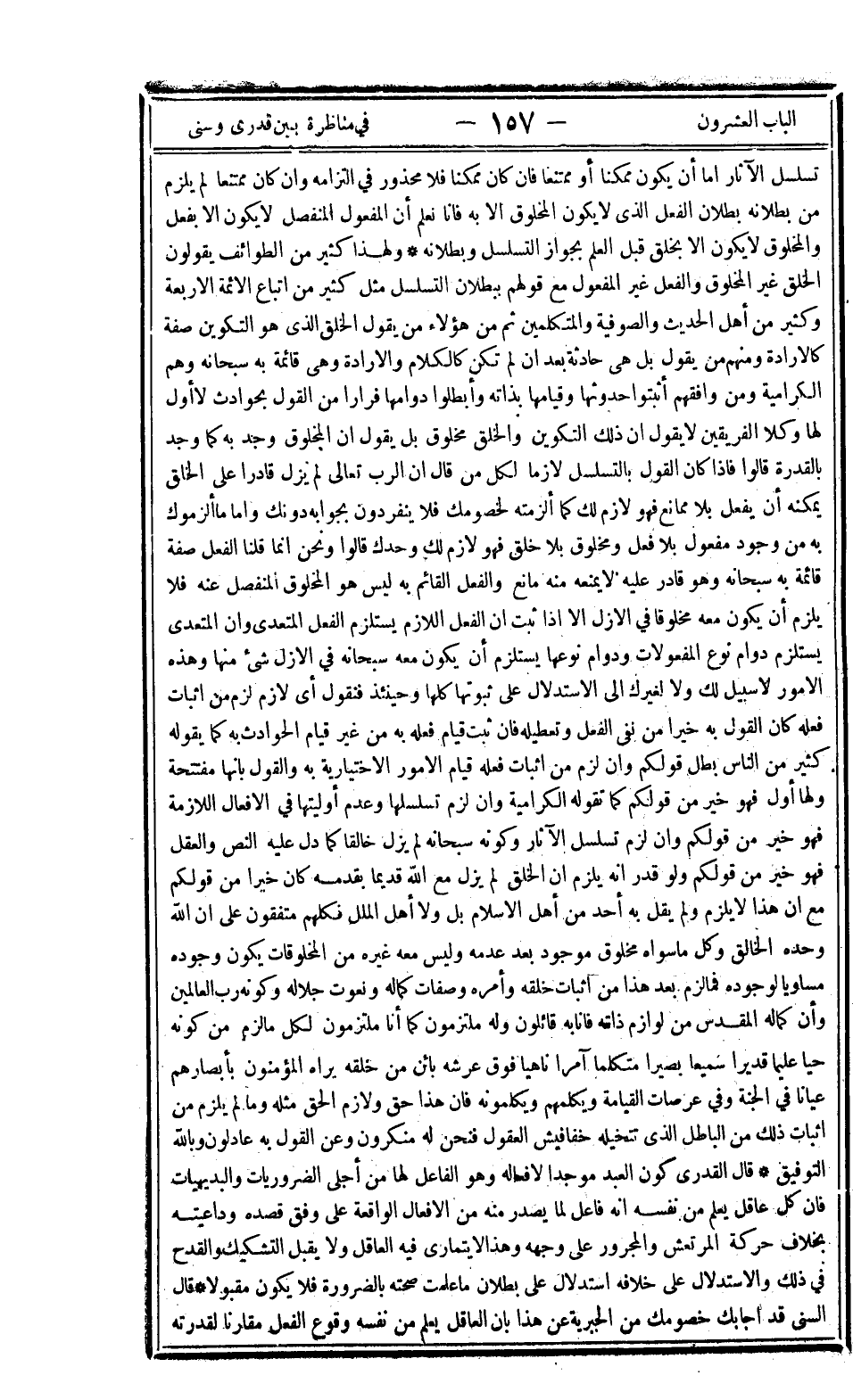 تسلسل الآثار إما أن يكون ممكنا أو ممتنعا فإن كان ممكنا فلا محذور في التزامه وإن كان ممتنعا لم يلزم من بطلانه بطلان الفعل الذي لا يكون المخلوق إلا به فإنا نعلم أن المفعول المنفصل لا يكون إلا بفعل والمخلوق لا يكون إلا بخلق قبل العلم بجواز التسلسل وبطلانه، ولهذا كثير من الطوائف يقولون الخلق غير المخلوق والفعل غير المفعول مع قولهم ببطلان التسلسل مثل كثير من أتباع الأئمة الأربعة وكثير من أهل الحديث والصوفية والمتكلمين ثم من هؤلاء من يقول الخلق الذي هو التكوين صفة كالإرادة ومنهم من يقول بل هي حادثة بعد أن لم تكن كالكلام والإرادة وهي قائمة به سبحانه وهم الكرامية ومن وافقهم أثبتوا حدوثها وقيامها بذاته وأبطلوا دوامها فرارا من القول بحوادث لا أول لها وكلا الفريقين يقول أن ذلك التكوين والخلق مخلوق بل يقول أن المخلوق وجد به كما وجد بالقدرة قالوا فإذا كان القول بالتسلسل لازما لكل من قال أن الرب تعالى لم يزل قادرا على الخلق يمكنه أن يفعل بلا ممانع فهو لازم لك كما ألزمته لخصومك فلا ينفردون بجوابه دونك وأما ما ألزموك به من وجود مفعول بلا فعل ومخلوق بلا خلق فهو لازم لك وحدك قالوا ونحن إنما قلنا الفعل صفة قائمة به سبحانه وهو قادر عليه لا يمنعه منه مانع والفعل القائم به ليس هو المخلوق المنفصل عنه فلا يلزم أن يكون معه مخلوقا في الأزل إلا إذا ثبت أن الفعل اللازم يستلزم الفعل المتعدي وأن المتعدي يستلزم دوام نوع المفعولات ودوام نوعها يستلزم أن يكون معه سبحانه في الأزل شيء منها وهذه الأمور لا سبيل لك ولا لغيرك إلى الاستدلال على ثبوتها كلها وحينئذ فنقول أي لازم لزم من إثبات فعله كان القول به خيرا من نفي الفعل وتعطيله فإن ثبت قيام فعله به من غير قيام الحوادث به كما يقوله كثير من الناس بطل قولكم وإن لزم من إثبات فعله قيام الأمور الاختيارية به والقول بأنها مفتتحة ولها أول فهو خير من قولكم كما تقوله الكرامية وإن لزم تسلسلها وعدم أوليتها في الأفعال اللازمة فهو خير من قولكم وإن لزم تسلسل الآثار وكونه سبحانه لم يزل خالقا كما دل عليه النص والعقل فهو خير من قولكم ولو قدر أنه يلزم أن الخلق لم يزل مع الله قديما بقدمه كان خيرا من قولكم مع أن هذا لا يلزم ولم يقل به أحد من أهل الإسلام بل ولا أهل الملل فكلهم متفقون على أن الله وحده الخالق وكل ما سواه مخلوق موجود بعد عدمه وليس معه غيره من المخلوقات يكون وجوده مساويا لوجوده فما لزم بعد هذا من إثبات خلقه وأمره وصفات كماله ونعوت جلاله وكونه رب العالمين وأن كماله المقدس من لوازم ذاته فإنا به قائلون وله ملتزمون كما إنا ملتزمون لكل ما لزم من كونه حيا عليما قديرا سميعا بصيرا متكلما آمرا ناهيا فوق عرشه بائن من خلقه يراه المؤمنون بأبصارهم عيانا في الجنة وفي عرصات القيامة ويكلمهم ويكلمونه فإن هذا حق ولازم الحق مثله وما لم يلزم من إثبات ذلك من الباطل الذي تتخيله خفافيش العقول فنحن له منكرون وعن القول به عادلون وبالله التوفيق، قال القدري: كون العبد موجدا لأفعاله وهو الفاعل لها من أجل الضروريات والبديهيات فإن كل عاقل يعلم من نفسه أنه فاعل لما يصدر منه من الأفعال الواقعة على وفق قصده وداعيته بخلاف حركة المرتعش والمجرور على وجهه وهذا لا يتمارى فيه العاقل ولا يقبل التشكيك والقدح في ذلك والاستدلال على خلافه استدلال على بطلان ما علمت صحته بالضرورة فلا يكون مقبولا، قال السني: قد أجابك خصومك من الجبرية عن هذا بأن العاقل يعلم من نفسه وقوع الفعل مقارنا لقدرته