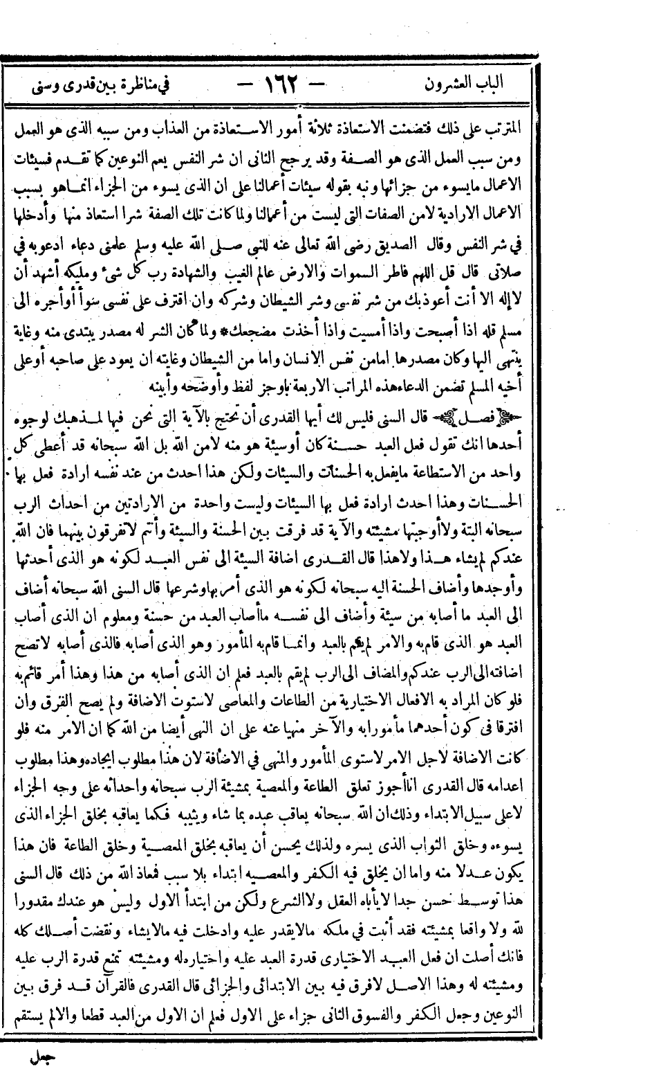 المترتب على ذلك فتضمنت الاستعاذة ثلاثة أمور الاستعاذة من العذاب ومن سببه الذي هو العمل ومن سبب العمل الذي هو الصفة وقد يرجح الثاني أن شر النفس يعم النوعين كما تقدم فسيئات الأعمال ما يسوء من جزائها ونبه بقوله: "سيئات أعمالنا" على أن الذي يسوء من الجزاء إنما هو بسبب الأعمال الإرادية لا من الصفات التي ليست من أعمالنا ولما كانت تلك الصفة شرا استعاذ منها وأدخلها في شر النفس وقال الصديق رضي الله تعالى عن النبي صلى الله عليه وسلم علمني دعاء أدعو به في صلاتي قال: "قل اللهم فاطر االسماوات والأرض عالم الغيب والشهادة رب كل شيء ومليكه أشهد أن لا إله إلا أنت أعوذ بك من شر نفسي وشر الشيطان وشركه وأن أقترف على نفسي سوأ أو أجره إلى مسلم قله إذا أصبحت وإذا أمسيت وإذا أخذت مضجعك"، ولما كان الشر له مصدر يبتدي منه وغاية ينتهي إليها وكان مصدرها إما من نفس الإنسان وإما من الشيطان وغايته أن يعود على صاحبه أو على أخيه المسلم تضمن الدعاء هذه المراتب الأربعة بأوجز لفظ وأوضحه وأبينه.
