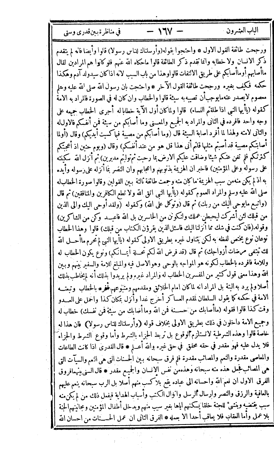 ورجحت طائفة القول الأول، واحتجوا بقوله: {وَأَرْسَلْنَاكَ لِلنَّاسِ رَسُولاً} قالوا وأيضا فإنه لم يتقدم ذكر الإنسان ولا خطابه وإنما تقدم ذكر الطائفة قالوا ما حكاه الله عنهم فلو كانوا هم المرادين لقال ما أصابهم أو ما أصابكم على طريق الالتفات قالوا وهذا من باب السبب لأنه إذا كان سيد ولد آدم وهكذا حكمه فكيف بغيره ورجحت طائفة القول الآخر، واحتجت بأن رسول الله صلى الله عليه وسلم وعلم معصوم لا يصدر عنه ما يوجب أن تصيبه به سيئة قالوا والخطاب وإن كان له في الصورة فالمراد به الأمة كقوله: {يَا أَيُّهَا النَّبِيُّ إِذَا طَلَّقْتُمُ النِّسَاءَ} قالوا ولما كان أول الآية خطابا له أجرى الخطاب جميعه على وجه واحد فأفرده في الثاني والمراد به الجميع والمعنى وما أصابكم من سيئة فمن أنفسكم فالأول له والثاني لأمته ولهذا لما أفرد إصابة السيئة قال: {وَمَا أَصَابَكُمْ مِنْ مُصِيبَةٍ فَبِمَا كَسَبَتْ أَيْدِيكُمْ} وقال: {أَوَلَمَّا أَصَابَتْكُمْ مُصِيبَةٌ قَدْ أَصَبْتُمْ مِثْلَيْهَا قُلْتُمْ أَنَّى هَذَا قُلْ هُوَ مِنْ عِنْدِ أَنْفُسِكُمْ} وقال: {وَيَوْمَ حُنَيْنٍ إِذْ أَعْجَبَتْكُمْ كَثْرَتُكُمْ فَلَمْ تُغْنِ عَنْكُمْ شَيْئاً وَضَاقَتْ عَلَيْكُمُ الْأَرْضُ بِمَا رَحُبَتْ ثُمَّ وَلَّيْتُمْ مُدْبِرِينَ ثُمَّ أَنْزَلَ اللَّهُ سَكِينَتَهُ عَلَى رَسُولِهِ وَعَلَى الْمُؤْمِنِينَ} فأخبر أن الهزيمة بذنوبهم وإعجابهم وأن النصر بما أنزله على رسوله وأيده به إذ لم يكن منه من سبب الهزيمة ما كان منه وجمعت طائفة ثالثة بين القولين وقالوا صورة الخطاب له صلى الله عليه وسلم والمراد العموم كقوله: {يَا أَيُّهَا النَّبِيُّ اتَّقِ اللَّهَ وَلا تُطِعِ الْكَافِرِينَ وَالْمُنَافِقِينَ} ثم قال: {وَاتَّبِعْ مَا يُوحَى إِلَيْكَ مِنْ رَبِّكَ} ثم قال: {وَتَوَكَّلْ عَلَى اللَّهِ} وكقوله: {وَلَقَدْ أُوحِيَ إِلَيْكَ وَإِلَى الَّذِينَ مِنْ قَبْلِكَ لَئِنْ أَشْرَكْتَ لَيَحْبَطَنَّ عَمَلُكَ وَلَتَكُونَنَّ مِنَ الْخَاسِرِينَ بَلِ اللَّهَ فَاعْبُدْ وَكُنْ مِنَ الشَّاكِرِينَ} وقوله: {فَإِنْ كُنْتَ فِي شَكٍّ مِمَّا أَنْزَلْنَا إِلَيْكَ فَاسْأَلِ الَّذِينَ يَقْرَأُونَ الْكِتَابَ مِنْ قَبْلِكَ} قالوا وهذا الخطاب نوعان نوع يختص لفظه به لكن يتناول غيره بطريق الأولى كقوله: {يَا أَيُّهَا النَّبِيُّ لِمَ تُحَرِّمُ مَا أَحَلَّ اللَّهُ لَكَ تَبْتَغِي مَرْضَاتَ أَزْوَاجِكَ} ثم قال: {قَدْ فَرَضَ اللَّهُ لَكُمْ تَحِلَّةَ أَيْمَانِكُمْ} ونوع يكون الخطاب له وللأمة فأفرده بالخطاب لكونه هو المواجه بالوحي وهو الأصل فيه والمبلغ للأمة والسفير بينهم وبين الله وهذا معنى قول كثير من المفسرين الخطاب له والمراد غيره ولم يريدوا بذلك أنه لم يخاطب بذلك أصلا ولم يرد به البتة بل المراد أنه لما كان إمام الخلائق ومقدمهم ومتبوعهم أفرد بالخطاب وتبعته الأمة في حكمه كما يقول السلطان لمقدم العساكر أخرج غدا وأنزل بمكان كذا وأحمل على العدو وقت كذا قالوا فقوله: {مَا أَصَابَكَ مِنْ حَسَنَةٍ فَمِنَ اللَّهِ وَمَا أَصَابَكَ مِنْ سَيِّئَةٍ فَمِنْ نَفْسِكَ} خطاب له وجميع الأمة داخلون في ذلك بطريق الأولى بخلاف قوله: {وَأَرْسَلْنَاكَ لِلنَّاسِ رَسُولاً} فإن هذا له خاصة قالوا وهذه الشرطية لا تستلزم الوقوع بل تربط الجزاء بالشرط وأما وقوع الشرط والجزاء فلا يدل عليه فهو مقدر في حقه محقق في غيره والله أعلم، قال القدري: إذا كانت الطاعات والمعاصي مقدرة والنعم والمصائب مقدرة فلم فرق سبحانه بين الحسنات التي هي النعم والسيئات التي هي المصائب فجعل هذه منه سبحانه وهذه من نفس الإنسان والجميع مقدر، قال السني: بينهما فروق الفرق الأول أن نعم الله وإحسانه إلى عباده يقع بلا كسب منهم أصلا بل الرب سبحانه ينعم عليهم بالعافية والرزق والنصر وإرسال الرسل وإنزال الكتب وأسباب الهداية فيفعل ذلك من لم يكن منه سبب يقتضيه وينشئ للجنة خلقا يسكنهم إياها بغير سبب منهم 