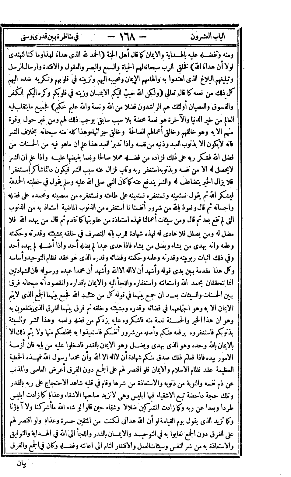ومنه وتفضله عليه بالهداية والإيمان كما قال أهل الجنة: {الْحَمْدُ لِلَّهِ الَّذِي هَدَانَا لِهَذَا وَمَا كُنَّا لِنَهْتَدِيَ لَوْلا أَنْ هَدَانَا اللَّهُ} فخلق الرب سبحانه لهم الحياة والسمع والبصر والعقول والأفئدة وإرسال الرسل وتبليغهم البلاغ الذي اهتدوا به وإلهامهم الإيمان وتحبيبه إليهم وتزيينه في قلوبهم وتكريه ضده إليهم كل ذلك من نعمه كما قال تعالى: {وَلَكِنَّ اللَّهَ حَبَّبَ إِلَيْكُمُ الإِيمَانَ وَزَيَّنَهُ فِي قُلُوبِكُمْ وَكَرَّهَ إِلَيْكُمُ الْكُفْرَ وَالْفُسُوقَ وَالْعِصْيَانَ أُولَئِكَ هُمُ الرَّاشِدُونَ فَضْلاً مِنَ اللَّهِ وَنِعْمَةً وَاللَّهُ عَلِيمٌ حَكِيمٌ} فجميع ما يتقلب فيه العالم من خير الدنيا والآخرة هو نعمة محضة بلا سبب سابق يوجب ذلك لهم ومن غير حول وقوة منهم إلا به وهو خالقهم وخالق أعمالهم الصالحة وخالق جزائها وهذا كله منه سبحانه بخلاف الشر فإنه لا يكون إلا بذنوب العبد وذنبه من نفسه وإذا تدبر العبد هذا علم أن ما هو فيه من الحسنات من فضل الله فشكر ربه على ذلك فزاده من فضله عملا صالحا ونعما يفيضها عليه وإذا علم أن الشر لا يحصل له إلا من نفسه وبذنوبه استغفر ربه وتاب فزال عنه سبب الشر فيكون دائما شاكرا مستغفرا فلا يزال الخير يتضاعف له والشر يندفع عنه كما كان النبي صلى الله عليه وسلم يقول في خطبته الحمد لله فيشكر الله ثم يقول نستعينه ونستغفره نستعينه على طاعته ونستغفره من معصيته ونحمده على فعله وإحسانه ثم قال ونعوذ بالله من شرور أنفسنا لما استغفره من الذنوب الماضية استعاذ به من الذنوب التي لم تقع بعد ثم قال ومن سيئات أعمالنا فهذه استعاذة من عقوبتها كما تقدم ثم قال من يهده الله فلا مضل له ومن يضلل فلا هادي له فهذه شهادة للرب بأنه المتصرف في خلقه بمشيئته وقدرته وحكمته وعلمه وأنه يهدي من يشاء ويضل من يشاء فإذا هدى عبدا لم يضله أحد وإذا أضله لم يهده أحد وفي ذلك إثبات ربوبيته وقدرته وعلمه وحكمته وقضائه وقدره الذي هو عقد نظام التوحيد وأساسه وكل هذا مقدمة بين يدي قوله وأشهد أن لا إله إلا الله وأشهد أن محمدا عبده ورسوله فإن الشهادتين إنما تتحققان بحمد الله واستعانته واستغفاره واللجأ إليه والإيمان بأقداره والمقصود أنه سبحانه فرق بين الحسنات والسيئات بعد أن جمع بينهما في قوله كل من عند الله فجمع بينهما الجمع الذي لا يتم الإيمان إلا به وهو اجتماعهما في قضائه وقدره ومشيئته وخلقه ثم فرق بينهما الفرق الذي ينتفعون به وهو أن هذا الخير والحسنة نعمة منه فاشكروه عليه يزدكم من فضله ونعمه وهذا الشر والسيئة بذنوبكم فاستغفروه يرفعه عنكم وأصله من شرور أنفسكم فاستعيذوا به يخلصكم منها ولا يتم ذلك إلا بالإيمان بالله وحده وهو الذي يهدي ويضل وهو الإيمان بالقدر فادخلوا عليه من بابه فإن أزمة الأمور بيده فإذا فعلتم ذلك صدق منكم شهادة أن لا إله إلا الله وأن محمدا رسول الله فهذه الخطبة العظيمة عقد نظام الإسلام والإيمان فلو اقتصر لهم على الجمع دون الفرق أعرض العاصي والمذنب عن ذم نفسه والتوبة من ذنوبه والاستعاذة من شرها وقام في قلبه شاهد الاحتجاج على ربه بالقدر وتلك حجة داحضة تبع الأشقياء فيها إبليس وهي لا تزيد صاحبها إلا شقاء وعذابا كما زادت إبليس طردا وبعدا عن ربه وكما زادت المشركين ضلالا وشقاء حين قالوا لو شاء الله ما أشركنا ولا آباؤنا وكما تزيد الذي يقول يوم القيامة لو أن الله هداني لكنت من المتقين حسرة وعذابا ولو اقتصر لهم على الفرق دون الجمع لغابوا به في التوحيد والإيمان بالقدر واللجأ إلى الله في الهداية والتوفيق والاستعاذة به من شر النفس وسيئات العمل والافتقار التام إلى إعانته وفضله وكان في الجمع والفرق
