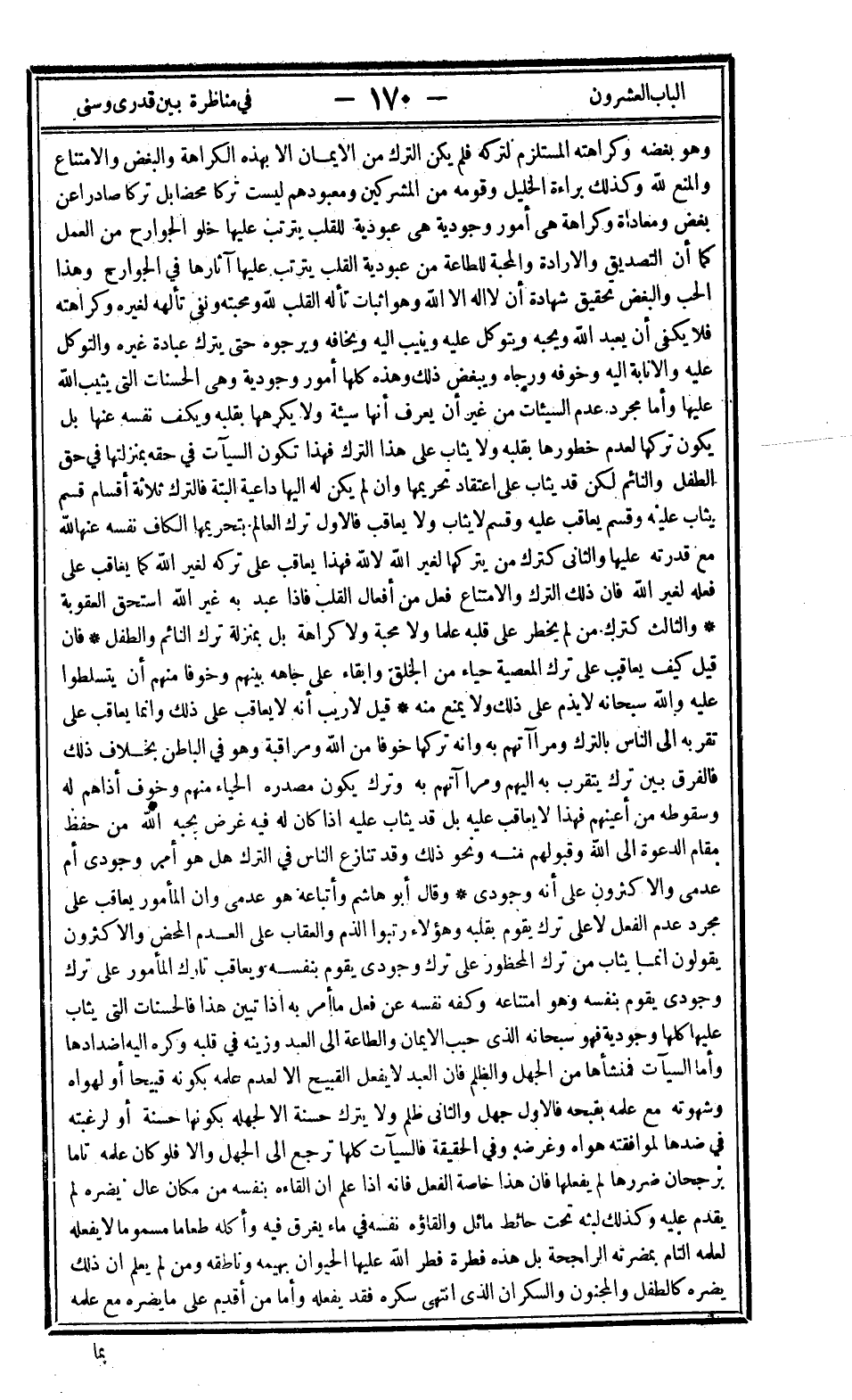 وهو بغضه وكراهته المستلزم لتركه فلم يكن الترك من الإيمان إلا بهذه الكراهة والبغض والامتناع والمنع لله وكذلك براءة الخليل وقومه من المشركين ومعبودهم ليست تركا محضا بل تركا صادرا عن بغض ومعاداة وكراهة هي أمور وجودية هي عبودية للقلب يترتب عليها خلو الجوارح من العمل كما أن التصديق والإرادة والمحبة للطاعة من عبودية القلب يترتب عليها آثارها في الجوارح وهذا الحب والبغض تحقيق شهادة أن لا إله إلا الله وهو إثبات تأله القلب لله ومحبته ونفي تألهه لغيره وكراهته فلا يكفي أن يعبد الله ويحبه ويتوكل عليه وينيب إليه ويخافه ويرجوه حتى يترك عبادة غيره والتوكل عليه والإنابة إليه وخوفه ورجاه ويبغض ذلك وهذه كلها أمور وجودية وهي الحسنات التي يثيب الله عليها وأما مجرد عدم السيئات من غير أن يعرف أنها سيئة ولا يكرهها بقلبه ويكف نفسه عنها بل يكون تركها لعدم خطورها بقلبه ولا يثاب على هذا الترك فهذا تكون السيئات في حقه بمنزلتها في حق الطفل والنائم لكن قد يثاب على اعتقاد تحريمها وإن لم يكن له إليها داعية البتة فالترك ثلاثة أقسام قسم يثاب عليه وقسم يعاقب عليه وقسم لا يثاب ولا يعاقب عليه فالأول ترك العالم بتحريمها الكاف نفسه عنها لله مع قدرته عليها والثاني كترك من يتركها لغير الله لا لله فهذا يعاقب على تركه لغير الله كما يعاقب على فعله لغير الله فإن ذلك الترك والامتناع فعل من أفعال القلب فإذا عبد به غير الله استحق العقوبة، والثالث كترك من لم يخطر على قلبه علما ولا محبة ولا كراهة بل بمنزلة ترك النائم والطفل، فإن قيل كيف يعاقب على ترك المعصية حياء من الخلق وإبقاء على جاهه بينهم وخوفا منهم أن يتسلطوا عليه والله سبحانه لا يذم على ذلك ولا يمنع منه، قيل لا ريب أنه لا يعاقب على ذلك وإنما يعاقب على تقربه إلى الناس بالترك ومرآتهم به وأنه تركها خوفا من الله ومراقبة وهو في الباطن بخلاف ذلك فالفرق بين ترك يتقرب به إليهم ومرآتهم به وترك يكون مصدره الحياء منهم وخوف أذاهم له وسقوطه من أعينهم فهذا لا يعاقب عليه بل قد يثاب عليه إذا كان له فيه غرض يحبه الله من حفظ مقام الدعوة إلى الله وقبولهم منه ونحو ذلك وقد تنازع الناس في الترك هل هو أمر وجودي أم عدمي والأكثرون على أنه وجودي، وقال أبو هاشم وأتباعه هو عدمي وأن المأمور يعاقب على مجرد عدم الفعل لا على ترك يقوم بقلبه وهؤلاء رتبوا الذم والعقاب على العدم المحض والأكثرون يقولون إنما يثاب من ترك المحظور على ترك وجودي يقوم بنفسه ويعاقب تارك المأمور على ترك وجودي يقوم بنفسه وهو امتناعه وكفه نفسه عن فعل ما أمر به إذا تبين هذا فالحسنات التي يثاب عليها كلها وجودية فهو سبحانه الذي حبب الإيمان والطاعة إلى العبد وزينه في قلبه وكره إليه أضدادها وأما السيئات فمنشأها من الجهل والظلم فإن العبد لا يفعل القبيح إلا لعدم علمه بكونه قبيحا أو لهواه وشهوته مع علمه بقبحه فالأول جهل والثاني ظلم ولا يترك حسنة إلا لجهله بكونها حسنة أو لرغبته في ضدها لموافقته هواه وغرضه وفي الحقيقة فالسيئات كلها ترجع إلى الجهل وإلا فلو كان علمه تاما برجحان ضررها لم يفعلها فإن هذا خاصة الفعل فإنه إذا علم أن إلقاءه من مكان عال يضره لم يقدم عليه وكذلك لبثه تحت حائط مائل وإلقاءه نفسه في ماء يغرق فيه وأكله طعاما مسموما ولا يفعله لعلمه التام بمضرته الراجحة بل هذه فطرة فطر الله عليها الحيوان بهيمة وناطقة ومن لم يعلم أن ذلك يضره كالطفل والمجنون والسكران الذي انتهى سكره فقد يفعله وأما من أقدم على ما يضره مع علمه