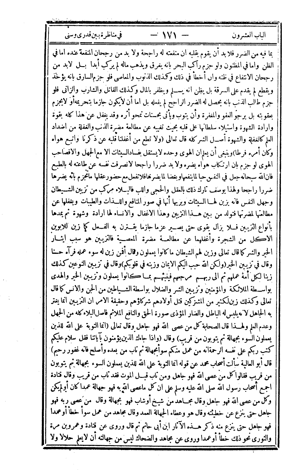 بما فيه من الضرر فلا بد أن يقوم بقلبه أن منفعته له راجحة ولا بد من رجحان المنفعة عنده إما في الظن وإما في المظنون ولو جزم راكب البحر بأنه يغرق ويذهب ماله لم يركب أبدا بل لا بد من رجحان الانتفاع في ظنه وإن أخطأ في ذلك وكذلك الذنوب والمعاصي فلو جزم السارق بأنه يؤخذ ويقطع لم يقدم على السرقة بل يظن أنه يسلم ويظفر بالمال وكذلك القاتل والشارب والزاني فلو جزم طالب الذنب بأنه يحصل له الضرر الراجح لم يفعله بل إما أن لا يكون جازما بتحريمه أو لا يجزم بعقوبته بل يرجو العفو والمغفرة وأن يتوب ويأتي بحسنات تمحو أثره وقد يغفل عن هذا كله بقوة وإرادة الشهوة واستيلاء سلطانها على قلبه بحيث تغيبه عن مطالعة مضرة الذنب والغفلة من أضداد العلم كالغفلة والشهوة أصل الشر كله قال تعالى: {وَلا تُطِعْ مَنْ أَغْفَلْنَا قَلْبَهُ عَنْ ذِكْرِنَا وَاتَّبَعَ هَوَاهُ وَكَانَ أَمْرُهُ فُرُطاً} وينبغي أن يعلم أن الهوى وحده لا يستقل بفساد السيئات إلا مع الجهل وإلا فصاحب الهوى لو جزم بأن ارتكاب هواه يضره ولا بد ضررا راجحا لانصرفت نفسه عن طاعته له بالطبع فإن الله سبحانه جعل في النفس حبا لما ينفعها وبغضا لما يضرها فلا تفعل مع حضور عقلها ما تجزم بأنه يضرها ضررا راجحا ولهذا يوصف تارك ذلك بالعقل والحجى واللب فالبلاء مركب من تزيين الشيطان وجهل النفس فإنه يزين لها السيئات ويريها أنها في صور المنافع واللذات والطيبات ويغفلها عن مطالعتها لمضرتها فتولد من بين هذا التزيين وهذا الإغفال والإنساء لها إرادة وشهوة ثم يمدها بأنواع التزيين فلا يزال يقوى حتى يصير عزما جازما يقترن به الفعل كما زين للأبوين الأكل من الشجرة وأغفلهما عن مطالعة مضرة المعصية فالتزيين هو سبب إيثار الخير والشر كما قال تعالى: {وَزَيَّنَ لَهُمُ الشَّيْطَانُ مَا كَانُوا يَعْمَلُونَ} وقال: {أَفَمَنْ زُيِّنَ لَهُ سُوءُ عَمَلِهِ فَرَآهُ حَسَناً} وقال في تزيين الخير: {وَلَكِنَّ اللَّهَ حَبَّبَ إِلَيْكُمُ الإِيمَانَ وَزَيَّنَهُ فِي قُلُوبِكُمْ} وقال في تزيين النوعين: {كَذَلِكَ زَيَّنَّا لِكُلِّ أُمَّةٍ عَمَلَهُمْ ثُمَّ إِلَى رَبِّهِمْ مَرْجِعُهُمْ فَيُنَبِّئُهُمْ بِمَا كَانُوا يَعْمَلُونَ} وتزيين الخير والهدى بواسطة الملائكة والمؤمنين وتزيين الشر والضلال بواسطة الشياطين من الجن والإنس كما قال تعالى: {وَكَذَلِكَ زَيَّنَ لِكَثِيرٍ مِنَ الْمُشْرِكِينَ قَتْلَ أَوْلادِهِمْ شُرَكَاؤُهُمْ} وحقيقة الأمر أن التزيين إنما يغتر به الجاهل لأنه يلبس له الباطل والضار المؤذي صورة الحق والنافع الملائم فأصل البلاء كله من الجهل وعدم العلم ولهذا قال الصحابة كل من عصى الله فهو جاهل وقال تعالى: {إِنَّمَا التَّوْبَةُ عَلَى اللَّهِ لِلَّذِينَ يَعْمَلُونَ السُّوءَ بِجَهَالَةٍ ثُمَّ يَتُوبُونَ مِنْ قَرِيبٍ} وقال: {وَإِذَا جَاءَكَ الَّذِينَ يُؤْمِنُونَ بِآياتِنَا فَقُلْ سَلامٌ عَلَيْكُمْ كَتَبَ رَبُّكُمْ عَلَى نَفْسِهِ الرَّحْمَةَ أَنَّهُ مَنْ عَمِلَ مِنْكُمْ سُوءاً بِجَهَالَةٍ ثُمَّ تَابَ مِنْ بَعْدِهِ وَأَصْلَحَ فَأَنَّهُ غَفُورٌ رَحِيمٌ} قال أبو العالية: "سألت أصحاب محمد عن قوله: {إِنَّمَا التَّوْبَةُ عَلَى اللَّهِ لِلَّذِينَ يَعْمَلُونَ السُّوءَ بِجَهَالَةٍ ثُمَّ يَتُوبُونَ مِنْ قَرِيبٍ} فقالوا: كل من عصى الله فهو جاهل ومن تاب قبل الموت فقد تاب من قريب" وقال قتادة: "أجمع أصحاب رسول الله صلى الله عليه وسلم على أن كل ما عصي الله به فهو جهالة عمدا كان أو لم يكن وكل من عصى الله فهو جاهل" وقال مجاهد: "من شيخ أو شاب فهو بجهالة" وقال: "من عصى ربه فهو جاهل حتى ينزع عن خطيئته" وقال هو وعطاء: "الجهالة العمد" وقال مجاهد: "من عمل سوأ خطأ أو عمدا فهو جاهل حتى ينزع منه" ذكر هذه الآثار ابن أبي حاتم ثم قال وروي عن قتادة وعمرو بن مرة والثوري نحو ذلك خطأ أو عمدا وروي عن مجاهد والضحاك: "ليس من جهالته أن لا يعلم حلالا ولا