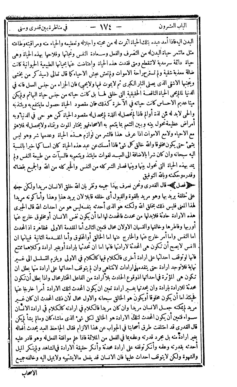 فصل: قال القدري: ونحن نعرف بهذا جميعه ونقر بأن الله خلق الإنسان مريدا ولكن جعله على خلقة يريد بها وهو مريد بالقوة والقبول أي خلقه قابلا لأن يريد هذا وهذا وأما كونه مريدا لهذا المعنى فليس ذلك بخلق الله ولكنه هو الذي أحدثه بنفسه ليس هو من إحداث الله قال الجبري: هذه الإرادة حادثة فلا بد لها من محدث فالمحدث لها إما أن يكون نفس الإنسان أو مخلوق خارج عنها أو ربها وفاطرها وخالقها والقسمان الأولان محال فتعين الثالث أما المقدمة الأولى فظاهرة إذ المحدث إما النفس وإما أمر خارج عنها والخارج عنها إما الخالق أو المخلوق وأما المقدمة الثانية فبيانها أن النفس لا يصح أن تكون هي المحدثة لإرادتها فإنها إما أن تحدثها بإرادة أو بغير إرادة وكلاهما ممتنع فإنها لو توقف إحداثها على إرادة أخرى فالكلام فيها كالكلام في الأولى ويلزم التسلسل إلى غير نهاية فلا توجد إرادة حتى يتقدمها إرادات لا تتناهى وإن لم يتوقف إحداثها على إرادة منها بطل أن تكون هي المؤثرة في إحداثها إذ وقوع الحادث بلا إرادة من الفاعل المختار محال وإذا بطل أن تكون محدثة للإرادة بإدارة وأن يحدثها بغير إرادة تعين أن يكون المحدث لتلك الإرادة أمرا خارجا عنها فحينئذ إما أن يكون مخلوقا أو يكون هو الخالق سبحانه والأول محال لأن ذلك المحدث إن كان غير مريد لم يمكنه جعل الإنسان مريدا وإن كان مريدا فالكلام في إرادته كالكلام في إرادة الإنسان سواء فتعين أن يكون المحدث لتلك الإرادة هو الخالق لكل شيء الذي ما شاء كان وما لم يشأ لم يكن قال القدري: قد اختلفت طرق أصحابنا في الجواب عن هذا الإلزام فقال الجاحظ: العبد يحدث أفعاله بغير إرادة منه بل مجرد قدرته وعلمه بما في الفعل من الملائمة فإذا علم موافقة الفعل له وهو قادر عليه أحدثه بقدرته وعلمه وأنكر توقفه على إرادة محدثه وأنكر حقيقة الإرادة في الشاهد ولم ينكر الميل والشهوة ولكن لا يتوقف إحداث عليها فإن الإنسان قد يفعل ما لا يشتهيه ولا يميل إليه وخالفه جميع