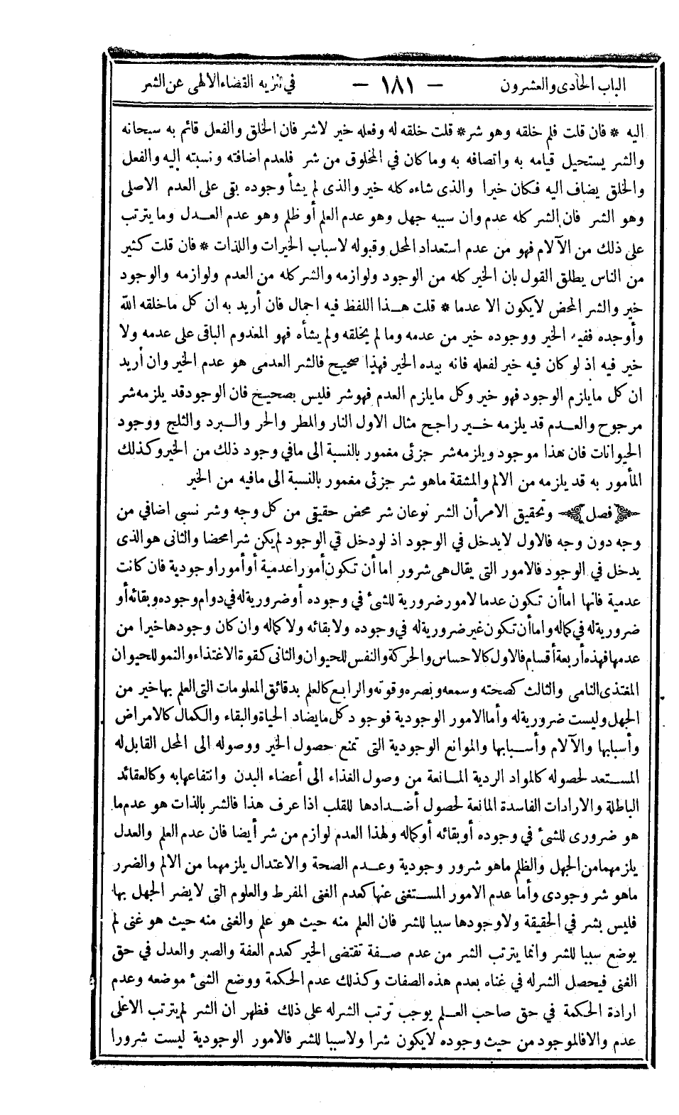 فصل: وتحقيق الأمر أن الشر نوعان شر محض حقيقي من كل وجه وشر نسبي إضافي من وجه دون وجه فالأول لا يدخل في الوجود إذ لو دخل في الوجود لم يكن شرا محضا والثاني هو الذي يدخل في الوجود فالأمور التي يقال هي شرور إما أن تكون أمورا عدمية أو أمورا وجودية فإن كانت عدمية فإنها إما أن تكون عدما لأمور ضرورية للشيء في وجوده أو ضرورية له في دوام وجوده وبقائه أو ضرورية له في كماله وإما أن تكون غير ضرورية له في وجوده ولا بقائه ولا كماله وإن كان وجودها خيرا من عدمها فهذه أربعة أقسام فالأول كالإحساس والحركة والنفس للحيوان والثاني كقوة الاغتذاء والنمو للحيوان المغتذي النامي والثالث كصحته وسمعه وبصره وقوته والرابع كالعلم بدقائق المعلومات التي العلم بها خير من الجهل وليست ضرورية له وأما الأمور الوجودية فوجود كل ما يضاد الحياة والبقاء والكمال كالأمراض وأسبابها والآلام وأسبابها والموانع الوجودية التي تمنع حصول الخير ووصوله إلى المحل القابل له المستعد لحصوله كالمواد الردية المانعة من وصول الغذاء إلى أعضاء البدن وانتفاعها به وكالعقائد الباطلة والإرادات الفاسدة المانعة لحصول أضدادها للقلب إذا عرف هذا فالشر بالذات هو عدم ما هو ضروري للشيء في وجوده أو بقائه أو كماله ولهذا العدم لوازم من شر أيضا فإن عدم العلم والعدل يلزمهما من الجهل والظلم ما هو شرور وجودية وعدم الصحة والاعتدال يلزمهما من الألم والضرر ما هو شر وجودي وأما عدم الأمور المستغنى عنها كعدم الغنى المفرط والعلوم التي لا يضر الجهل بها فليس بشر في الحقيقة ولا وجودها سببا للشر فإن العلم منه حيث هو علم والغنى منه حيث هو غنى لم يوضع سببا للشر وإنما يترتب الشر من عدم صفة تقتضي الخير كعدم العفة والصبر والعدل في حق الغنى فيحصل الشر له في غناه بعدم هذه الصفات وكذلك عدم الحكمة ووضع الشيء موضعه وعدم إرادة الحكمة في حق صاحب العلم يوجب ترتب الشر له على ذلك فظهر أن الشر لم يترتب إلا على عدم وإلا فالموجود من حيث وجوده لا يكون شرا ولا سببا للشر فالأمور الوجودية ليست شرورا