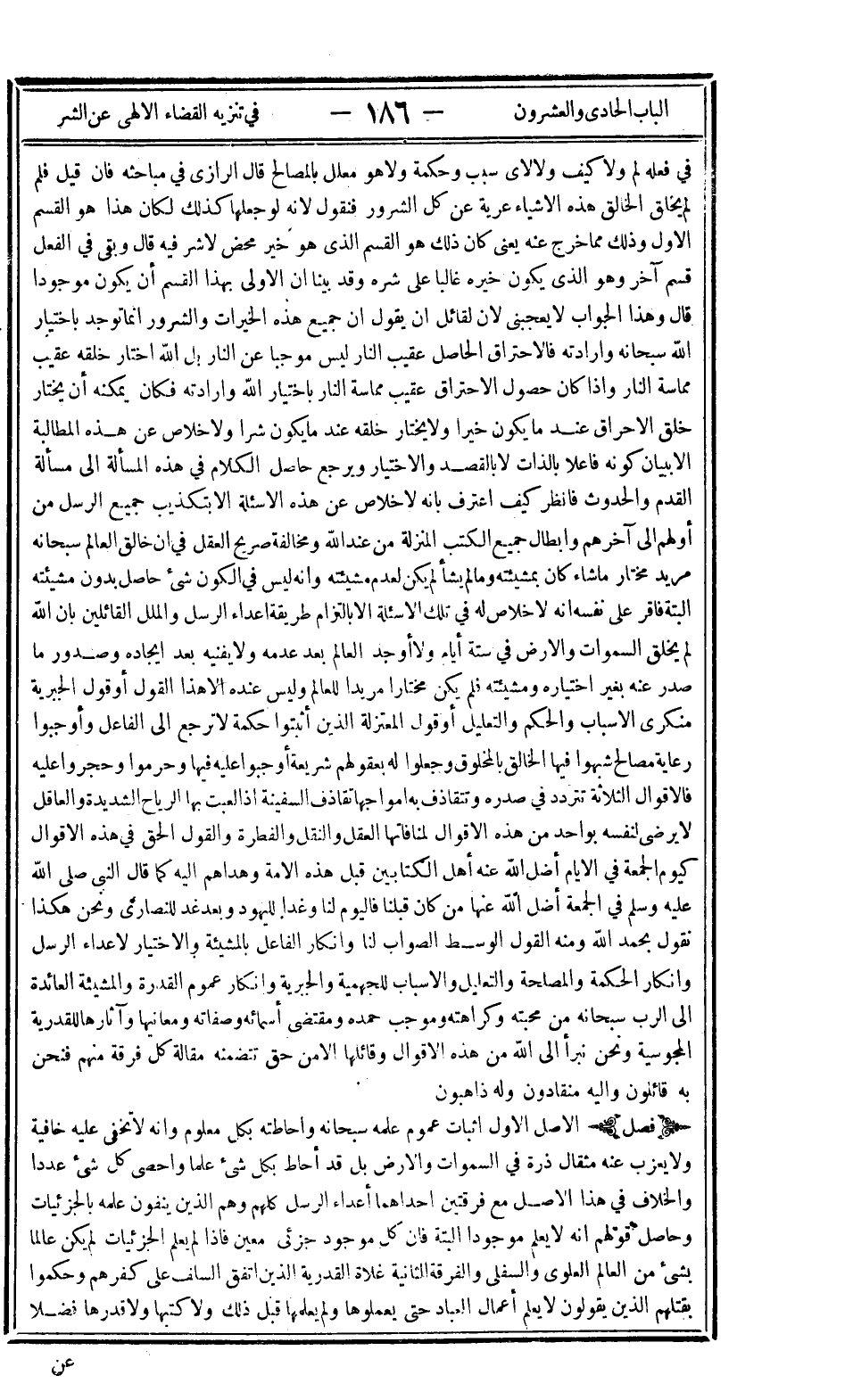 في فعله لم ولا كيف ولا لأي سبب وحكمة ولا هو معلل بالمصالح قال الرازي في مباحثه: "فإن قيل فلم لم يخلق الخالق هذه الأشياء عرية عن كل الشرور فنقول لأنه لو جعلها كذلك لكان هذا هو القسم الأول وذلك مما خرج عنه" يعني كان ذلك هو القسم الذي هو خير محض لا شر فيه قال: "وبقي في الفعل قسم آخر وهو الذي يكون خيره غالبا على شره" وقد بينا أن الأولى بهذا القسم أن يكون موجودا قال وهذا الجواب لا يعجبني لأن لقائل أن يقول أن جميع هذه الخيرات والشرور إنما توجد باختيار الله سبحانه وإرادته فالاحتراق الحاصل عقيب النار ليس موجبا عن النار بل الله اختار خلقه عقيب مماسة النار وإذا كان حصول الاحتراق عقيب مماسة النار باختيار الله وإرادته فكان يمكنه أن يختار خلق الإحراق عندما يكون خيرا ولا يختار خلقه عندما يكون شرا ولا خلاص عن هذه المطالبة إلا ببيان كونه فاعلا بالذات لا بالقصد والاختيار ويرجع حاصل الكلام في هذه المسألة إلى مسألة القدم والحدوث فانظر كيف اعترف بأنه لا خلاص عن هذه الأسئلة إلا بتكذيب جميع الرسل من أولهم إلى آخرهم وإبطال جميع الكتب المنزلة من عند الله ومخالفة صريح العقل في أن خالق العالم سبحانه مريد مختار ما شاء كان بمشيئته وما لم يشأ لم يكن لعدم مشيئته وأنه ليس في الكون شيء حاصل بدون مشيئته البتة فأقر على نفسه أنه لا خلاص له في تلك الأسئلة إلا بالتزام طريقة أعداء الرسل والملل القائلين بأن الله لم يخلق السماوات والأرض في ستة أيام ولا أوجد العالم بعد عدمه ولا يفنيه بعد إيجاده وصدور ما صدر عنه بغير اختياره ومشيئته فلم يكن مختارا مريدا للعالم وليس عنده إلا هذا القول أو قول الجبرية منكري الأسباب والحكم والتعليل أو قول المعتزلة الذين أثبتوا حكمة لا ترجع إلى الفاعل وأوجبوا رعاية مصالح شبهوا فيها الخالق بالمخلوق وجعلوا له بعقولهم شريعة أوجبوا عليه فيها وحرموا وحجروا عليه فالأقوال الثلاثة تتردد في صدره وتتقاذف به أمواجها تقاذف السفينة إذا لعبت بها الرياح الشديدة والعاقل لا يرضى لنفسه بواحد من هذه الأقوال لمنافاتها العقل والنقل والفطرة والقول الحق في هذه الأقوال كيوم الجمعة في الأيام أضل الله عنه أهل الكتابين قبل هذه الأمة وهداهم إليه كما قال النبي صلى الله عليه وسلم في الجمعة: "أضل الله عنها من كان قبلنا فاليوم لنا وغدا لليهود وبعد غد للنصارى" ونحن هكذا نقول بحمد الله ومنه القول الوسط الصواب لنا وإنكار الفاعل بالمشيئة والاختيار لأعداء الرسول وإنكار الحكمة والمصلحة والتعليل والأسباب للجهمية والجبرية وإنكار عموم القدرة والمشيئة العائدة إلى الرب سبحانه من محبته وكراهته وموجب حمده ومقتضى أسمائه وصفاته ومعانيها وآثارها للقدرية المجوسية ونحن نبرأ إلى الله من هذه الأقوال وقائلها إلا من حق تتضمنه مقالة كل فرقة منهم فنحن به قائلون وإليه منقادون وله ذاهبون.