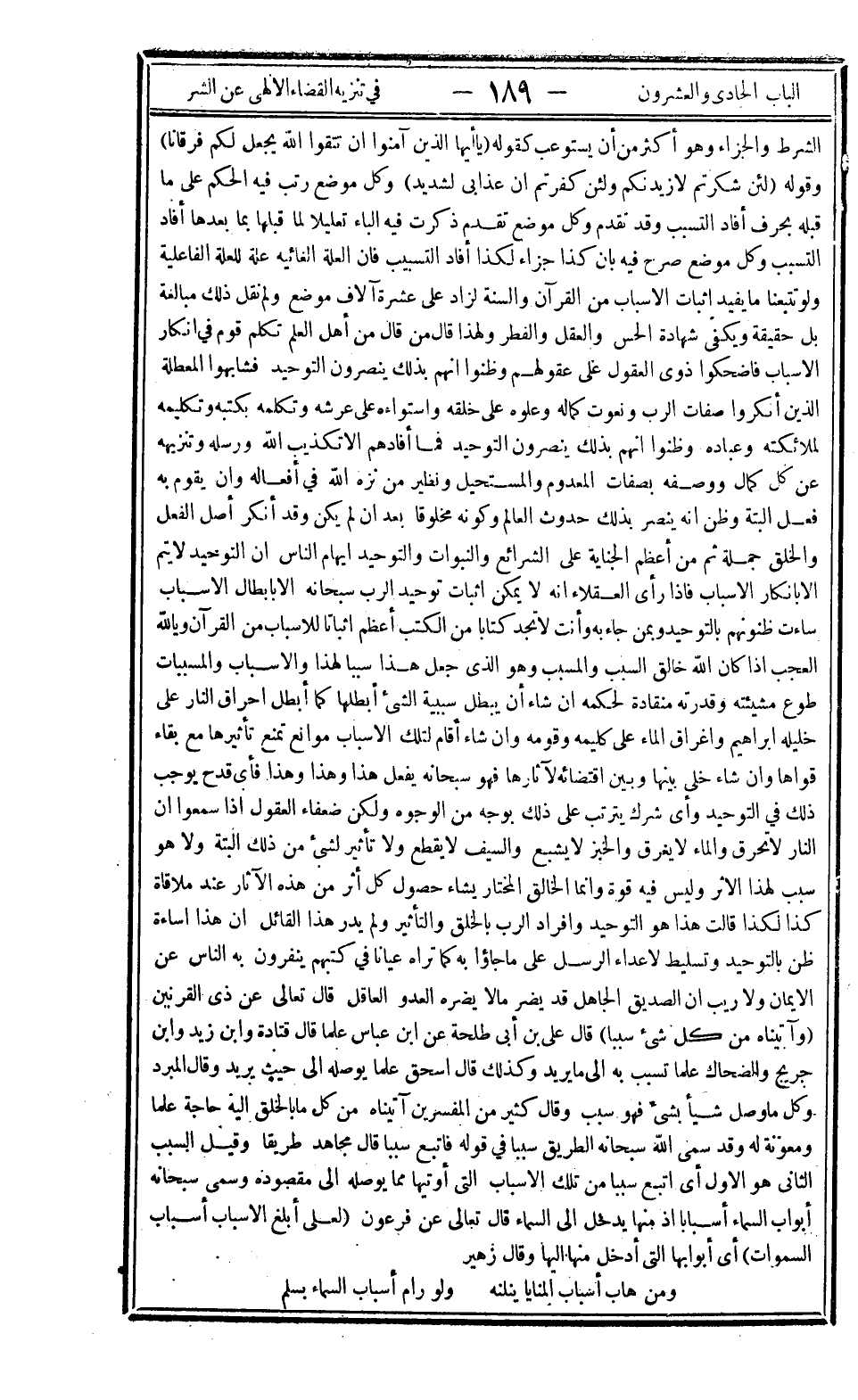 الشرط والجزاء وهو أكثر من أن يستوعب كقوله: {يَا أَيُّهَا الَّذِينَ آمَنُوا إِنْ تَتَّقُوا اللَّهَ يَجْعَلْ لَكُمْ فُرْقَاناً} وقوله: {لَئِنْ شَكَرْتُمْ لأَزِيدَنَّكُمْ وَلَئِنْ كَفَرْتُمْ إِنَّ عَذَابِي لَشَدِيدٌ} وكل موضع رتب فيه الحكم على ما قبله بحرف أفاد التسبب وقد تقدم وكل موضع تقدم ذكرت فيه الباء تعليلا لما قبلها بما بعدها أفاد التسبب وكل موضع صرح فيه بأن كذا جزاء لكذا أفاد التسبيب فإن العلة الغائية عله للعلة الفاعلية ولو تتبعنا ما يفيد إثبات الأسباب من القرآن والسنة لزاد على عشرة آلاف موضع ولم نقل ذلك مبالغة بل حقيقة ويكفي شهادة الحس والعقل والفطر ولهذا قال من قال من أهل العلم تكلم قوم في إنكار الأسباب فأضحكوا ذوي العقول على عقولهم وظنوا أنهم بذلك ينصرون التوحيد فشابهوا المعطلة الذين أنكروا صفات الرب ونعوت كماله وعلوه على خلقه واستواءه على عرشه وتكلمه بكتبه وتكليمه لملائكته وعباده وظنوا أنهم بذلك ينصرون التوحيد فما أفادهم إلا تكذيب الله ورسله وتنزيهه عن كل كمال ووصفه بصفات المعدوم والمستحيل ونظير من نزه الله في أفعاله وأن يقوم به فعل البتة وظن أنه ينصر بذلك حدوث العالم وكونه مخلوقا بعد أن لم يكن وقد أنكر أصل الفعل والخلق جملة ثم من أعظم الجناية على الشرائع والنبوات والتوحيد إيهام الناس أن التوحيد لا يتم إلا بإنكار الأسباب فإذا رأى العقلاء أنه لا يمكن إثبات توحيد الرب سبحانه إلا بإبطال الأسباب ساءت ظنونهم بالتوحيد وبمن جاء به وأنت لا تجد كتابا من الكتب أعظم إثباتا للأسباب من القرآن ويا لله العجب إذا كان الله خالق السبب والمسبب وهو الذي جعل هذا سببا لهذا والأسباب والمسببات طوع مشيئته وقدرته منقادة لحكمه إن شاء أن يبطل سببية الشيء أبطلها كما أبطل إحراق النار على خليله إبراهيم وإغراق الماء على كليمه وقومه وإن شاء أقام لتلك الأسباب موانع تمنع تأثيرها مع بقاء قواها وإن شاء خلى بينها وبين اقتضائه لآثارها فهو سبحانه يفعل هذا وهذا وهذا فأي قدح يوجب ذلك في التوحيد وأي شرك يترتب على ذلك بوجه من الوجوه ولكن ضعفاء العقول إذا سمعوا أن النار لا تحرق والماء لا يغرق والخبر لا يشبع والسيف لا يقطع ولا تأثير لشيء من ذلك البتة ولا هو سبب لهذا الأثر وليس فيه قوة وإنما الخالق المختار يشاء حصول كل أثر من هذه الآثار عند ملاقاة كذا لكذا قالت هذا هو التوحيد وإفراد الرب بالخلق والتأثير ولم يدر هذا القائل أن هذا إساءة ظن بالتوحيد وتسليط لأعداء الرسل على ما جاؤوا به كما تراه عيانا في كتبهم ينفرون به الناس عن الإيمان ولا ريب أن الصديق الجاهل قد يضر مالا يضره العدو العاقل قال تعالى عن ذي القرنين: {وَآتَيْنَاهُ مِنْ كُلِّ شَيْءٍ سَبَباً} قال علي بن أبي طلحة عن ابن عباس: "علما" قال قتادة وابن زيد وابن جريج والضحاك: "علما تسبب به إلى ما يريد" وكذلك قال إسحاق: "علما يوصله إلى حيث يريد" وقال المبرد: "وكل ما وصل شيئا بشيء فهو سبب" وقال كثير من المفسرين: "آتيناه من كل ما بالخلق إليه حاجة علما ومعونة له وقد سمى الله سبحانه الطريق سببا في قوله فأتبع سببا" قال مجاهد: "طريقا" وقيل السبب الثاني هو الأول أي أتبع سببا من تلك الأسباب التي أوتيها مما يوصله إلى مقصوده وسمى سبحانه أبواب السماء أسبابا إذ منها يدخل إلى السماء قال تعالى عن فرعون: {لَعَلِّي أَبْلُغُ الأَسْبَابَ أَسْبَابَ السَّمَاوَاتِ} أي أبوابها التي أدخل منها إليها وقال زهير: