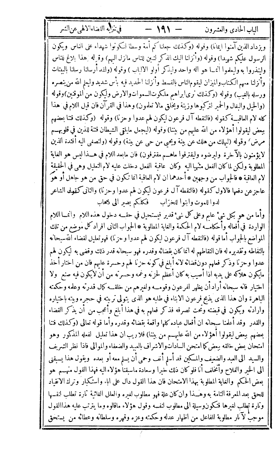 وَيَزْدَادَ الَّذِينَ آمَنُوا إِيمَاناً} وقوله: {وَكَذَلِكَ جَعَلْنَاكُمْ أُمَّةً وَسَطاً لِتَكُونُوا شُهَدَاءَ عَلَى النَّاسِ وَيَكُونَ الرَّسُولُ عَلَيْكُمْ شَهِيداً} وقوله: {وَأَنْزَلْنَا إِلَيْكَ الذِّكْرَ لِتُبَيِّنَ لِلنَّاسِ مَا نُزِّلَ إِلَيْهِمْ} وقوله: {هَذَا بَلاغٌ لِلنَّاسِ وَلِيُنْذَرُوا بِهِ وَلِيَعْلَمُوا أَنَّمَا هُوَ إِلَهٌ وَاحِدٌ وَلِيَذَّكَّرَ أُولُو الأَلْبَابِ} وقوله: {لَقَدْ أَرْسَلْنَا رُسُلَنَا بِالْبَيِّنَاتِ وَأَنْزَلْنَا مَعَهُمُ الْكِتَابَ وَالْمِيزَانَ لِيَقُومَ النَّاسُ بِالْقِسْطِ وَأَنْزَلْنَا الْحَدِيدَ فِيهِ بَأْسٌ شَدِيدٌ وَمَنَافِعُ لِلنَّاسِ وَلِيَعْلَمَ اللَّهُ مَنْ يَنْصُرُهُ وَرُسُلَهُ بِالْغَيْبِ} وقوله: {وَكَذَلِكَ نُرِي إِبْرَاهِيمَ مَلَكُوتَ السَّمَاوَاتِ وَالأَرْضِ وَلِيَكُونَ مِنَ الْمُوقِنِينَ} وقوله: {وَالْخَيْلَ وَالْبِغَالَ وَالْحَمِيرَ لِتَرْكَبُوهَا وَزِينَةً وَيَخْلُقُ مَا لا تَعْلَمُونَ} وهذا في القرآن فإن قيل اللام في هذا كله لام العاقبة كقوله: {فَالْتَقَطَهُ آلُ فِرْعَوْنَ لِيَكُونَ لَهُمْ عَدُوّاً وَحَزَناً} وقوله: {وَكَذَلِكَ فَتَنَّا بَعْضَهُمْ بِبَعْضٍ لِيَقُولُوا أَهَؤُلاءِ مَنَّ اللَّهُ عَلَيْهِمْ مِنْ بَيْنِنَا} وقوله: {لِيَجْعَلَ مَا يُلْقِي الشَّيْطَانُ فِتْنَةً لِلَّذِينَ فِي قُلُوبِهِمْ مَرَضٌ} وقوله: {لِيَهْلِكَ مَنْ هَلَكَ عَنْ بَيِّنَةٍ وَيَحْيَى مَنْ حَيَّ عَنْ بَيِّنَةٍ} وقوله: {وَلِتَصْغَى إِلَيْهِ أَفْئِدَةُ الَّذِينَ لا يُؤْمِنُونَ بِالآخِرَةِ وَلِيَرْضَوْهُ وَلِيَقْتَرِفُوا مَا هُمْ مُقْتَرِفُونَ} فإن ما بعد اللام في هذا ليس هو الغاية المطلوبة ولكن لما كان الفعل منتهيا إليه وكان عاقبة الفعل دخلت عليه لام التعليل وهي في الحقيقة لام العاقبة، فالجواب من وجهين، أحدهما: أن لام العاقبة إنما تكون في حق من هو جاهل أو هو عاجز عن دفعها فالأول: كقوله: {فَالْتَقَطَهُ آلُ فِرْعَوْنَ لِيَكُونَ لَهُمْ عَدُوّاً وَحَزَناً} والثاني: كقول الشاعر: