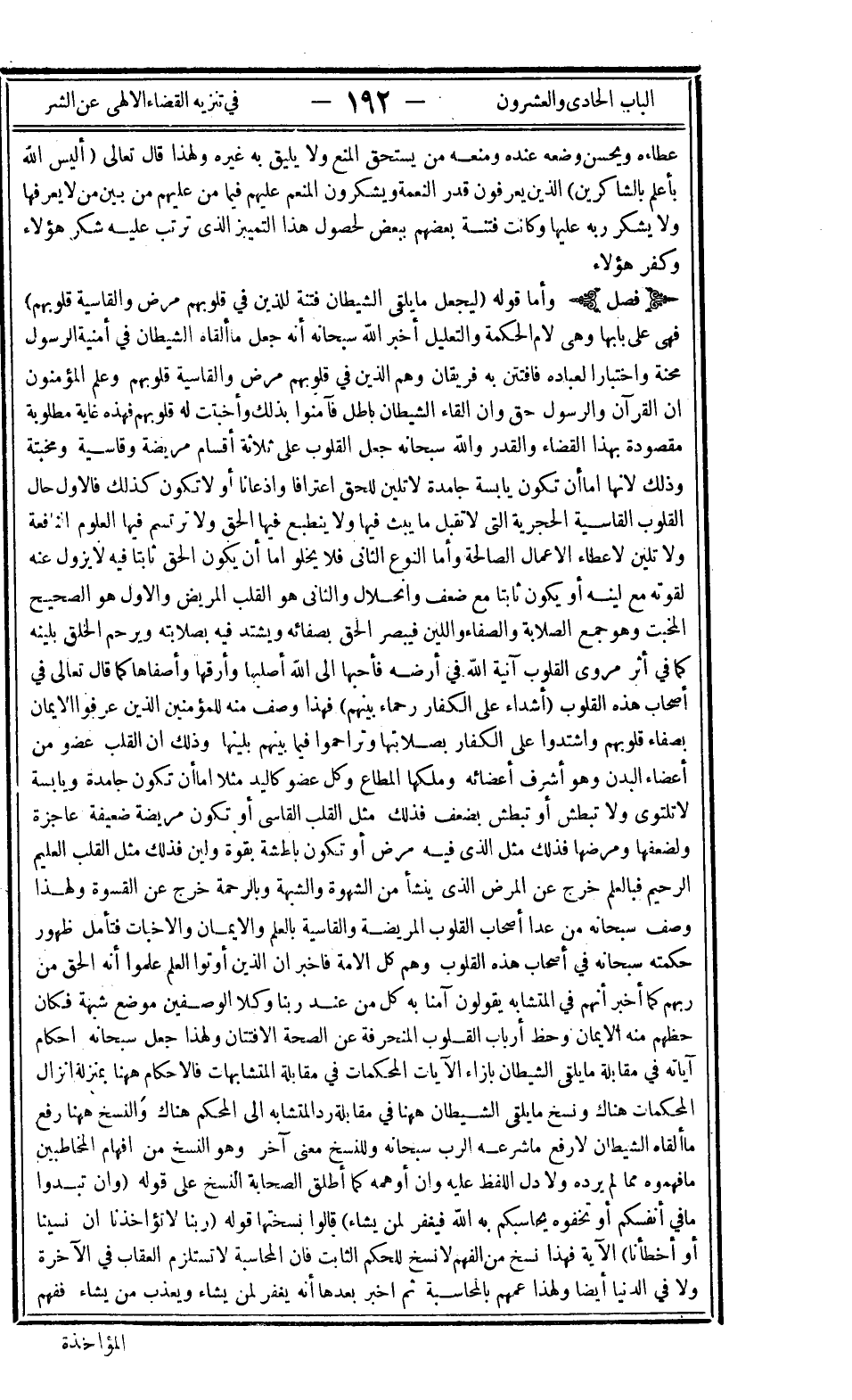 فصل: وأما قوله: {لِيَجْعَلَ مَا يُلْقِي الشَّيْطَانُ فِتْنَةً لِلَّذِينَ فِي قُلُوبِهِمْ مَرَضٌ وَالْقَاسِيَةِ} فهي على بابها وهي لام الحكمة والتعليل أخبر الله سبحانه أنه جعل ما ألقاه الشيطان في أمنية الرسول محنة واختبارا لعباده فافتتن به فريقان وهم الذين في قلوبهم مرض والقاسية قلوبهم وعلم المؤمنين أن القرآن والرسول حق وأن إلقاء الشيطان باطل فآمنوا بذلك وأخبتت له قلوبهم فهذه غاية مطلوبة مقصودة بهذا القضاء والقدر والله سبحانه جعل القلوب على ثلاثة أقسام مريضة وقاسية ومخبتة وذلك لأنها إما أن تكون يابسة جامدة لا تلين للحق اعترافا وإذعانا أو لا تكون كذلك فالأول حال القلوب القاسية الحجرية التي لا تقبل ما يبث فيها ولا ينطبع فيها الحق ولا ترتسم فيها العلوم النافعة ولا تلين لإعطاء الأعمال الصالحة وأما النوع الثاني فلا يخلوا إما أن يكون الحق ثابتا فيه لا يزول عنه لقوته مع لينه أو يكون ثابتا مع ضعف وانحلال والثاني هو القلب المريض والأول هو الصحيح المخبت وهو جمع الصلابة والصفاء واللين فيبصر الحق بصفائه ويشتد فيه بصلابته ويرحم الخلق بلينه كما في أثر مروي: "القلوب آنية الله في أرضه فأحبها إلى الله أصلبها وأرقها وأصفاها" كما قال تعالى في أصحاب هذه القلوب: {أَشِدَّاءُ عَلَى الْكُفَّارِ رُحَمَاءُ بَيْنَهُمْ} فهذا وصف منه للمؤمنين الذين عرفوا الإيمان بصفاء قلوبهم واشتدوا على الكفار بصلابتها وتراحموا فيما بينهم بلينها وذلك أن القلب عضو من أعضاء البدن وهو أشرف أعضائه وملكها المطاع وكل عضو كاليد مثلا إما أن تكون جامدة ويابسة لا تلتوي ولا تبطش أو تبطش بضعف فذلك مثل القلب القاسي أو تكون مريضة ضعيفة عاجزة ولضعفها ومرضها فذلك مثل الذي فيه مرض أو تكون باطشة بقوة ولين فذلك مثل القلب العليم الرحيم فبالعلم خرج عن المرض الذي ينشأ من الشهوة والشبهة وبالرحمة خرج عن القسوة ولهذا وصف سبحانه من عدا أصحاب القلوب المريضة والقاسية بالعلم والإيمان والإخبات فتأمل ظهور حكمته سبحانه في أصحاب هذه القلوب وهم كل الأمة فأخبر أن الذين أوتوا العلم علموا أنه الحق من ربهم كما أخبر أنهم في المتشابه يقولون آمنا به كل من عند ربنا وكلا الوصفين موضع شبهة فكان حظهم منه الإيمان وحظ أرباب القلوب المنحرفة عن الصحة الافتتان ولهذا جعل سبحانه أحكام آياته في مقابلة ما يلقي الشيطان بإزاء الآيات المحكمات في مقابلة المتشابهات فالأحكام ههنا بمنزلة إنزال المحكمات هناك ونسخ ما يلقي الشيطان ههنا في مقابلة رد المتشابه إلى المحكم هناك والنسخ ههنا رفع ما ألقاه الشيطان لا رفع ما شرعه الرب سبحانه وللنسخ معنى آخر هو النسخ من أفهام المخاطبين ما فهموه مما لم يرده ولا دل اللفظ عليه وإن أوهمه كما أطلق الصحابة النسخ على قوله: {وَإِنْ تُبْدُوا مَا فِي أَنْفُسِكُمْ أَو تُخْفُوهُ يُحَاسِبْكُمْ بِهِ اللَّهُ فَيَغْفِرُ لِمَنْ يَشَاءُ} قالوا نسختها قوله: {رَبَّنَا لا تُؤَاخِذْنَا إِنْ نَسِينَا أَوْ أَخْطَأْنَا} الآية فهذا نسخ من الفهم لا نسخ للحكم الثابت فإن المحاسبة لا تستلزم العقاب في الآخرة ولا في الدنيا أيضا ولهذا عمهم بالمحاسبة ثم أخبر بعدها أنه يغفر لمن يشاء ويعذب من يشاء ففهم