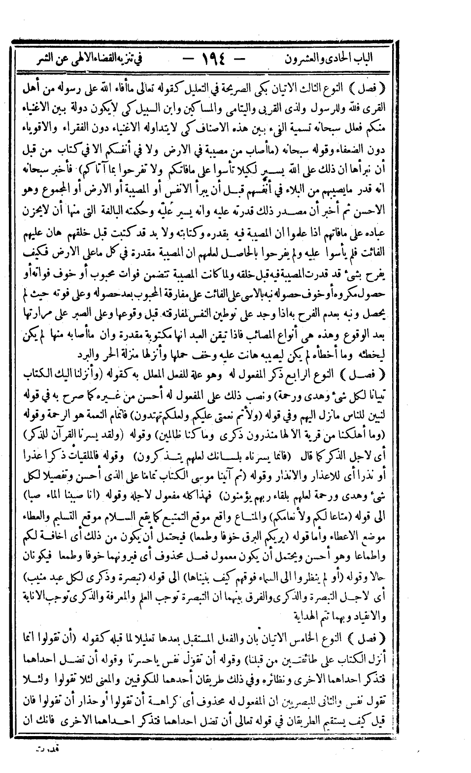 فصل: النوع الرابع ذكر المفعول له وهو علة للفعل المعلل به كقوله: {وَنَزَّلْنَا عَلَيْكَ الْكِتَابَ تِبْيَاناً لِكُلِّ شَيْءٍ وَهُدىً وَرَحْمَةً} ونصب ذلك على المفعول له أحسن من غيره كما صرح به في قوله: {لِتُبَيِّنَ لِلنَّاسِ مَا نُزِّلَ إِلَيْهِمْ} وفي قوله: {وَلأُتِمَّ نِعْمَتِي عَلَيْكُمْ وَلَعَلَّكُمْ تَهْتَدُونَ} فإتمام النعمة هو الرحمة وقوله: {وَمَا أَهْلَكْنَا مِنْ قَرْيَةٍ إِلَّا لَهَا مُنْذِرُونَ ذِكْرَى وَمَا كُنَّا ظَالِمِينَ} وقوله: {وَلَقَدْ يَسَّرْنَا الْقُرْآنَ لِلذِّكْرِ} أي لأجل الذكر كما قال: {فَإِنَّمَا يَسَّرْنَاهُ بِلِسَانِكَ لَعَلَّهُمْ يَتَذَكَّرُونَ} وقوله فالملقيات ذكرا عذرا أو نذرا أي للإعذار والإنذار وقوله: {ثُمَّ آتَيْنَا مُوسَى الْكِتَابَ تَمَاماً عَلَى الَّذِي أَحْسَنَ وَتَفْصِيلاً لِكُلِّ شَيْءٍ وَهُدىً وَرَحْمَةً لَعَلَّهُمْ بِلِقَاءِ رَبِّهِمْ يُؤْمِنُونَ} فهذا كله مفعول لأجله وقوله: {أَنَّا صَبَبْنَا الْمَاءَ صَبّاً} إلى قوله: {مَتَاعاً لَكُمْ وَلأَنْعَامِكُمْ} والمتاع واقع موقع التمتيع كما يقع السلام موقع التسليم والعطاء موضع الإعطاء وأما قوله: {رِيكُمُ الْبَرْقَ خَوْفاً وَطَمَعاً} فيحتمل أن يكون من ذلك أي إخافة لكم وإطماعا وهو أحسن ويحتمل أن يكون معمول فعل محذوف أي فيرونهما خوفا وطمعا فيكونان حالا وقوله: {أَفَلَمْ يَنْظُرُوا إِلَى السَّمَاءِ فَوْقَهُمْ كَيْفَ بَنَيْنَاهَا} إلى قوله: {تَبْصِرَةً وَذِكْرَى لِكُلِّ عَبْدٍ مُنِيبٍ} أي لأجل التبصرة والذكرى والفرق بينهما أن التبصرة توجب العلم والمعرفة والذكرى توجب الإنابة والانقياد وبهما تتم الهداية.
