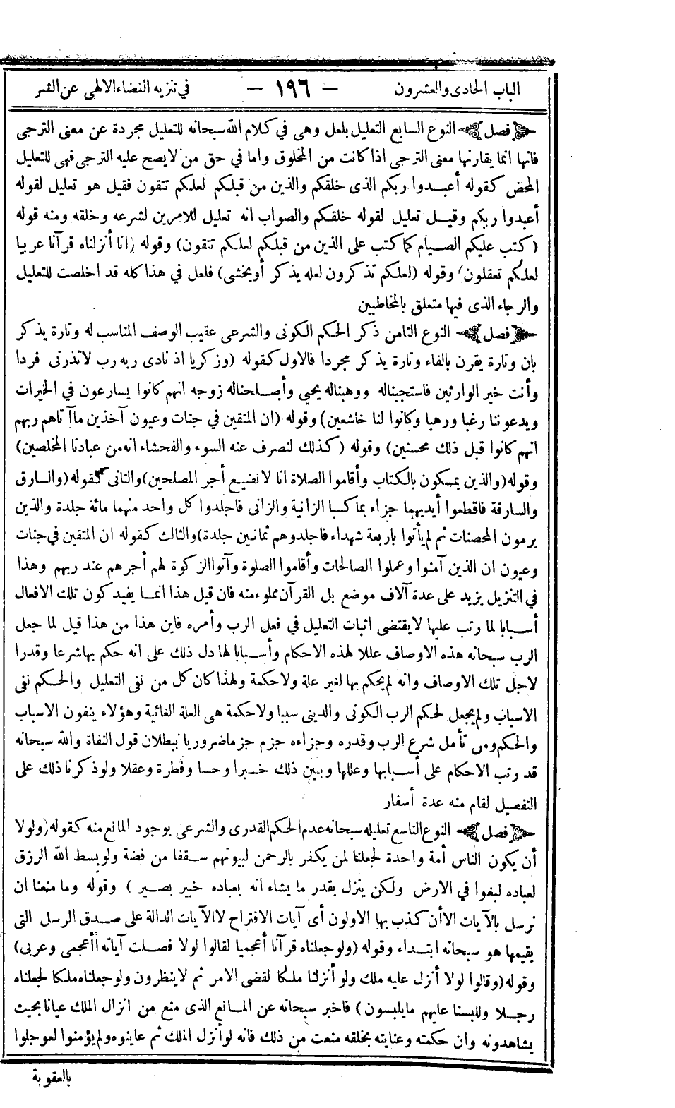 فصل: النوع التاسع تعليله سبحانه عدم الحكم القدري والشرعي بوجود المانع منه كقوله: {وَلَوْلا أَنْ يَكُونَ النَّاسُ أُمَّةً وَاحِدَةً لَجَعَلْنَا لِمَنْ يَكْفُرُ بِالرَّحْمَنِ لِبُيُوتِهِمْ سُقُفاً مِنْ فِضَّةٍ} {وَلَوْ بَسَطَ اللَّهُ الرِّزْقَ لِعِبَادِهِ لَبَغَوْا فِي الأَرْضِ وَلَكِنْ يُنَزِّلُ بِقَدَرٍ مَا يَشَاءُ إِنَّهُ بِعِبَادِهِ خَبِيرٌ بَصِيرٌ} وقوله: {وَمَا مَنَعَنَا أَنْ نُرْسِلَ بِالآياتِ إِلاّ أَنْ كَذَّبَ بِهَا الأَوَّلُونَ} أي آيات الاقتراح لا الآيات الدالة على صدق الرسل التي يقيمها هو سبحانه ابتداء وقوله: {وَلَوْ جَعَلْنَاهُ قُرْآناً أَعْجَمِيّاً لَقَالُوا لَوْلا فُصِّلَتْ آيَاتُهُ أَأَعْجَمِيٌّ وَعَرَبِيٌّ} وقوله: {وَقَالُوا لَوْلا أُنْزِلَ عَلَيْهِ مَلَكٌ وَلَوْ أَنْزَلْنَا مَلَكاً لَقُضِيَ الأَمْرُ ثُمَّ لا يُنْظَرُونَ وَلَوْ جَعَلْنَاهُ مَلَكاً لَجَعَلْنَاهُ رَجُلاً وَلَلَبَسْنَا عَلَيْهِمْ مَا يَلْبِسُونَ} فأخبر سبحانه عن المانع الذي منع من إنزال الملك عيانا بحيث يشاهدونه وأن حكمته وعنايته بخلقه منعت من ذلك فإنه لو أنزل الملك ثم عاينوه ولم يؤمنوا لعوجلوا