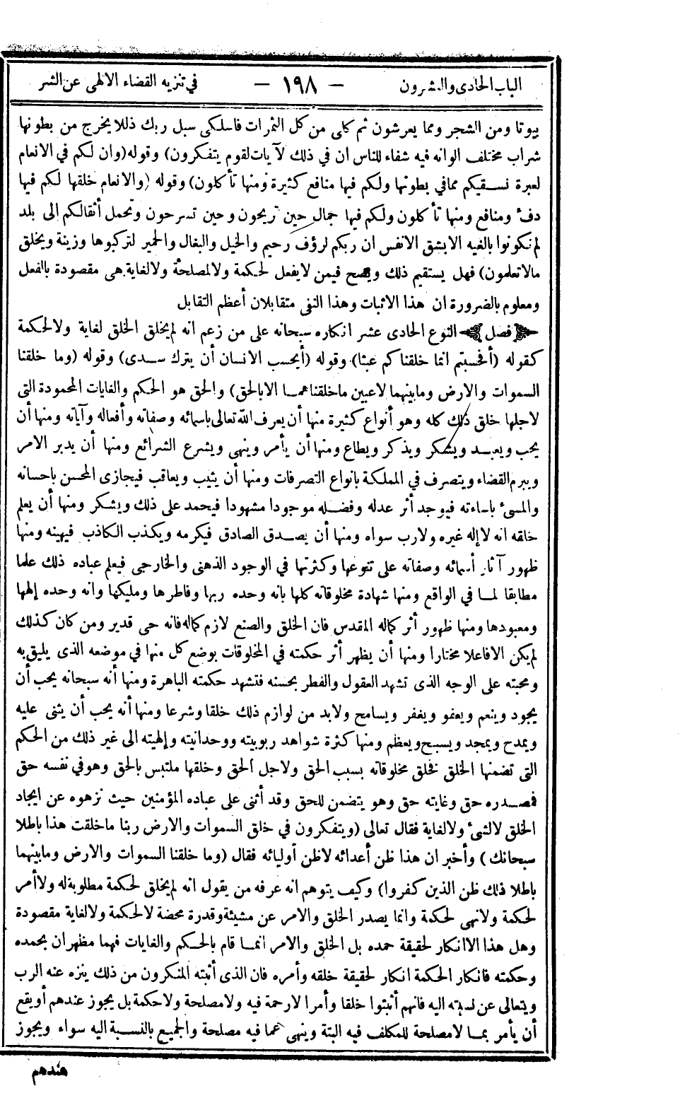 بُيُوتاً وَمِنَ الشَّجَرِ وَمِمَّا يَعْرِشُونَ ثُمَّ كُلِي مِنْ كُلِّ الثَّمَرَاتِ فَاسْلُكِي سُبُلَ رَبِّكِ ذُلُلاً يَخْرُجُ مِنْ بُطُونِهَا شَرَابٌ مُخْتَلِفٌ أَلْوَانُهُ فِيهِ شِفَاءٌ لِلنَّاسِ إِنَّ فِي ذَلِكَ لآيَةً لِقَوْمٍ يَتَفَكَّرُونَ} وقوله: {وَإِنَّ لَكُمْ فِي الأَنْعَامِ لَعِبْرَةً نُسْقِيكُمْ مِمَّا فِي بُطُونِهَا وَلَكُمْ فِيهَا مَنَافِعُ كَثِيرَةٌ وَمِنْهَا تَأْكُلُونَ} وقوله: {وَالأَنْعَامَ خَلَقَهَا لَكُمْ فِيهَا دِفْءٌ وَمَنَافِعُ وَمِنْهَا تَأْكُلُونَ وَلَكُمْ فِيهَا جَمَالٌ حِينَ تُرِيحُونَ وَحِينَ تَسْرَحُونَ وَتَحْمِلُ أَثْقَالَكُمْ إِلَى بَلَدٍ لَمْ تَكُونُوا بَالِغِيهِ إِلَّا بِشِقِّ الأَنْفُسِ إِنَّ رَبَّكُمْ لَرَؤُوفٌ رَحِيمٌ وَالْخَيْلَ وَالْبِغَالَ وَالْحَمِيرَ لِتَرْكَبُوهَا وَزِينَةً وَيَخْلُقُ مَا لا تَعْلَمُونَ} فهل يستقيم ذلك ويصح فيمن لا يفعل لحكمة ولا لمصلحة ولا لغاية هي مقصودة بالفعل ومعلوم بالضرورة أن هذا الإثبات وهذا النفي متقابلان أعظم التقابل.