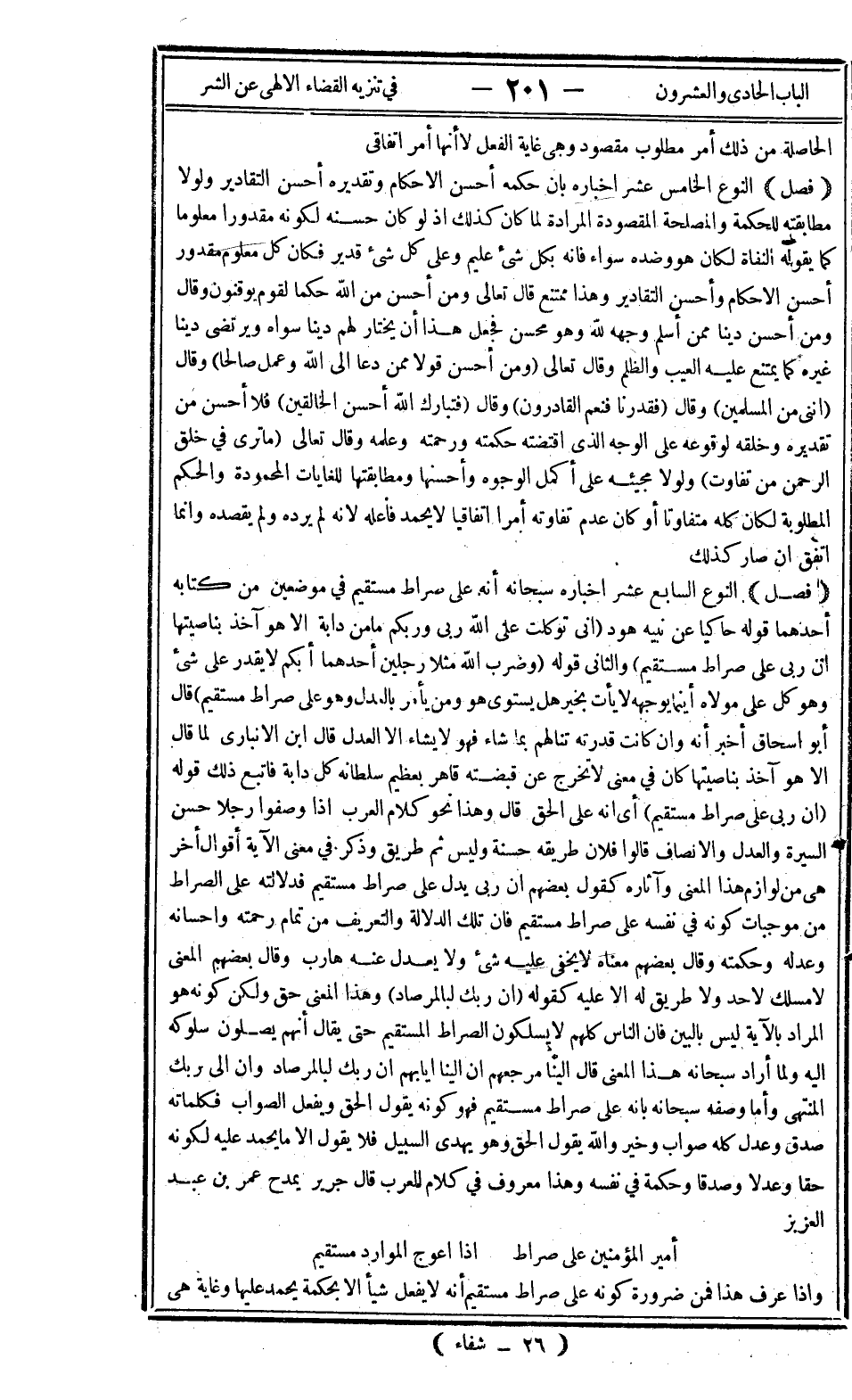فصل: النوع السادس عشر إخباره سبحانه أنه على صراط مستقيم في موضعين من كتابه أحدهما قوله حاكيا عن نبيه هود: {إِنِّي تَوَكَّلْتُ عَلَى اللَّهِ رَبِّي وَرَبِّكُمْ مَا مِنْ دَابَّةٍ إِلَّا هُوَ آخِذٌ بِنَاصِيَتِهَا إِنَّ رَبِّي عَلَى صِرَاطٍ مُسْتَقِيمٍ} والثاني قوله: {وَضَرَبَ اللَّهُ مَثَلاً رَجُلَيْنِ أَحَدُهُمَا أَبْكَمُ لا يَقْدِرُ عَلَى شَيْءٍ وَهُوَ كَلٌّ عَلَى مَوْلاهُ أَيْنَمَا يُوَجِّهْهُ لا يَأْتِ بِخَيْرٍ هَلْ يَسْتَوِي هُوَ وَمَنْ يَأْمُرُ بِالْعَدْلِ وَهُوَ عَلَى صِرَاطٍ مُسْتَقِيمٍ} قال أبو إسحاق: "أخبر أنه وإن كانت قدرته تنالهم بما شاء فهو لا يشاء إلا العدل" قال ابن الأنباري: "لما قال إلا هو آخذ بناصيتها كان في معنى لا تخرج عن قبضته" قاهر بعظيم سلطانه كل دابة فأتبع ذلك قوله: {إِنَّ رَبِّي عَلَى صِرَاطٍ مُسْتَقِيمٍ} أي أنه على الحق قال وهذا نحو كلام العرب إذا وصفوا رجلا حين السيرة والعدل والإنصاف قالوا فلان طريقه حسنة وليس ثم طريق وذكر في معنى الآية أقوال أخر هي من لوازم هذا المعنى وآثاره كقول بعضهم إن ربي يدل على صراط مستقيم فدلالته على الصراط من موجبات كونه في نفسه على صراط مستقيم فإن تلك الدلالة والتعريف من تمام رحمته وإحسانه وعدله وحكمته وقال بعضهم معناه لا يخفى عليه شيء ولا يعدل عنه هارب وقال بعضهم المعنى لا مسلك لأحد ولا طريق له إلا عليه كقوله: {إِنَّ رَبَّكَ لَبِالْمِرْصَادِ} وهذا المعنى حق ولكن كونه هو المراد بالآية ليس بالبين فإن الناس كلهم لا يسلكون الصراط المستقيم حتى يقال أنهم يصلون سلوكه إليه ولما أراد سبحانه هذا المعنى قال: {إِلَيْنَا مَرْجِعُهُمْ} : {إِنَّ إِلَيْنَا إِيَابَهُمْ} : {إِنَّ رَبَّكَ لَبِالْمِرْصَادِ} : {وَأَنَّ إِلَى رَبِّكَ الْمُنْتَهَى} وأما وصفه سبحانه بأنه على صراط مستقيم فهو كونه يقول الحق ويفعل الصواب فكلماته صدق وعدل كله صواب وخير والله يقول الحق وهو يهدي السبيل فلا يقول إلا ما يحمد عليه لكونه حقا وعدلا وصدقا وحكمة في نفسه وهذا معروف في كلام للعرب قال جرير يمدح عمر بن عبد العزيز:
