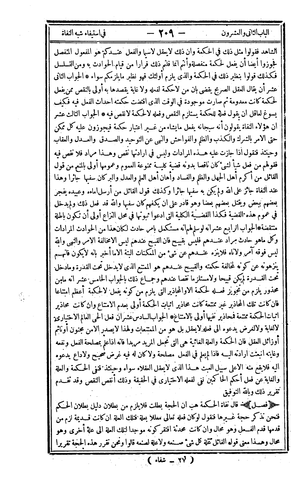 الشاهد فقولوا مثل ذلك في الحكمة وأن ذلك لا يعقل لا سيما والفعل عندكم هو المفعول المنفصل فجوزوا أيضا أن يفعل لحكمة منفصلة وأنتم إنما قلتم ذلك فرارا من قيام الحوادث به ومن التسلسل فكذلك قولوا بنظير ذلك في الحكمة والذي يلزم أولئك فهو نظير ما يلزمكم سواء، الجواب الثاني عشر أن يقال العقل الصريح يقضي بأن من لا حكمة لفعله ولا غاية يقصدها به أولى بالنقص ممن يفعل لحكمة كانت معدومة ثم صارت موجودة في الوقت الذي اقتضت حكمته إحداث الفعل فيه فكيف يسوغ لعاقل أن يقول فعله للحكمة يستلزم النقص وفعله لا لحكمة لا نقص فيه، الجواب الثالث عشر أن هؤلاء النفاة يقولون أنه سبحانه يفعل ما يشاء من غير اعتبار حكمة فيجوزون عليه كل ممكن حتى الأمر بالشرك والكذب والظلم والفواحش والنهي عن التوحيد والصدق والعدل والعقاب وحينئذ فنقول إذا جازت عليه هذه المرادات وليس في إرادتها نقص وهذا مراد فلا نقص فيه فقولهم من فعل شيئا لشيء كان ناقصا بدونه قضية كلية ممنوعة العموم وعمومها أولى بالمنع من قول القائل من أكرم أهل الجهل والظلم والفساد وأهان أهل العلم والعدل والبر كان سفيها جائرا وهذا عند النفاة جائز على الله ولم يكن به سفيها جائرا وكذلك قول القائل من أرسل إماءه وعبيده يفجر بعضهم ببعض ويقتل بعضهم بعضا وهو قادر على أن يكفيهم كان سفيها والله قد فعل ذلك ولم يدخل في عموم هذه القضية فكذا القضية الكلية التي ادعوا ثبوتها في محل النزاع أولى أن تكون باطلة منتقضة، الجواب الرابع عشر أنه لو سلم لهم أنه مستكمل بأمر حادث لكان هذا من الحوادث المرادات وكل ما هو حادث مراد عندهم فليس بقبيح فإن القبيح عندهم ليس إلا مخالفة الأمر والنهي والله ليس فوقه آمر ولا ناه فلا ينزه عندهم عن شيء من الممكنات البتة إلا ما أخبر بأنه لا يكون فإنهم ينزهونه عن كونه لمخالفة حكمته والقبيح عندهم هو الممتنع الذي لا يدخل تحت القدرة وما دخل تحت القدرة لم يكن قبيحا ولا مستلزما نقصا عندهم وجماع ذلك بالجواب الخامس عشر أنه ما من محذور يلزم من تجويز فعله لحكمة إلا والمحاذير التي يلزم من كونه يفعل لا لحكمة أعظم امتناعا فإن كانت تلك المحاذير غير ممتنعة كانت محاذير إثبات الحكمة أولى بعدم الامتناع وإن كانت محاذير إثبات الحكمة ممتنعة فمحاذير نفيها أولى بالامتناع، الجواب السادس عشر أن فعل الحي العالم الاختياري لا لغاية ولا لغرض يدعوه إلى فعله لا يعقل بل هو من الممتنعات لهذا لا يصدر إلا من مجنون أو نائم أو زائل العقل فإن الحكمة والعلة الغائية هي التي تجعل المريد مريدا فإنه إذا علم بمصلحة الفعل ونفعه وغايته انبعثت إرادته إليه فإذا لم يعلم في الفعل مصلحة ولا كان له فيه غرض صحيح ولا داع يدعوه إليه فلا يقع منه إلا على سبيل العبث هذا الذي لا يعقل العقلاء سواه وحينئذ فنفي الحكمة والعلة والغاية عن فعل أحكم الحاكمين نفي لفعله الاختياري في الحقيقة وذلك أنقص النقص وقد تقدم تقرير ذلك وبالله التوفيق.