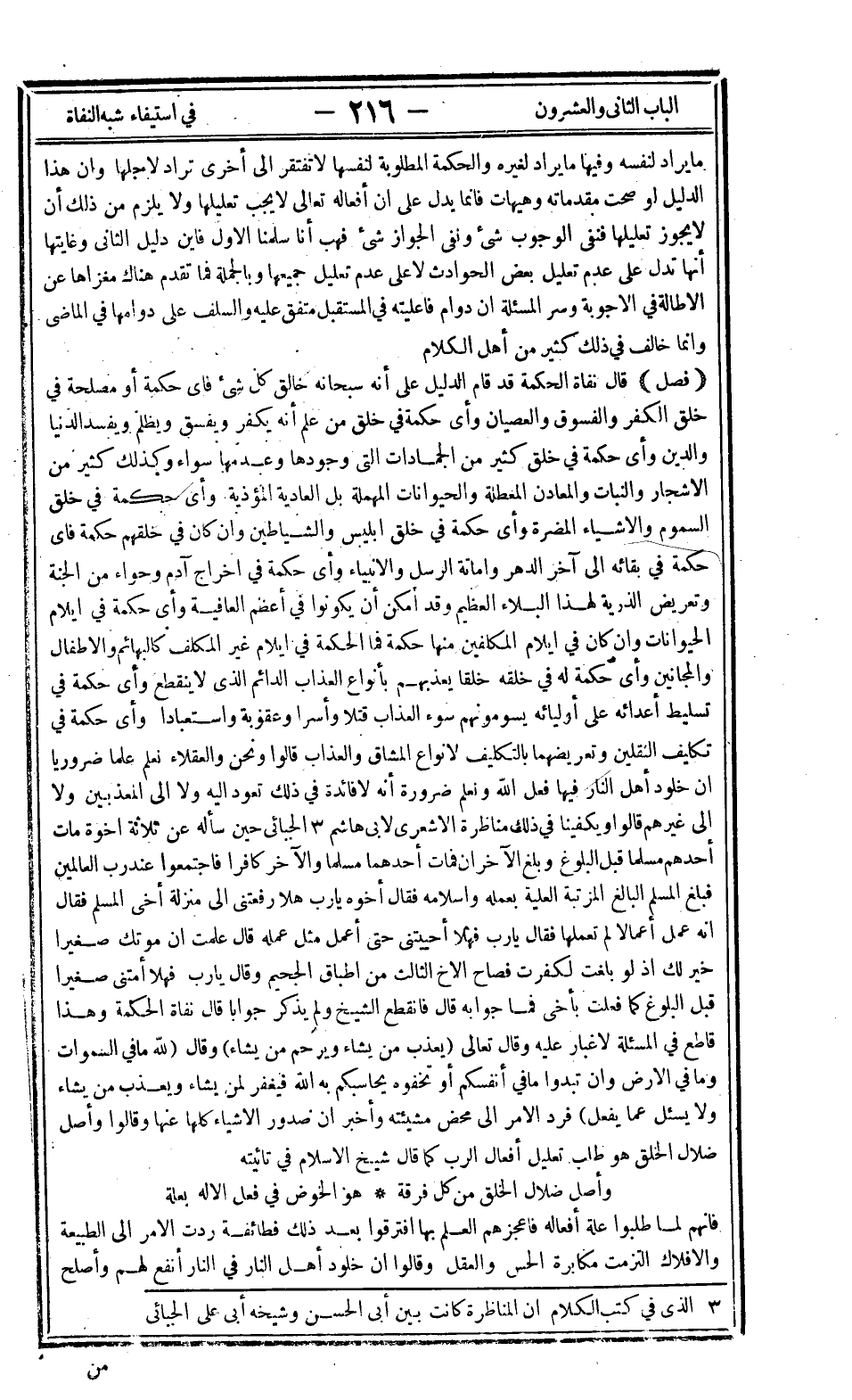 ما يراد لنفسه وفيها ما يراد لغيره والحكمة المطلوبة لنفسها لا تفتقر إلى أخرى تراد لأجلها وأن هذا الدليل لو صحت مقدماته وهيهات فإنما يدل على أن أفعاله تعالى لا يجب تعليلها ولا يلزم من ذلك أن لا يجوز تعليلها فنفي الوجوب شيء ونفي الجواز شيء فهب أنا سلمنا الأول فأين دليل الثاني وغايتها أنها تدل على عدم تعليل بعض الحوادث لا على عدم تعليل جميعها وبالجملة فما تقدم هناك مغزاها عن الإطالة في الأجوبة وسر المسألة أن دوام فاعليته في المستقبل متفق عليه والسلف على دوامها في الماضي وإنما خالف في ذلك كثير من أهل الكلام.