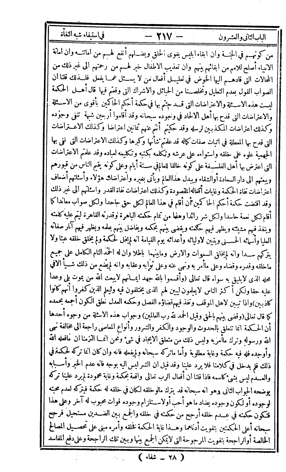 من كونهم في الجنة وأن إبقاء إبليس يغوي الخلق ويضلهم أنفع لهم من إماتته وإن إماتة الأنبياء أصلح للأمم من إبقائهم بينهم وأن تعذيب الأطفال خير لهم من رحمتهم إلى غير ذلك من المحالات التي قادهم إليها الخوض في تعليل أفعال من لا يسأل عما يفعل فلذلك قلنا أن الصواب القول بعدم التعليل وتخلصنا من الحبائل والإشراك التي وقعتم فيها قال أهل الحكمة ليست هذه الأسئلة والاعتراضات التي قد جئتم بها في حكمة أحكم الحاكمين بأقوى من الأسئلة والاعتراضات التي قدح بها أهل الإلحاد في وجوده سبحانه وقد أقاموا أربعين شبهة تنفي وجوده وكذلك اعتراضات المكذبين لرسله وقد حكيتم أنتم عنهم ثمانين اعتراضا وكذلك الاعتراضات التي قدح بها المعطلة في إثبات صفات كماله قد علمتم شأنها وكبرها وكذلك الاعتراضات التي نفي بها الجهمية علوه على خلقه واستواءه على عرشه وتكلمه بكتبه وتكليمه لعباده وقد علمتم الاعتراضات التي اعترض بها أهل الفلسفة على كونه خالقا للعالم في ستة أيام وعلى كونه يقيم الناس من قبورهم ويبعثهم إلى دار السعادة أو الشقاء ويبدل هذا العالم ويأتي بغيره واعتراضات هؤلاء وأسئلتهم أضعاف اعتراضات نفاة الحكمة وغايات أفعاله المقصودة وكذلك اعتراضات نفاة القدر وأسئلتهم إلى غير ذلك وقد اقتضت حكمة أحكم الحاكمين أن أقام في هذا العالم لكل حق جاحدا ولكل صواب معاندا كما أقام لكل نعمة حاسدا ولكل شر رائدا وهذا من تمام حكمته الباهرة وقدرته القاهرة ليتم عليهم كلمته وينفذ فيهم مشيئته ويظهر فيهم حكمته ويقضي بينهم بحكمه ويفاضل بينهم بعلمه ويظهر فيهم آثار صفاته العليا وأسمائه الحسنى ويتبين لأوليائه وأعدائه يوم القيامة أنه لم يخل لحكمة ولم يخلق خلقه عبثا ولا يتركهم سدا وأنه لم يخلق السماوات والأرض وما بينهما باطلا وأن له الحمد التام الكامل على جميع ما خلقه وقدره وقضاه وعلى ما أمر به ونهى عنه وعلى ثوابه وعقابه وأنه لم يضع من ذلك شيئا إلا في محله الذي لا يليق به سواه قال تعالى: {وَأَقْسَمُوا بِاللَّهِ جَهْدَ أَيْمَانِهِمْ لا يَبْعَثُ اللَّهُ مَنْ يَمُوتُ بَلَى وَعْداً عَلَيْهِ حَقّاً وَلَكِنَّ أَكْثَرَ النَّاسِ لا يَعْلَمُونَ لِيُبَيِّنَ لَهُمُ الَّذِي يَخْتَلِفُونَ فِيهِ وَلِيَعْلَمَ الَّذِينَ كَفَرُوا أَنَّهُمْ كَانُوا كَاذِبِينَ} وإذا تبين لأهل الموقف ونفذ فيهم قضاؤه الفصل وحكمه العدل نطق الكون أجمعه بحمده كما قال تعالى: {قُضِيَ بَيْنَهُمْ بِالْحَقِّ وَقِيلَ الْحَمْدُ لِلَّهِ رَبِّ الْعَالَمِينَ} وجواب هذه الأسئلة من وجوه أحدها أن الحكمة إنما تتعلق بالحدوث والوجود والكفر والشرور وأنواع المعاصي راجعة إلى مخالفة نهي الله ورسوله وترك ما أمر به وليس ذلك من متعلق الإيجاد في شيء ونحن إنما التزمنا أن ما فعله الله وأوجده فله فيه حكمة وغاية مطلوبة وأما ما تركه سبحانه ولم يفعله فإنه وإن كان إنما تركه لحكمة في ذلك فلم يدخل في كلامنا فلا يرد علينا وقد قيل أن الشر ليس إليه بوجه فإنه عدم الخير وأسبابه والعدم ليس بشيء كاسمه فإذا قلنا أن أفعال الرب تعالى واقعة وغاية محمودة لم يرد علينا تركه يوضحه الجواب الثاني وهو أنه سبحانه قد يترك ما لو خلقه لكان في خلقه له حكمة فيتركه لعدم محبته لوجوده أو لكون وجوده يضاد ما هو أحب أو لاستلزام وجوده فوات محبوب له آخر وعلى هذا فتكون حكمته في عدم خلقه أرجح من حكمته في خلقه والجمع بين الضدين مستحيل فرجح سبحانه أعلى الحكمتين بتفويت أدناهما وهذا غاية الحكمة فخلقه وأمره مبني على تحصيل المصالح الخالصة أو الراجحة بتفويت المرجوحة التي لا يمكن الجمع بينها وبين تلك الراجحة وعلى دفع المفاسد