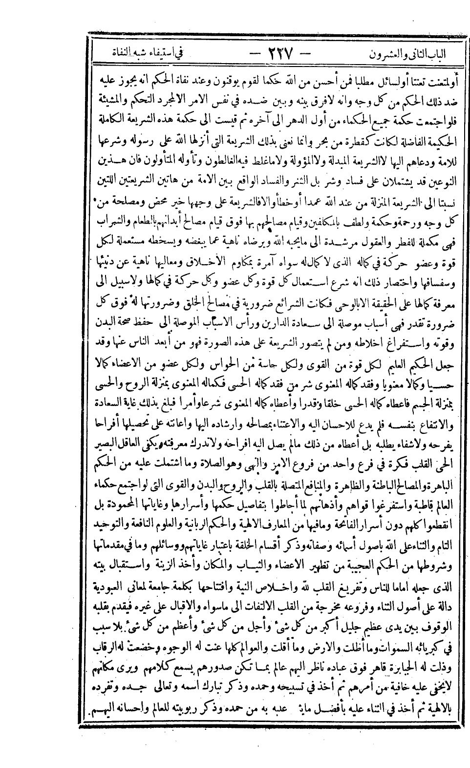 أو لمتعنت تعنتا أو لسائل مطلبا فمن أحسن من الله حكما لقوم يوقنون وعند نفاة الحكم أنه يجوز عليه ضد ذلك الحكم من كل وجه وأنه لا فرق بينه وبين ضده في نفس الأمر إلا لمجرد التحكم والمشيئة فلوا اجتمعت حكمة جميع الحكماء من أول الدهر إلى آخره ثم قيست إلى حكمة هذه الشريعة الكاملة الحكيمة الفاضلة لكانت كقطرة من بحر وإنما نعني بذلك الشريعة التي أنزلها الله على رسوله وشرعها للأمة ودعاهم إليها لا الشريعة المبدلة ولا المؤولة ولا ما غلط فيه الغالطون وتأوله المتأولون فإن هذين النوعين قد يشتملان على فساد وشر بل الشر والفساد الواقع بين الأمة من هاتين الشريعتين اللتين نسبتا إلى الشريعة المنزلة من عند الله عمدا أو خطأ وإلا فالشريعة على وجهها خير محض ومصلحة من كل وجه ورحمة وحكمة ولطف بالمكلفين وقيام مصالحهم بها فوق قيام مصالح أبدانهم بالطعام والشراب فهي مكملة للفطر والعقول مرشدة إلى ما يحبه الله ويرضاه ناهية عما يبغضه ويسخطه مستعملة لكل قوة وعضو حركة في كماله الذي لا كمال له سواه آمرة بمكارم الأخلاق ومعاليها ناهية عن دنيئها وسفسافها واختصار ذلك أنه شرع استعمال كل قوة وكل عضو وكل حركة في كمالها ولا سبيل إلى معرفة كمالها على الحقيقة إلا بالوحي فكانت الشرائع ضرورية في مصالح الخلق وضرورتها له فوق كل ضرورة تقدر فهي أسباب موصلة إلى سعادة الدارين ورأس الأسباب الموصلة إلى حفظ صحة البدن وقوته واستفراغ أخلاطه ومن لم يتصور الشريعة على هذه الصورة فهو من أبعد الناس عنها وقد جعل الحكيم العليم لكل قوة من القوى ولكل حاسة من الحواس ولكل عضو من الأعضاء كمالا حسيا وكمالا معنويا وفقد كماله المعنوي شر من فقد كماله الحسي فكماله المعنوي بمنزلة الروح والحسي بمنزلة الجسم فأعطاه كماله الحسي خلقا وقدرا وأعطاه كماله المعنوي شرعا وأمرا فبلغ بذلك غاية السعادة والانتفاع بنفسه فلم يدع للإحسان إليه والاعتناء بمصالحه وإرشاده إليها وإعانته على تحصيلها إفراحا يفرحه ولا شفاء يطلبه بل أعطاه من ذلك ما لم يصل إليه إفراحه ولا تدرك معرفته ويكفي العاقل البصير الحي القلب فكرة في فرع واحد من فروع الأمر والنهي وهو الصلاة وما اشتملت عليه من الحكم الباهرة والمصالح الباطنة والظاهرة والمنافع المتصلة بالقلب والروح والبدن والقوى التي لو اجتمع حكماء العالم قاطبة واستفرغوا قواهم وأذهانهم لما أحاطوا بتفاصيل حكمها وأسرارها وغاياتها المحمودة بل انقطعوا كلهم دون أسرار الفاتحة وما فيها من المعارف الإلهية والحكم الربانية والعلوم النافعة والتوحيد التام والثناء على الله بأصول أسمائه وصفاته وذكر أقسام الخلقة باعتبار غاياتهم ووسائلهم وما في مقدماتها وشروطها من الحكم العجيبة من تطهير الأعضاء والثياب والمكان وأخذ الزينة واستقبال بيته الذي جعله إماما للناس وتفريغ القلب وإخلاص النية وافتتاحها بكلمة جامعة لمعاني العبودية دالة على أصول الثناء وفروعه مخرجة من القلب الالتفات إلى ما سواه والإقبال على غيره فيقدم بقلبه الوقوف بين يدي عظيم جليل أكبر من كل شيء وأجل من كل شيء وأعظم من كل شيء بلا سبب في كبريائه السماوات وما أظلت والأرض وما أقلت والعوالم كلها عنت له الوجوه وخضعت له الرقاب وذلت له الجبابرة قاهر عباده ناظر إليهم عالم بما تكن صدورهم يسمع كلامهم ويرى مكانهم لا يخفى عليه خافية من أمرهم ثم أخذ في تسبيحه وحمده وذكر تبارك اسمه وتعالى جده وتفرده بالإلهية ثم أخذ في الثناء عليه بأفضل ما يثنى عليه به من حمده وذكر ربوبيته للعالم وإحسانه إليهم