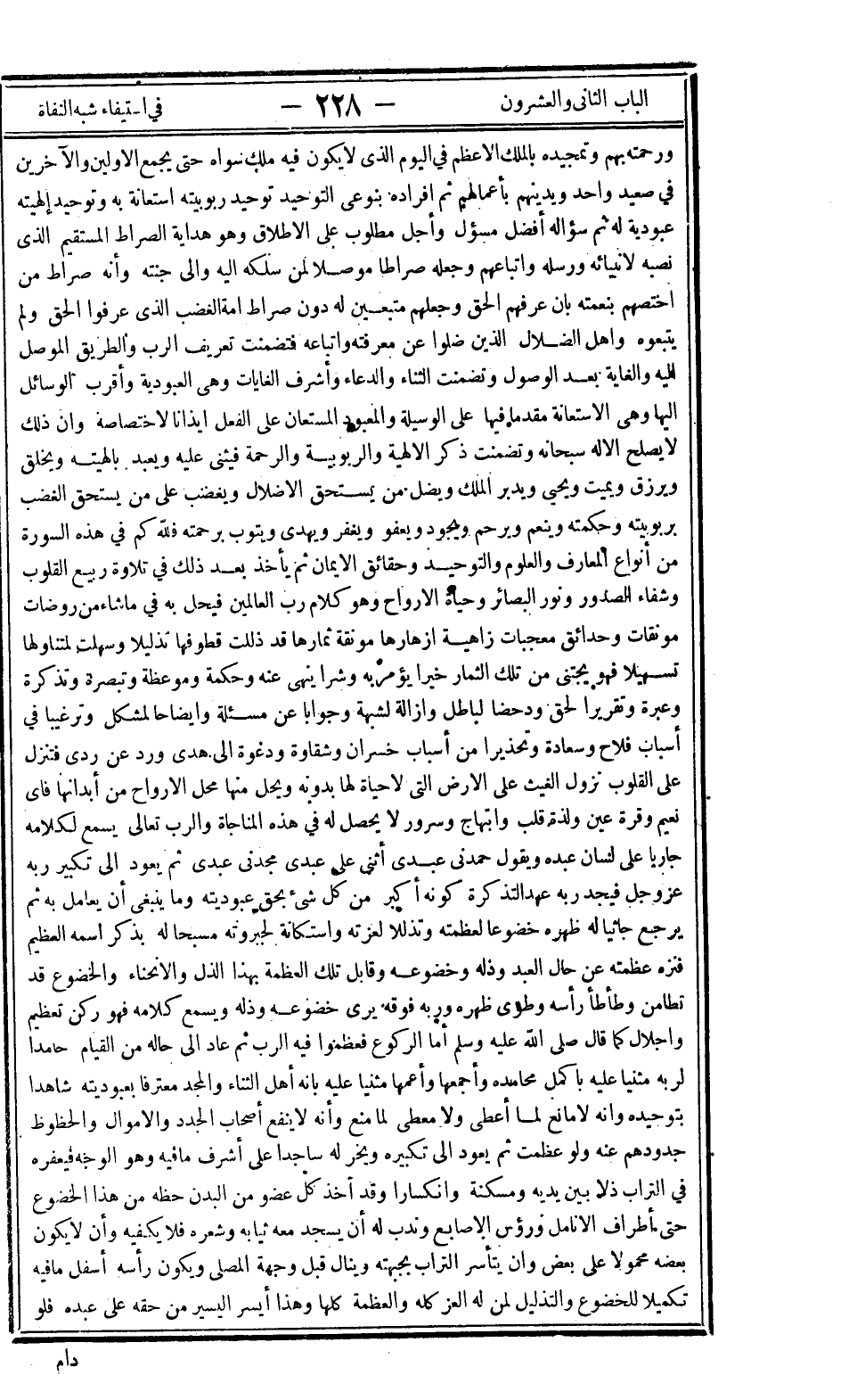 ورحمته بهم وتمجيده بالملك الأعظم في اليوم الذي لا يكون فيه ملك سواه حتى يجمع الأولين والآخرين في صعيد واحد ويدينهم بأعمالهم ثم إفراده بنوعي التوحيد توحيد ربوبيته استعانة به وتوحيد إلهيته عبودية له ثم سؤاله أفضل مسئول وأجل مطلوب على الإطلاق وهو هداية الصراط المستقيم الذي نصبه لأنبيائه ورسله وأتباعهم وجعله صراطا موصلا لمن سلكه إليه وإلى جنته وأنه صراط من اختصهم بنعمته بأن عرفهم الحق وجعلهم متبعين له دون صراط أمة الغضب الذي عرفوا الحق ولم يتبعوه وأهل الضلال الذين ضلوا عن معرفته واتّباعه فتضمنت تعريف الرب والطريق الموصل إليه والغاية بعد الوصول وتضمنت الثناء والدعاء وأشرف الغايات وهي العبودية وأقرب الوسائل إليها وهي الاستعانة مقدما فيها على الوسيلة والمعبود المستعان على الفعل إيذانا لاختصاصه وإن ذلك لا يصلح إلا له سبحانه وتضمنت ذكر الإلهية والربوبية والرحمة فيثنى عليه ويعبد بإلهيته ويخلق ويرزق ويميت ويحيى ويدبر الملك ويضل من يستحق الإضلال ويغضب على من يستحق الغضب بربوبيته وحكمته وينعم ويرحم ويجود ويعفو ويغفر ويهدي ويتوب برحمته فلله كم في هذه السورة من أنواع المعارف والعلوم والتوحيد وحقائق الإيمان ثم يأخذ بعد ذلك في تلاوة ربيع القلوب وشفاء الصدور ونور البصائر وحياة الأرواح وهو كلام رب العالمين فيحل به في ما شاء من روضات مونقات وحدائق معجبات زاهية أزهارها مونقة ثمارها قد ذللت قطوفها تذليلا وسهلت لمتناولها تسهيلا فهو يجتني من تلك الثمار خيرا يؤمر به وشرا ينهى عنه وحكمة وموعظة وتبصرة وتذكرة وعبرة وتقريرا لحق ودحضا لباطل وإزالة لشبهة وجوابا عن مسألة وإيضاحا لمشكل وترغيبا في أسباب فلاح وسعادة وتحذيرا من أسباب خسران وشقاوة ودعوة إلى هدى ورد عن ردي فتنزل على القلوب نزول الغيث على الأرض التي لا حياة لها بدونه ويحل منها محل الأرواح من أبدانها فأي نعيم وقرة عين ولذة قلب وابتهاج وسرور لا يحصل له في هذه المناجاة والرب تعالى يسمع لكلامه جاريا على لسان عبده ويقول حمدني عبدي أثنى علي عبدي مجدني عبدي ثم يعود إلى تكبير ربه عز وجل فيجد ربه عهد التذكرة كونه أكبر من كل شيء بحق عبوديته وما ينبغي أن يعامل به ثم يرجع جاثيا له ظهره خضوعا لعظمته وتذللا لعزته واستكانة لجبروته مسبحا له بذكر اسمه العظيم فنزه عظمته عن حال العبد وذله وخضوعه وقابل تلك العظمة بهذا الذل والانحناء والخضوع قد تطامن وطأطأ رأسه وطوى ظهره وربه فوقه يرى خضوعه وذله ويسمع كلامه فهو ركن تعظيم وإجلال كما قال صلى الله عليه وسلم: "أما الركوع فعظموا فيه الرب" ثم عاد إلى حاله من القيام حامدا لربه مثنيا عليه بأكمل محامده وأجمعها وأعمها مثنيا عليه بأنه أهل الثناء والمجد ومعترفا بعبوديته شاهدا بتوحيده وأنه لا مانع لما أعطى ولا معطي لما منع وأنه لا ينفع أصحاب الجدد والأموال والحظوظ جدودهم عنه ولو عظمت ثم يعود إلى تكبيره ويخر له ساجدا على أشرف ما فيه وهو الوجه فيعفره في التراب ذلا بين يديه ومسكنه وانكسارا وقد أخذ كل عضو من البدن حظه من هذا الخضوع حتى أطراف الأنامل ورؤوس الأصابع وندب له أن يسجد معه ثيابه وشعره فلا يكفيه وأن لا يكون بعضه محمولا على بعض وأن يتأسر التراب بجبهته وينال قبل وجهة المصلى ويكون رأسه أسفل ما فيه تكميلا للخضوع والتذليل لمن له العز كله والعظمة كلها وهذا أيسر اليسير من حقه على عبده فلو