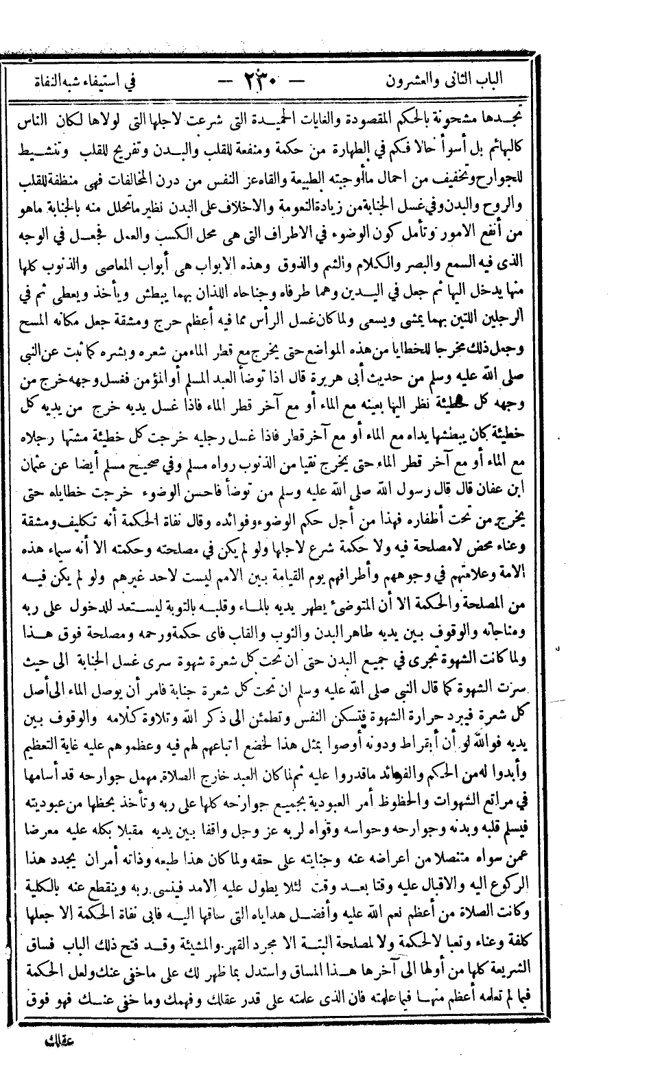 تجدها مشحونة بالحكم المقصودة والغايات الحميدة التي شرعت لأجلها التي لولاها لكان الناس كالبهائم بل أسوأ حالا فكم في الطهارة من حكمة ومنفعة للقلب والبدن وتفريح للقب وتنشيط للجوارح وتخفيف من أحمال ما أوجبته الطبيعة وألقاه عز النفس من درن المخالفات فهي منظفة للقلب والروح والبدن وفي غسل الجنابة من زيادة النعومة والإخلاف على البدن نظير ما تحلل منه بالجنابة ما هو من أنفع الأمور وتأمل كون الوضوء في الأطراف التي هي محل الكسب والعمل فجعل في الوجه الذي فيه السمع والبصر والكلام والشم والذوق وهذه الأبواب هي أبواب المعاصي والذنوب كلها منها يدخل إليها ثم جعل في اليدين وهما طرفاه وجناحاه اللذان بهما يبطش ويأخذ ويعطي ثم في الرجلين اللتين بهما يمشي ويسعى ولما كان غسل الرأس مما فيه أعظم حرج ومشقة جعل مكانه المسح وجعل ذلك مخرجا للخطايا من هذه المواضع حتى يخرج مع قطر الماء من شعره وبشره كما ثبت عن النبي صلى الله عليه وسلم من حديث أبي هريرة قال: "إذا توضأ العبد المسلم أو المؤمن فغسل وجهه خرج من وجهه كل خطيئة نظر إليها بعينه مع الماء أو مع آخر قطر الماء فإذا غسل يديه خرج من يديه كل خطيئة كان يبطشها يداه مع الماء أو مع آخر قطر فإذا غسل رجليه خرجت كل خطيئة مشتها رجلاه مع الماء أو مع آخر قطر الماء حتى يخرج نقيا من الذنوب" رواه مسلم وفي صحيح مسلم أيضا عن عثمان بن عفان قال قال رسول الله صلى الله عليه وسلم: "من توضأ فأحسن الوضوء خرجت خطاياه حتى يخرج من تحت أظفاره" فهذا من أجل حكم الوضوء وفوائده وقال نفاة الحكمة أنه تكليف ومشقة وعناء محض لا مصلحة فيه ولا حكمة شرع لأجلها ولو لم يكن في مصلحته وحكمته إلا أنه سيماء هذه الأمة وعلامتهم في وجوههم وأطرافهم يوم القيامة بين الأمم ليست لأحد غيرهم ولو لم يكن فيه من المصلحة والحكمة إلا أن المتوضئ يطهر يديه بالماء وقلبه بالتوبة ليستعد للدخول على ربه ومناجاته والوقوف بين يديه طاهر البدن والثوب والقلب فأي حكمة ورحمة ومصلحة فوق هذا ولما كانت الشهوة تجري في جميع البدن حتى أن تحت كل شعرة شهوة سرى غسل الجنابة إلى حيث سرت الشهوة كما قال النبي صلى الله عليه وسلم: "إن تحت كل شعرة جنابة" فأمر أن يوصل الماء إلى أصل كل شعرة فيبرد حرارة الشهوة فتسكن النفس وتطمئن إلى ذكر الله وتلاوة كلامه والوقوف بين يديه فوالله لو أن أبقراط ودونه أوصوا بمثل هذا لخضع أتباعهم لهم فيه وعظموهم عليه غاية التعظيم وأبدوا له من الحكم والفوائد ما قدروا عليه ثم لما كان العبد خارج الصلاة مهمل جوارحه قد أسامها في مراتع الشهوات والحظوظ أمر العبودية بجميع جوارحه كلها على ربه بحظها من عبوديته فيسلم قلبه وبدنه وجوارحه وحواسه وقواه لربه عز وجل واقفا بين مقبلا بكله عليه معرضا عمن سواه متنصلا من إعراضه عنه وجنايته على حقه ولما كان هذا طبعه وذاته أمران يجدد هذا الركوع إليه والإقبال عليه وقتا بعد وقت لئلا يطول عليه الأمد فينسى ربه وينقطع عنه بالكلية وكانت الصلاة من أعظم نعم الله عليه وأفضل هداياه التي ساقها إليه فأبى نفاة الحكمة إلا جعلها كلفة وعناء وتعبا لا لحكمة ولا لمصلحة البتة إلا مجرد القهر والمشيئة وقد فتح ذلك الباب فساق الشريعة كلها من أولها إلى آخرها هذا المساق واستدل بما ظهر لك على ما خفي عنك ولعل الحكمة فيما لم تعلمه أعظم منها فيما علمته فإن الذي علمته على قدر عقلك وفهمك وما خفي عنك فهو فوق