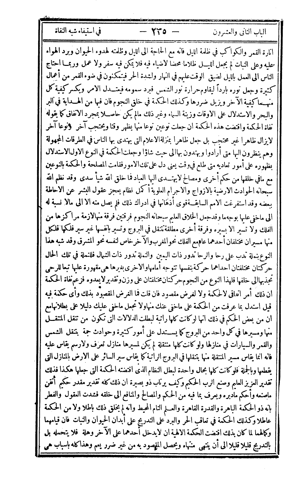إنارة القمر والكواكب في ظلمة الليل فإنه مع الحاجة إلى الليل وظلمته لهدوء الحيوان وبرد الهواء عليه وعلى النبات لم يجعل ظلاما محضا لا ضياء فيه فلا يمكن فيه سفر ولا عمل وربما احتاج الناس إلى العمل بالليل لضيق الوقت عليهم في النهار ولشدة الحر فيتمكنون في ضوء القمر من أعمال كثيرة وجعل نوره باردا ليقاوم حرارة نور الشمس فبرد سمومه فيعتدل الأمر ويكسر كيفية كل منهما كيفية الآخر ويزيل ضررها وكذلك الحكمة في خلق النجوم فإن فيها من الهداية في البر والبحر والاستدلال على الأوقات وزينة السماء وغير ذلك ما لم يكن حاصلا بمجرد الاتفاق كما يقوله نفاة الحكمة واقتضت هذه الحكمة أن جعلت نوعين نوعا منها يظهر وقتا ويحتجب آخر ونوعا آخر لا يزال ظاهرا غير محتجب بل جعل ظاهرا بمنزلة الإعلام التي يهتدي بها الناس في الطرقات المجهولة وهم ينظرون إليها متى أرادوا ويهتدون بها إلى حيث شاؤا وجعلت الحكمة في النوع الأول الاستدلال بظهوره على أمور تعاديه متى طلع في وقت يعني دل على تلك الأمور فقامت المصلحة والحكمة بالنوعين مع ما في خلقها من حكم أخرى ومصالح لا يهتدي إليها العباد فما خلق الله شيئا سدى وقد نظم الله سبحانه الحوادث الأرضية بالأزواج والأجرام العلوية أكمل نظام يعجز عقول البشر عن الإحاطة ببعضه وقد استفرغت الأمم السابقة قوى أذهانها في إدراك ذلك فلم يصل منه إلا إلى مالا نسبة له إلى ما خفي عليها بوجه ما وقد جعل الخلاق العليم سبحانه النجوم فرقتين فرقة منها لازمة مراكزها من الفلك ولا تسير إلا بسيره وفرقة أخرى مطلقة تنتقل في البروج وتسير بأنفسها غير سير فلكها فلكل منها مسيران مختلفان أحدهما عام مع الفلك نحو المغرب والآخر خاص لنفسه نحو المشرق وقد شبه هذا النوع بنملة تدب على رحا والرحا تدور ذات اليمين والنملة تدور ذات الشمال فللنملة في تلك الحال حركتان مختلفتان أحداهما حركة بنفسها تتوجه أمامها والأخرى بغيرها هي مقهورة عليها تبعا للرحى تجذبها إلى خلفها فلهذا النوع من النجوم حركتان مختلفتان على وزن وتقدير لا يعدوه فزعم نفاة الحكمة أن ذلك أمر اتفاقي لا لحكمة ولا لغرض مقصود فإن قلت فما الغرض المقصود بذلك وأي حكمة فيه قيل استدل بما عرفت من الحكمة على ما خفي عنك منها ولا تجعل ما خفي عليك دليلا على بطلانها مع أن من بعض الحكم في ذلك أنها لو كانت كلها راتبة لبطلت الدلالات التي تكون من تنقل المتنقل منها ومسيرها في كل واحد من البروج كما يستدل على أمور كثيرة وحوادث جمة بتنقل الشمس والقمر والسيارات في منازلها ولو كانت كلها متنقلة لم يكن لمسيرها منازل تعرف ولا رسم يقاس عليه فإنه إنما يقاس مسير المنتقلة منها بتنقلها في البروج الراتبة كما يقاس سير السائر على الأرض بالمنازل التي يقطعها وبالجملة فلو كانت كلها بحال واحدة لبطل النظام الذي اقتضته الحكمة التي جعلها هكذا فذلك تقدير العزيز العليم وصنع الرب الحكيم وكيف يرتاب ذو بصيرة أن ذلك كله تقدير مقدر حكيم أتقن ما صنعه وأحكم ما دبره ويعرف بما فيه من الحكم والمصالح والمنافع إلى خلقه فشدت العقول والفطر بأنه ذو الحكمة الباهرة والقدرة القاهرة والعلم التام المحيط وأنه لم يخلق ذلك باطلا ولا من الحكمة عاطلا وكذلك الحكمة في تعاقب الحر والبرد على التدريج على أبدان الحيوان والنبات فإن قيامهما وكمالهما لما كان بذلك اقتضت الحكمة الإلهية أن لا يدخل أحدهما على الآخر وهلة فلا يتحمله بل بالتدريج قليلا قليلا إلى أن ينتهي منتهاه ويحصل المقصود به من غير ضرر يعم وهذا كله بأسباب هي